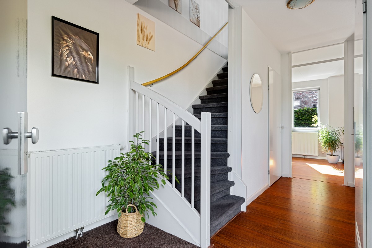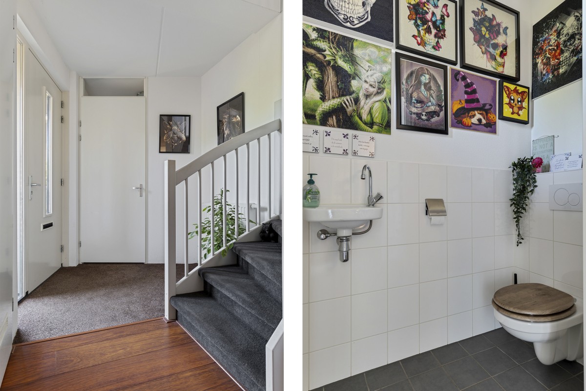 Entree, hal met toegang tot de meterkast met glasvezelaansluiting, 3 fase en stadsverwarming, vrij-hangend toilet met fonteintje, trapkast, trap naar de verdieping en deur naar de woonkamer.