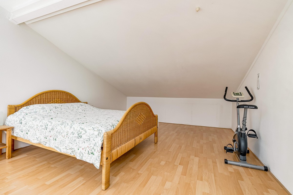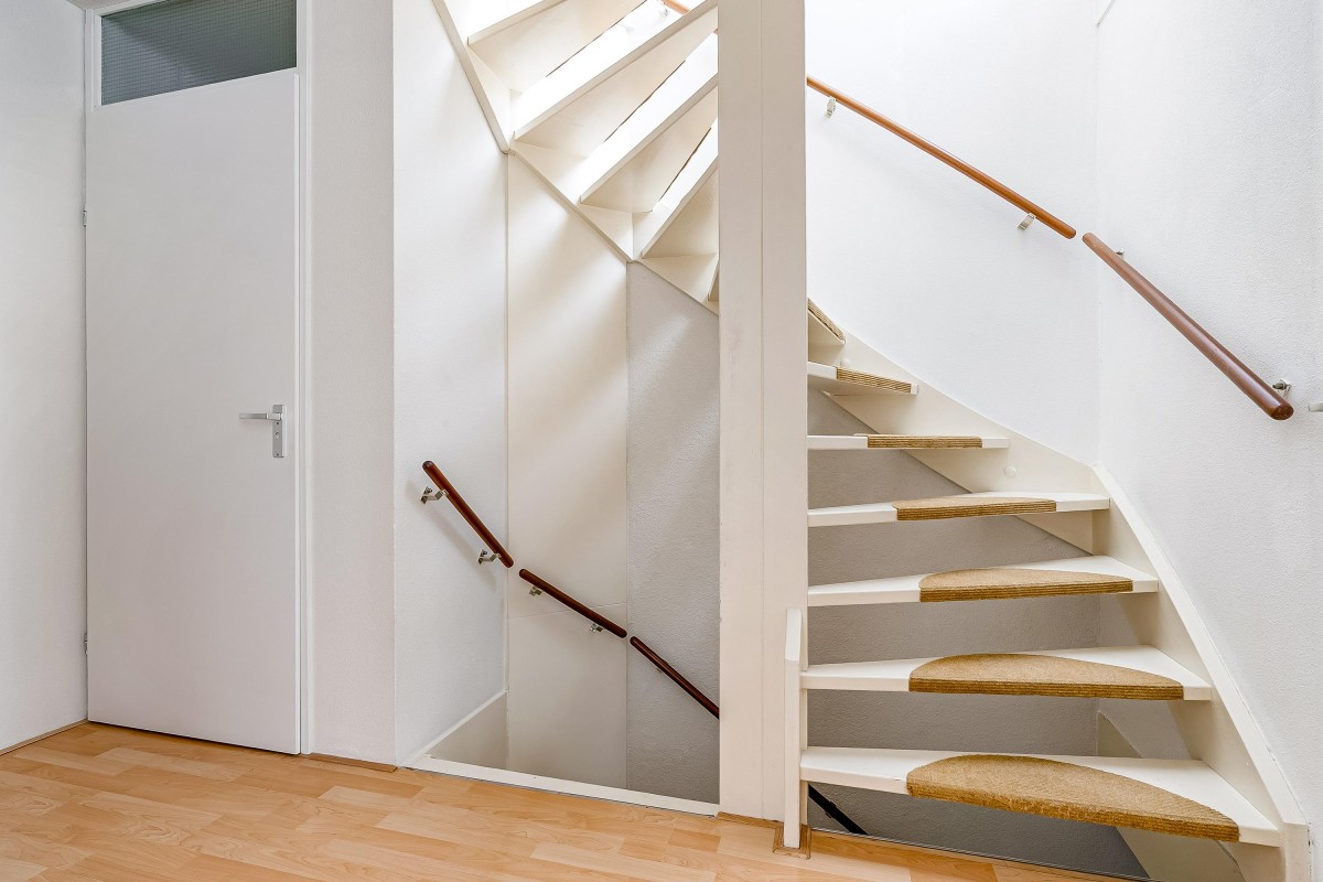 Voorzolder met aansluiting voor wasmachine- en droger en toegang tot de 4e grote, lichte slaapkamer met dakterras. Het dakterras (11 m2) is gelegen op het zuidoosten en heeft vrij uitzicht aan de voorzijde. Door het plaatsen van bijvoorbeeld een dakkapel kan er meer stahoogte worden gecreëerd. Het is dus zeer eenvoudig om op deze verdieping een extra slaapkamers te realiseren. Ook hier is de verdiepingsvloer voorzien van een nette laminaatvloer.