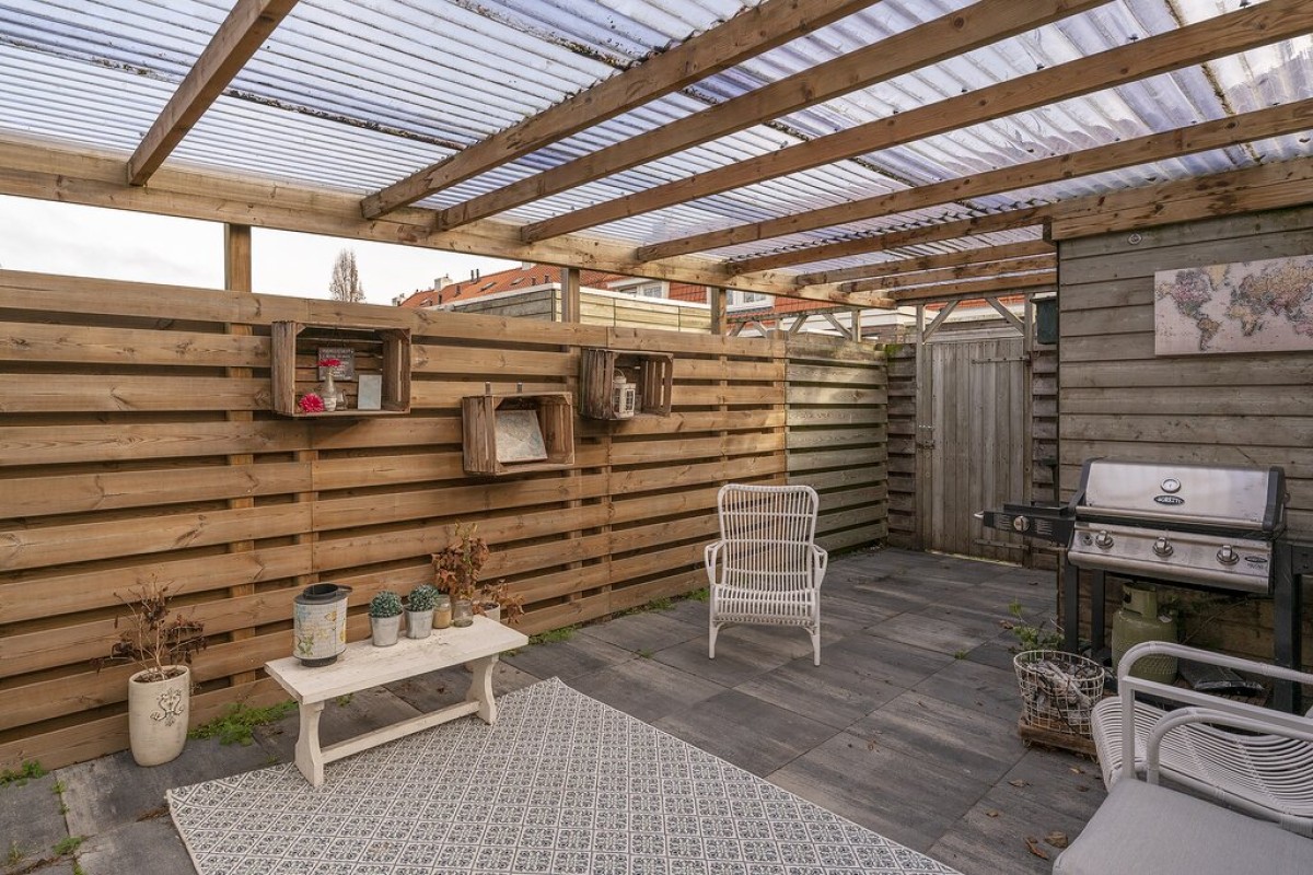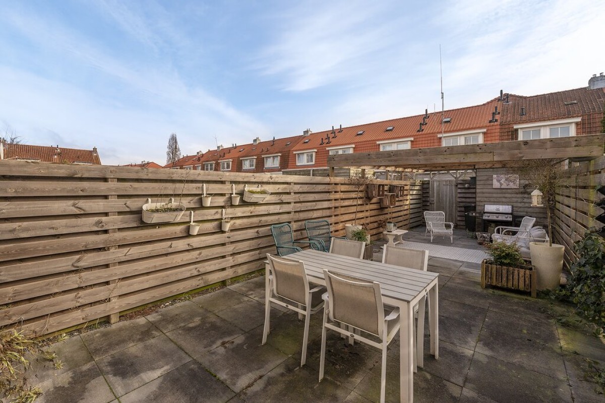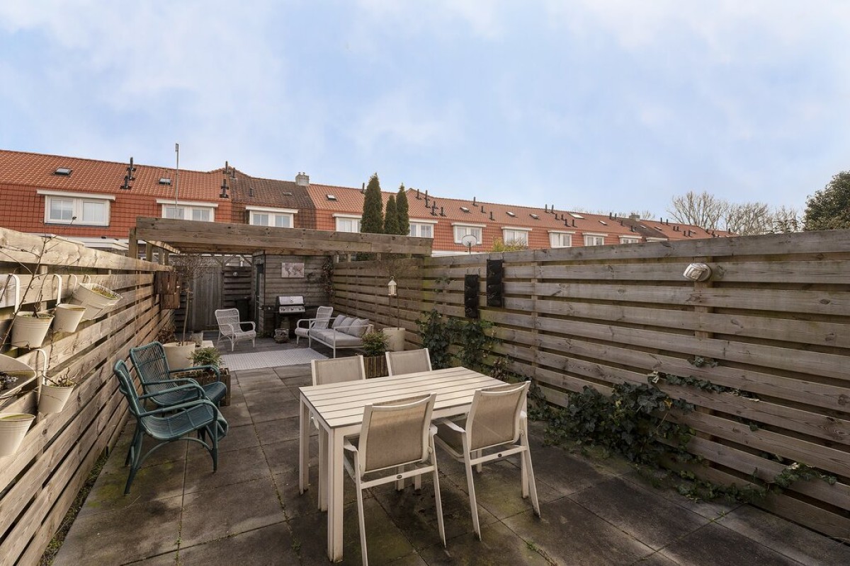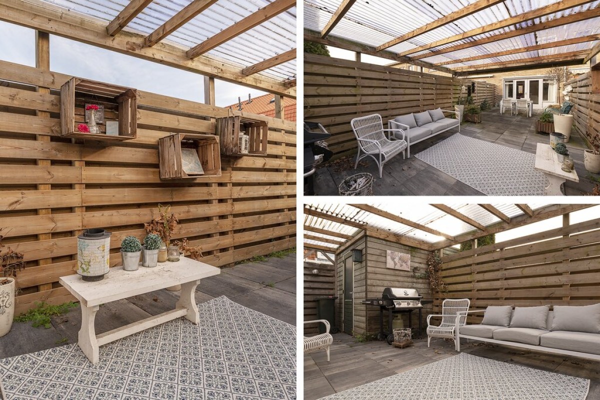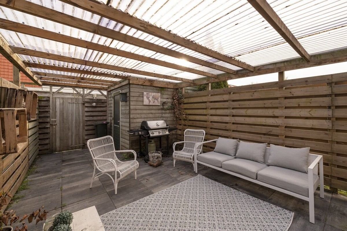 De heerlijke tuin is gelegen op het zuidoosten en is keurig aangelegd met sierbestrating, een terrasoverkapping en een houten berging. Het geheel is eveneens middels een achterom via de poort bereikbaar.