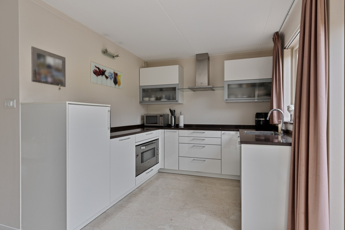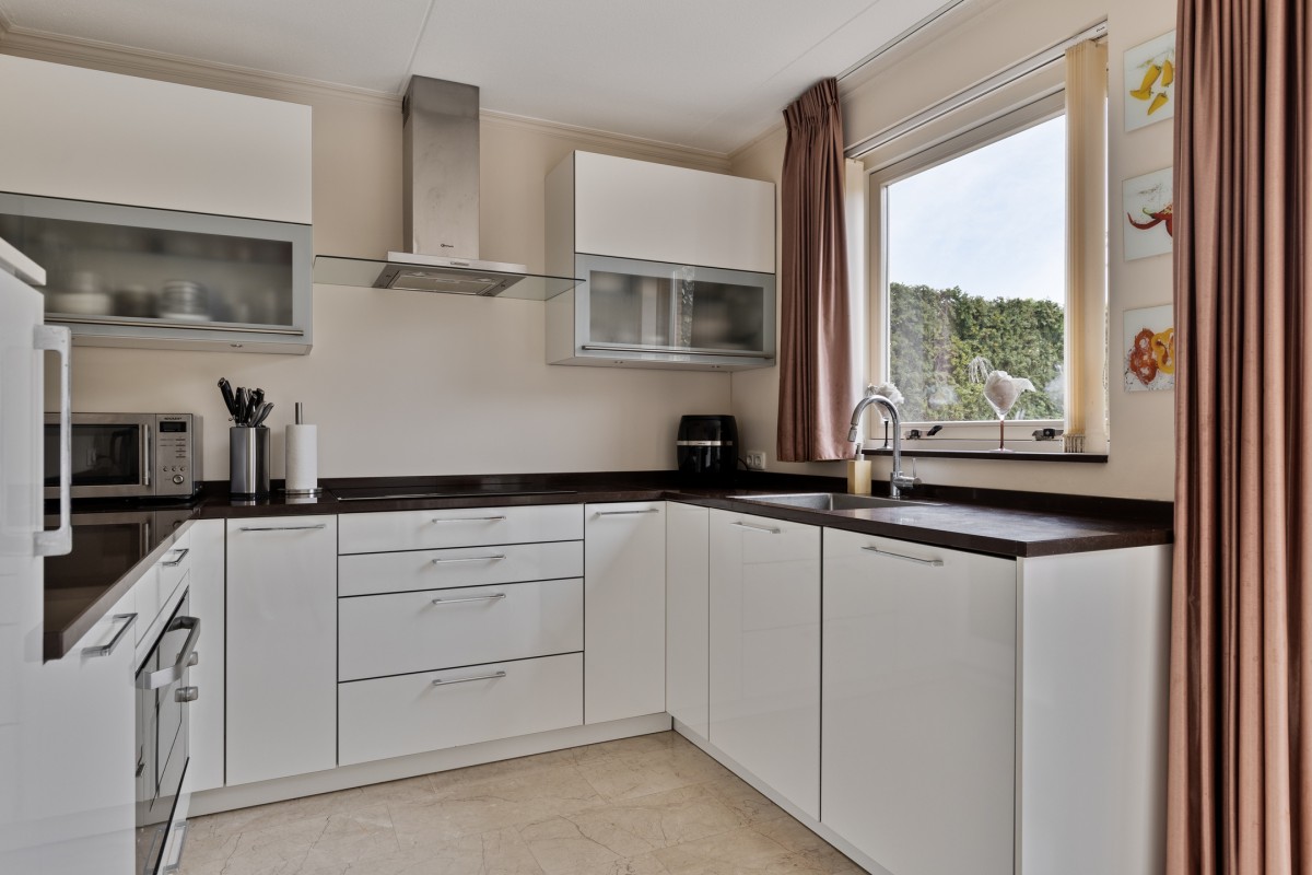 Lees verderDe keuken is aan de achterzijde gesitueerd , geplaatst in een hoekopstelling met de nodige inbouwapparatuur.