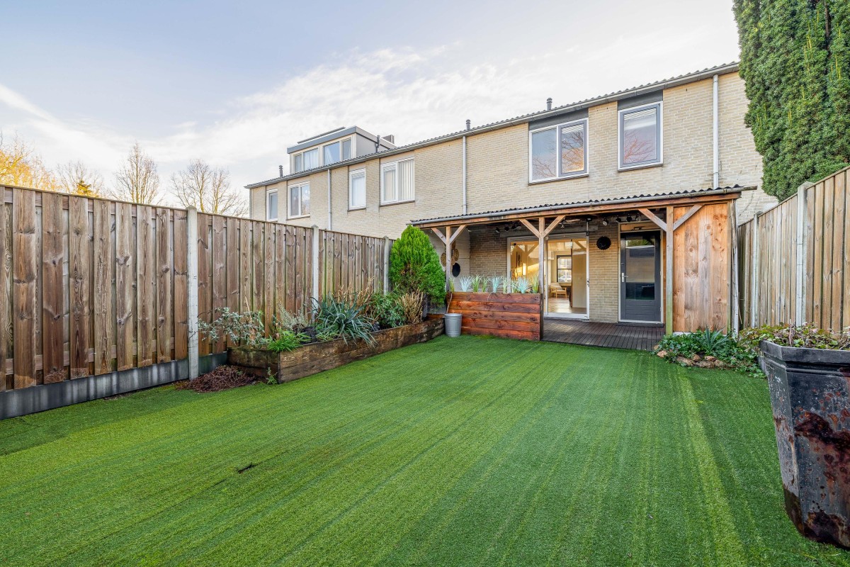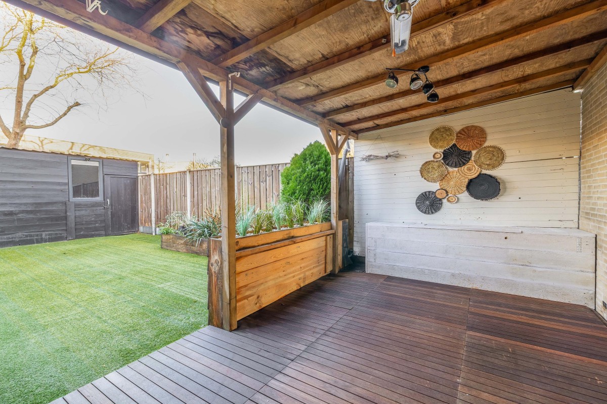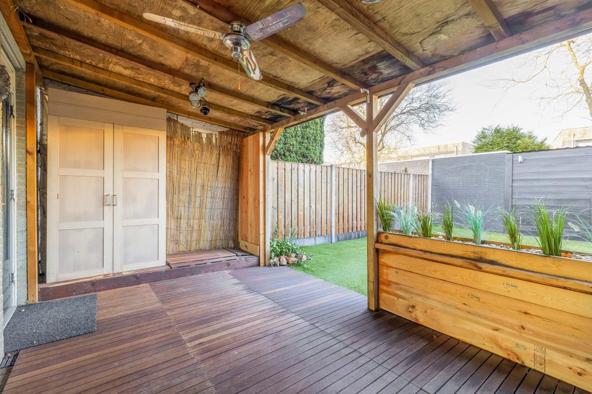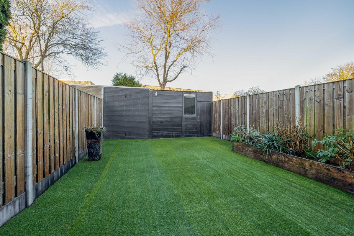 De ruime tuin ligt op het noordoosten en beschikt over een terrasoverkapping, een vrijstaande berging en een achterom.