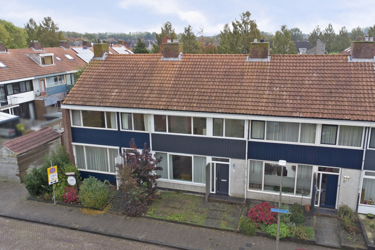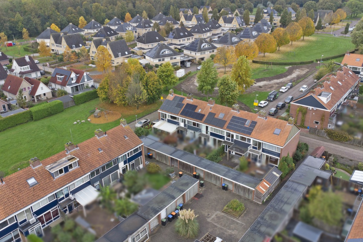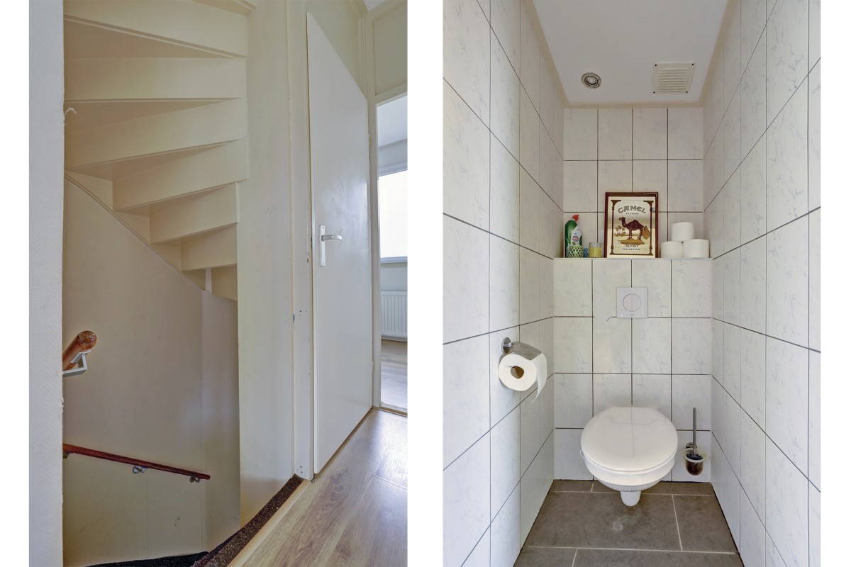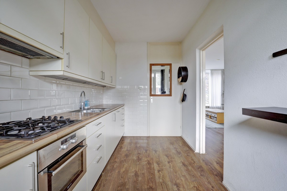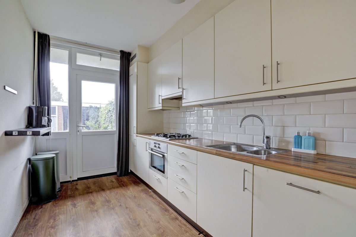 Begane grond: Entree/hal met trapkast, meterkast, toiletruimte met zwevend toilet met fonteintje in lichte kleurstelling, trapkast als provisieruimte, zeer ruime doorzon-woonkamer met laminaatvloer, zithoek aan de voorzijde met vrij uitzicht over groen, ruime eethoek aan de achterzijde met loopdeur naar de tuin. De keuken is voorzien van een ingebouwde gaskookplaat, vlakscherm afzuigkap, koelkast, vriezer, combimagnetron en vaatwasser, deur naar de achtertuin. De op het zuidoosten gelegen achtertuin is voorzien van een zonneterras, borders en zeer grote stenen berging met overkapping en achterom.