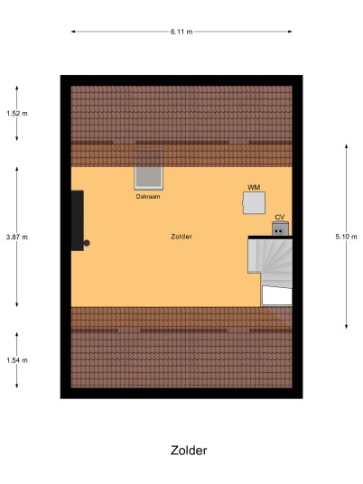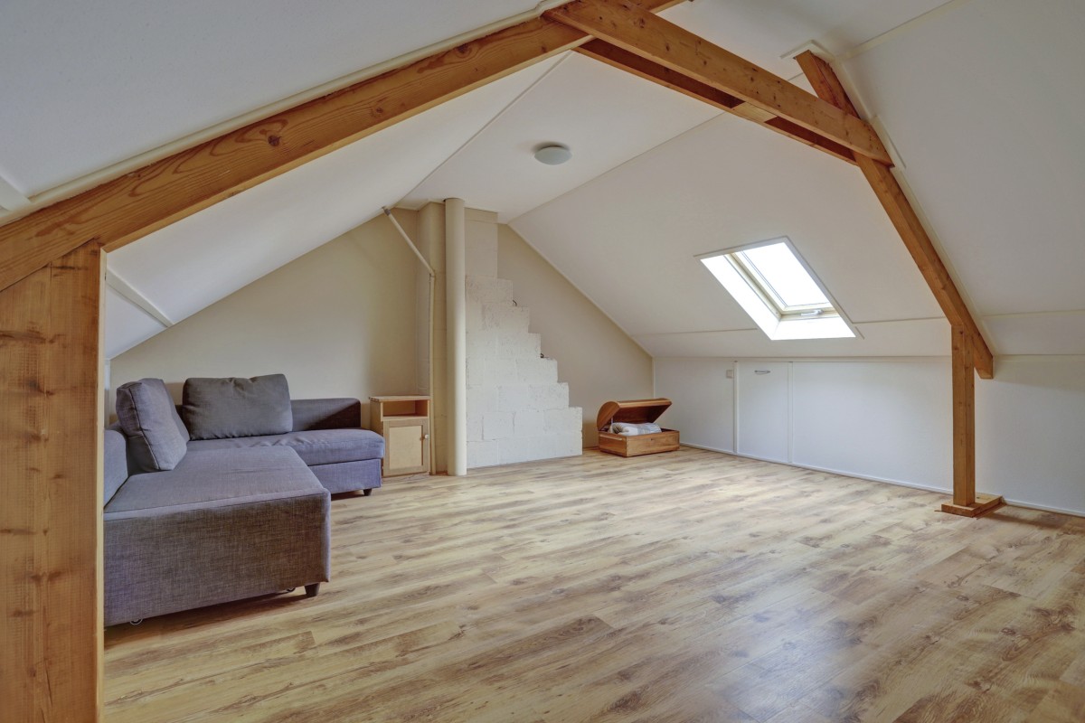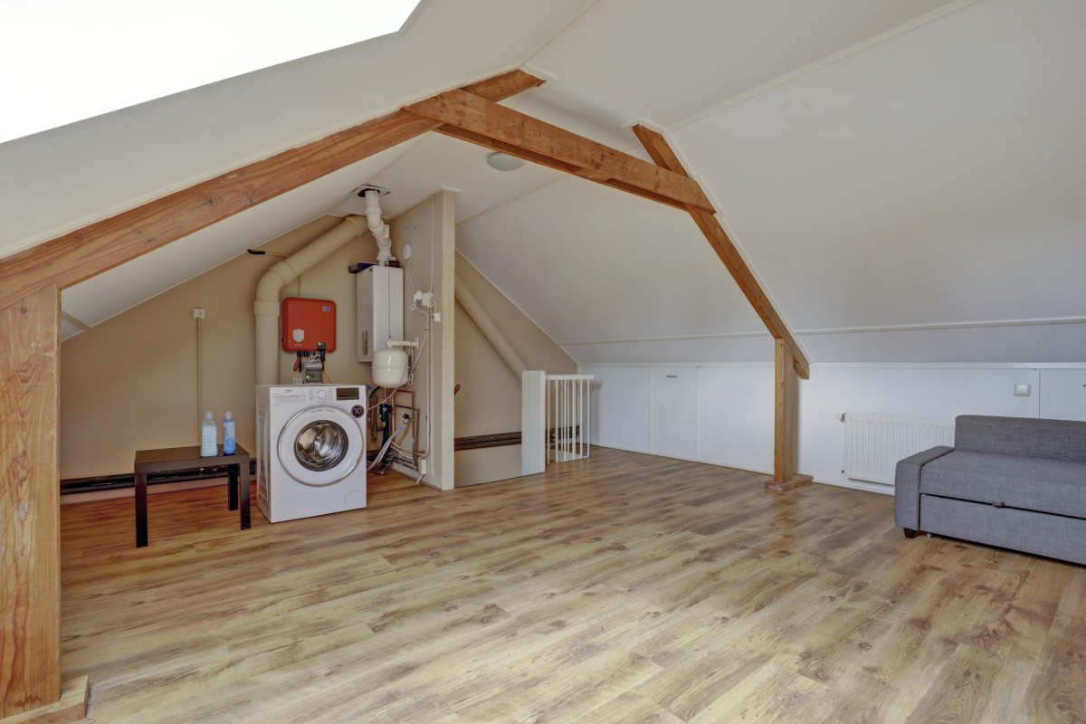 Tweede verdieping: vaste trap naar ruime zolder met c.v.-ketel, wasmachine en droger aansluiting en biedt daarnaast nog veel bergruimte, deze zolderverdieping is mede door het grote dakraam in gebruik als een ruime slaapkamer met laminaatvloer.