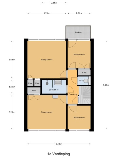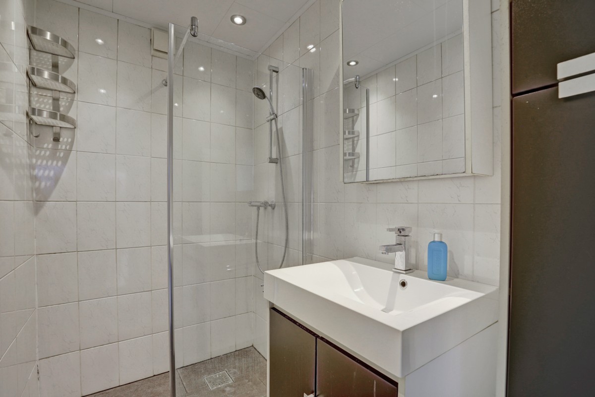Eerste verdieping: overloop, separaat toilet met hangcloset en tegelwerk in lichte kleurstelling, 4 ruime slaapkamers, waarvan 3 met inbouwkast en 1 met balkon. Badkamer in lichte kleurstelling, met inloopdouche, wastafelmeubel en designradiator.