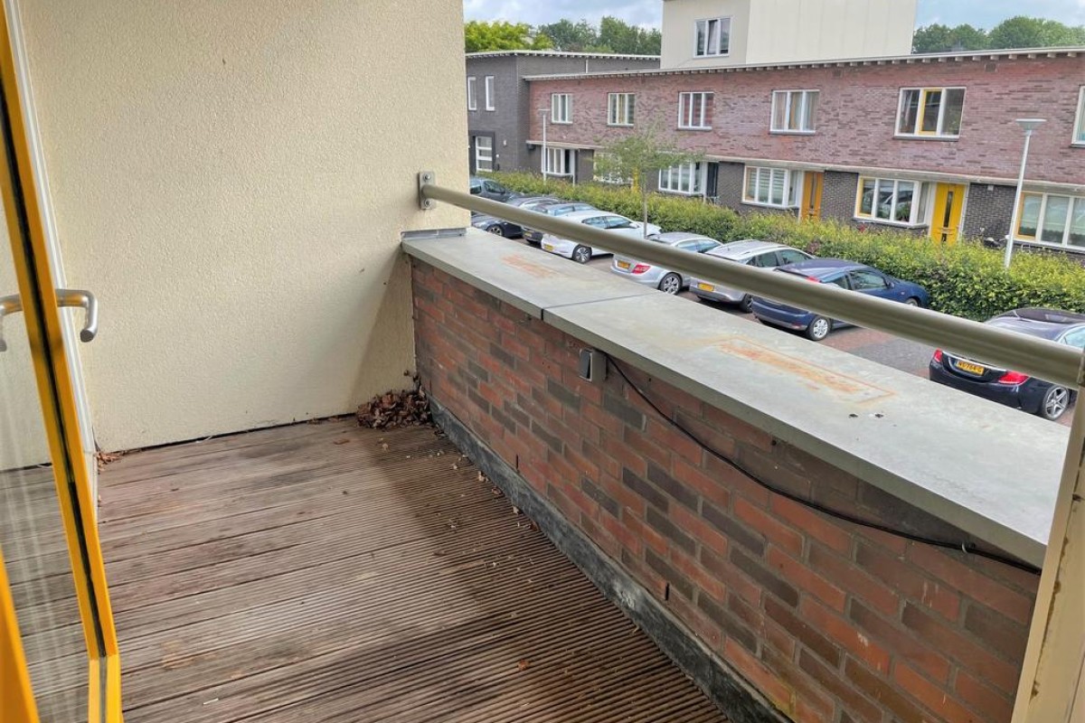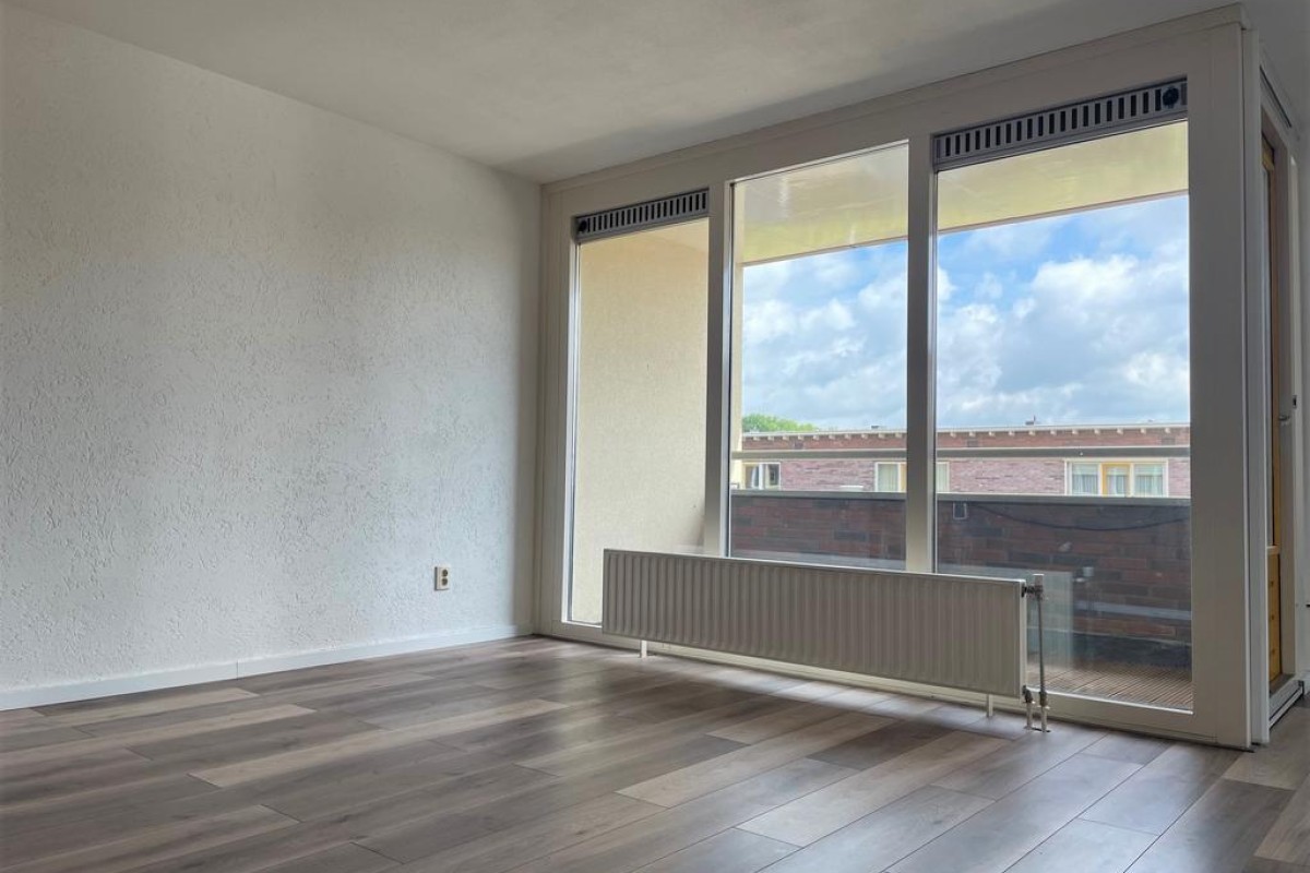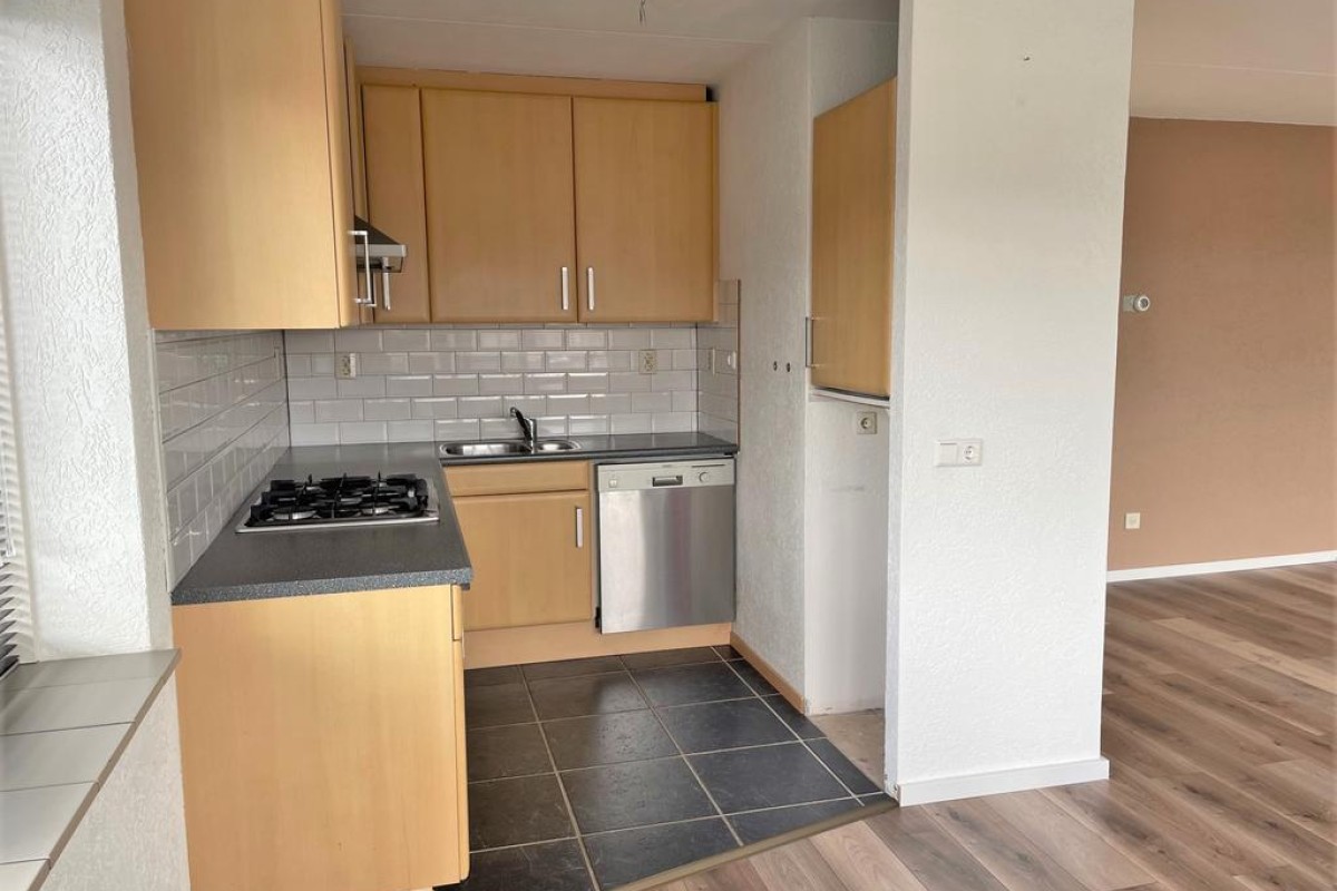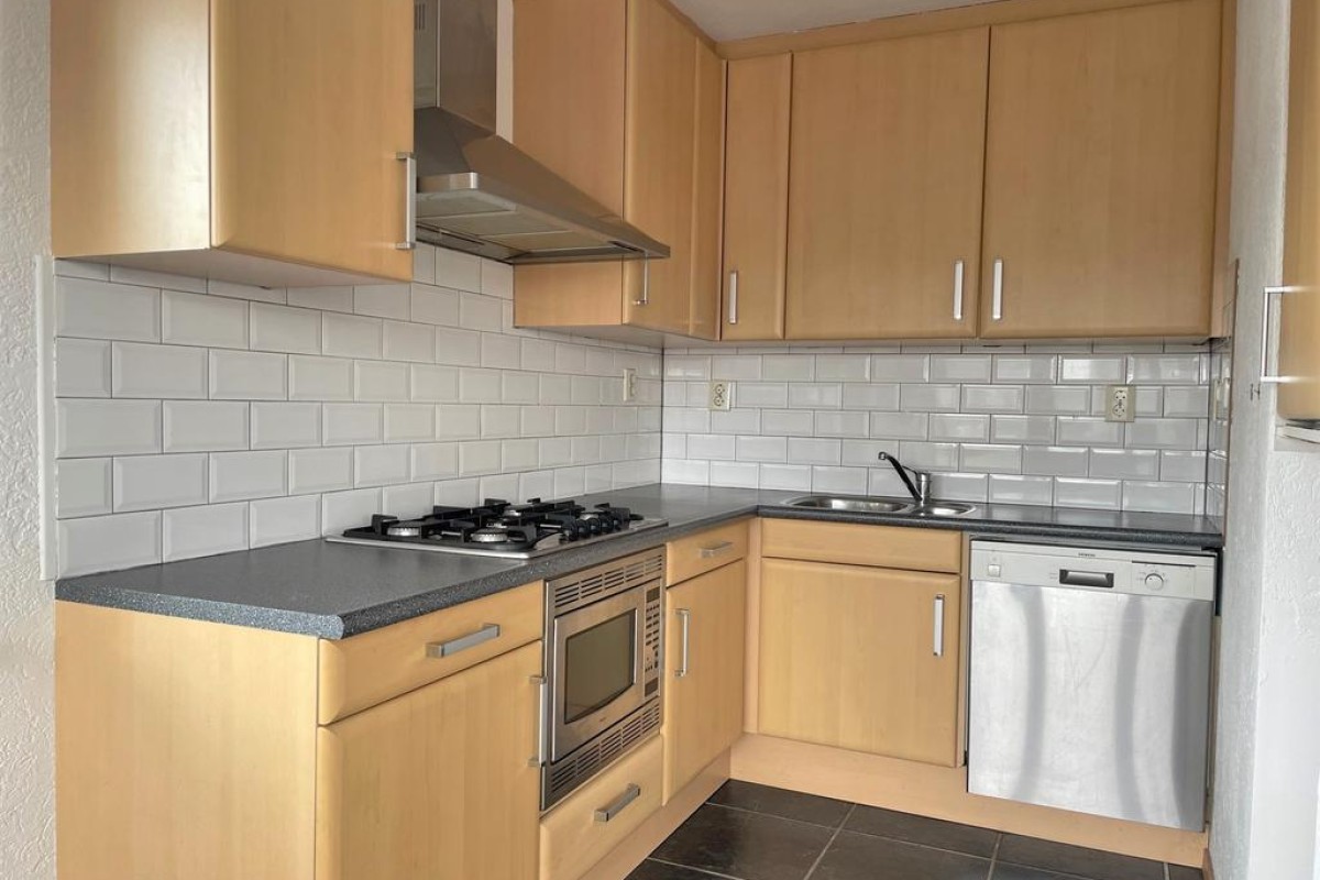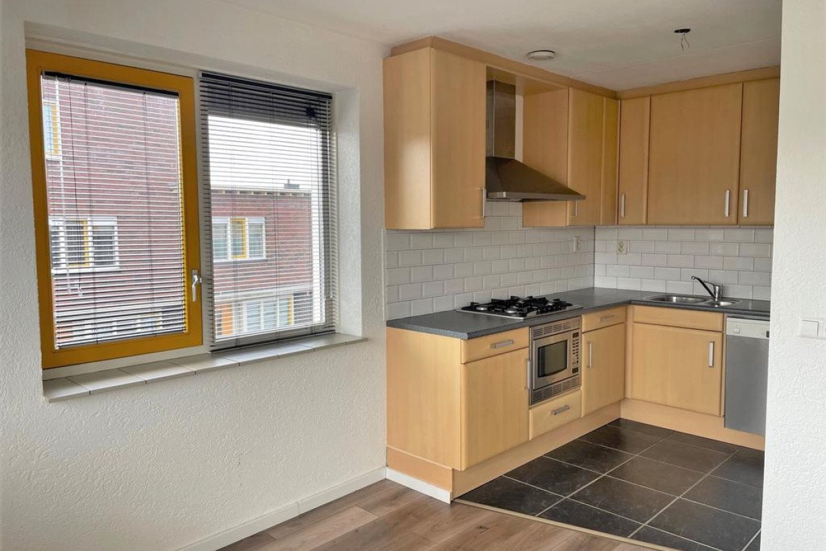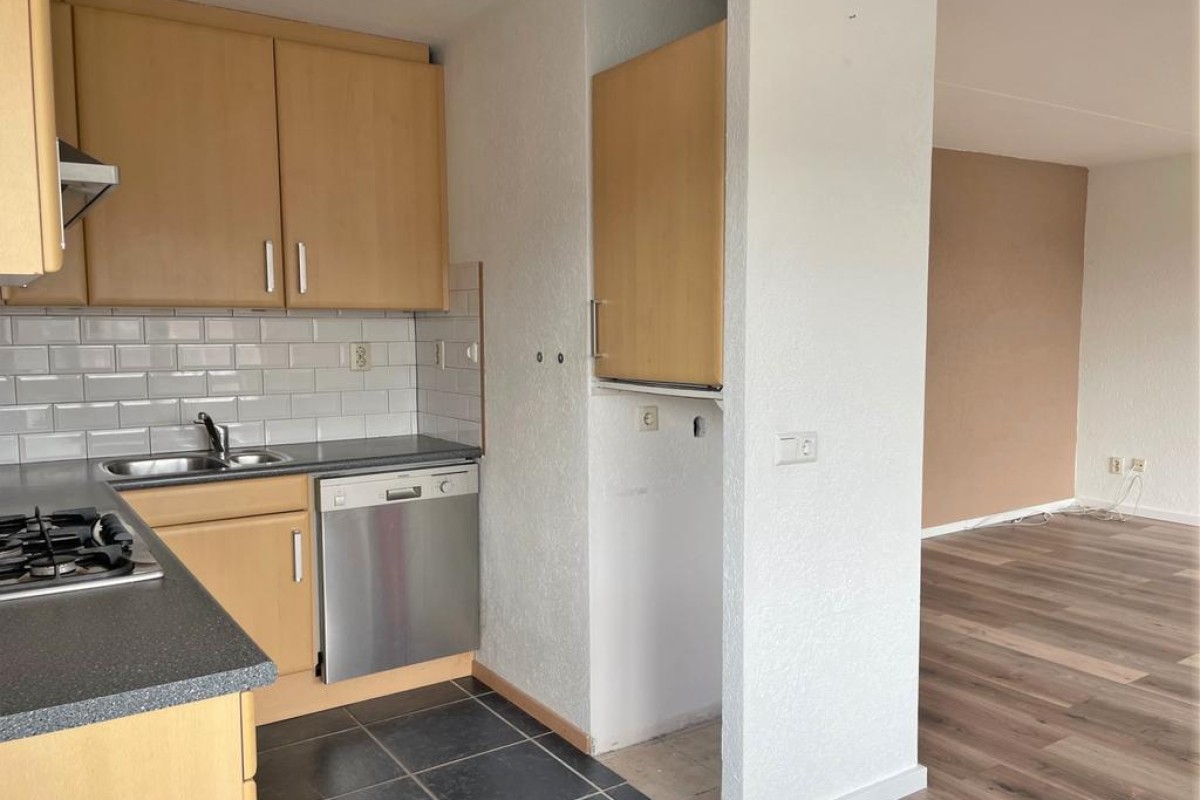 Een praktische provisiekast scheidt de woonkamer van de keuken, hierdoor behoudt de woning de openheid en ontstaan er toch ‘aparte’ ruimtes. De keuken is opgesteld in L-vorm en voorzien van inbouwapparatuu. Het balkon grenst aan de woonkamer en ligt op het noordoosten.