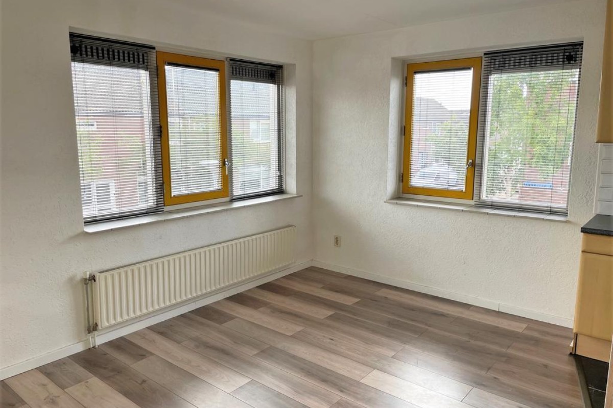 Lees verderOver de gehele breedte van de woon- en eetkamer zijn er ramen alsmede in de zijgevel, wat zorgt voor een grote hoeveelheid licht.