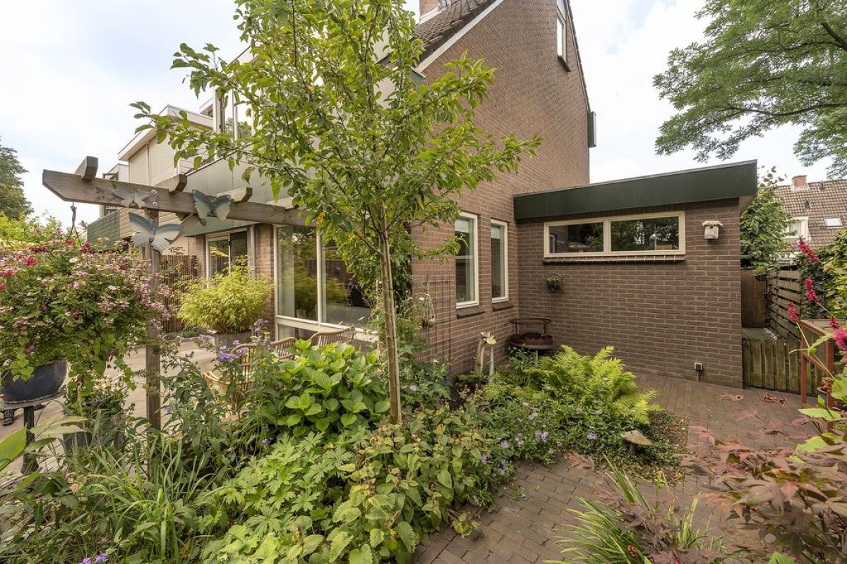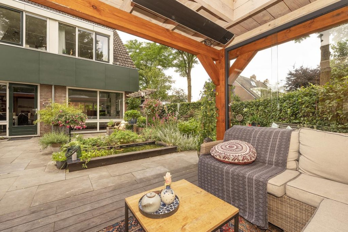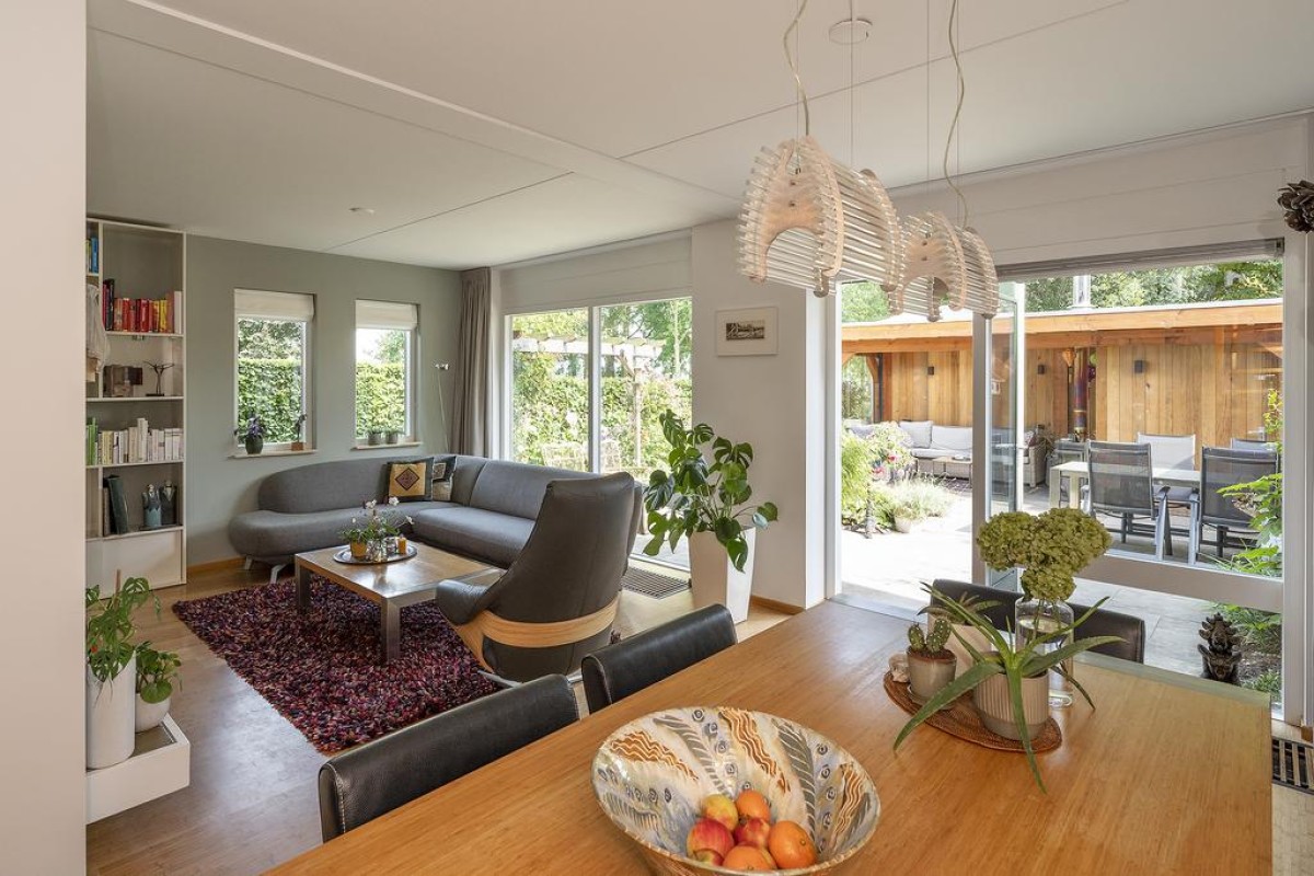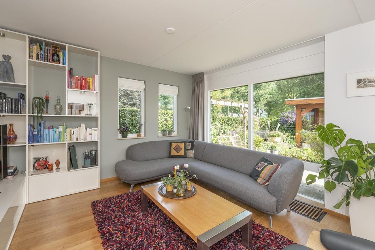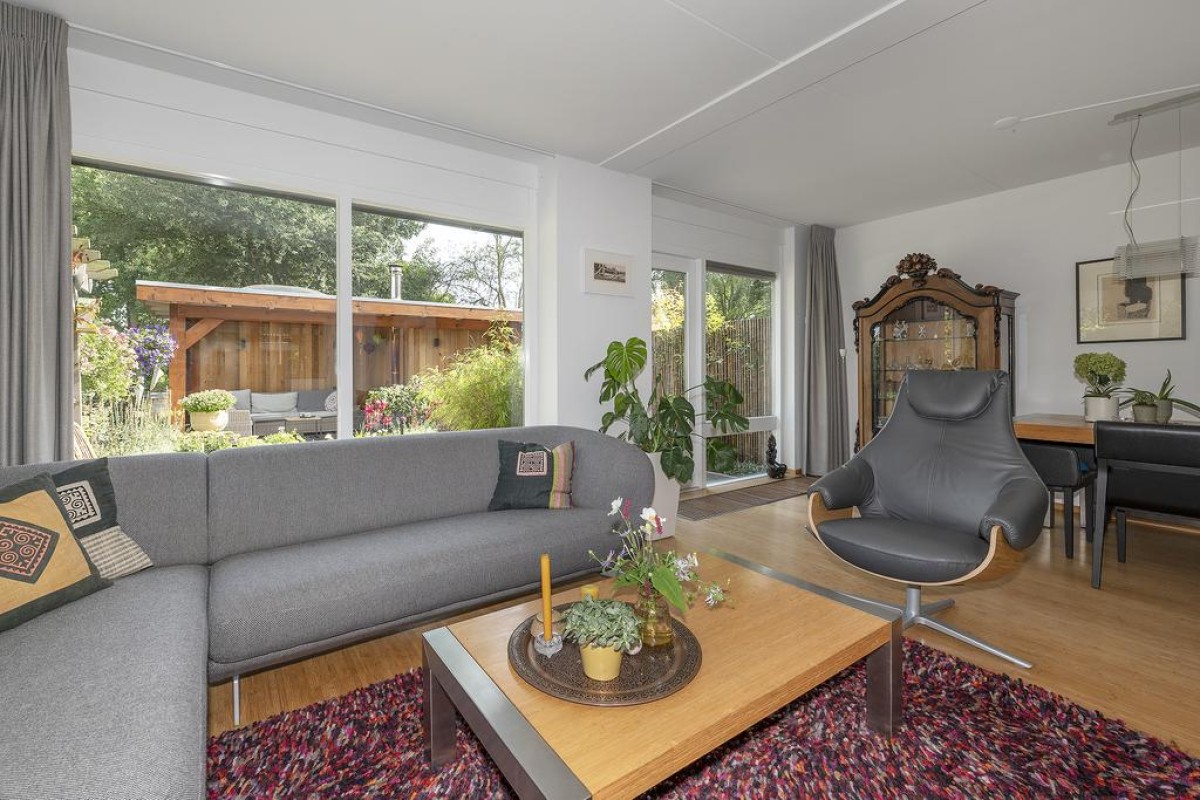 De woonkamer is over de volledige breedte gesitueerd. Hier kunt u genieten van een werkelijk fantastisch uitzicht. De sfeervolle tuin is recent aangelegd en beschikt over een fraaie houten overkapping met aansluitend een extra berging. De aangebouwde garage is later bijgebouwd. Tijdens de bouw is rekening gehouden met de fundering; deze is doorgelegd om eventueel de voorgevel van de woning te kunnen verplaatsen.