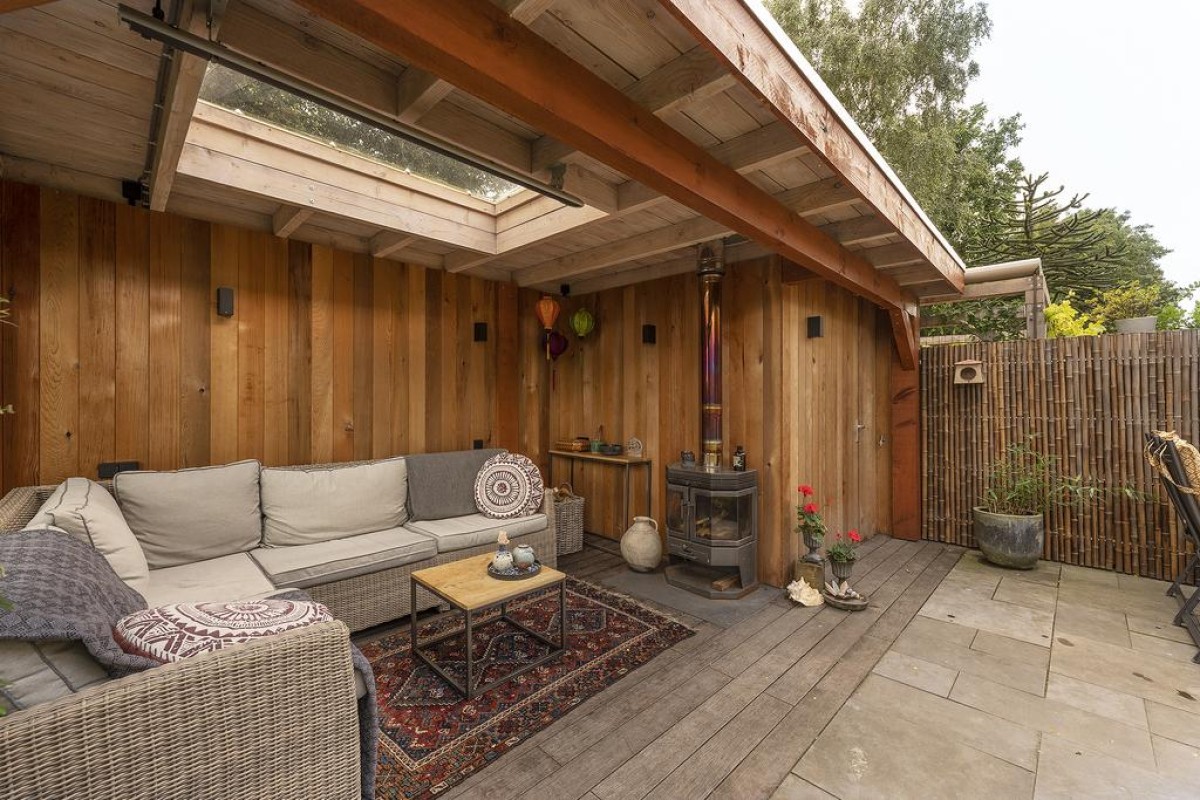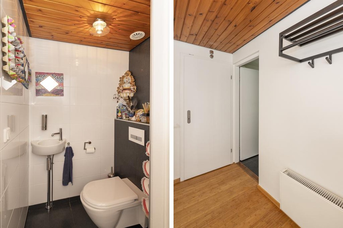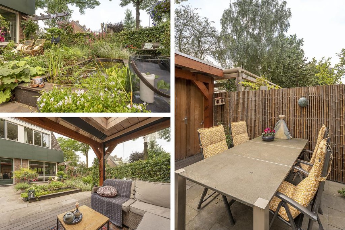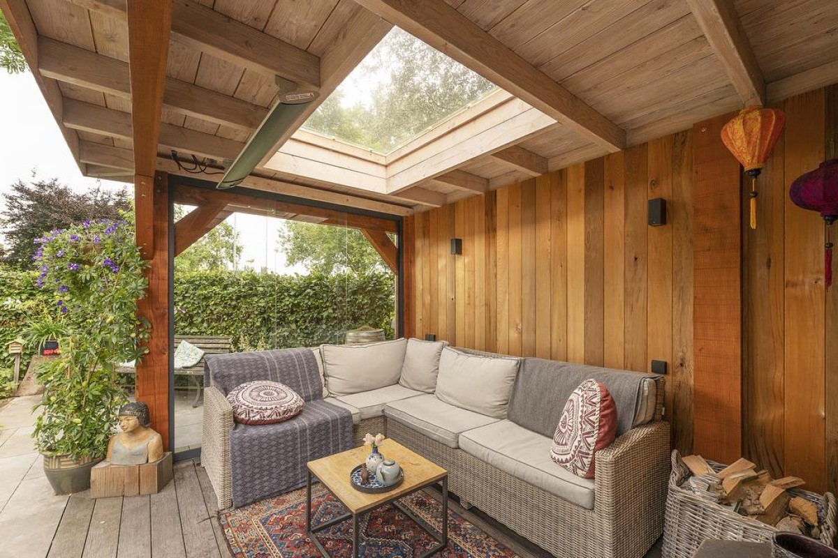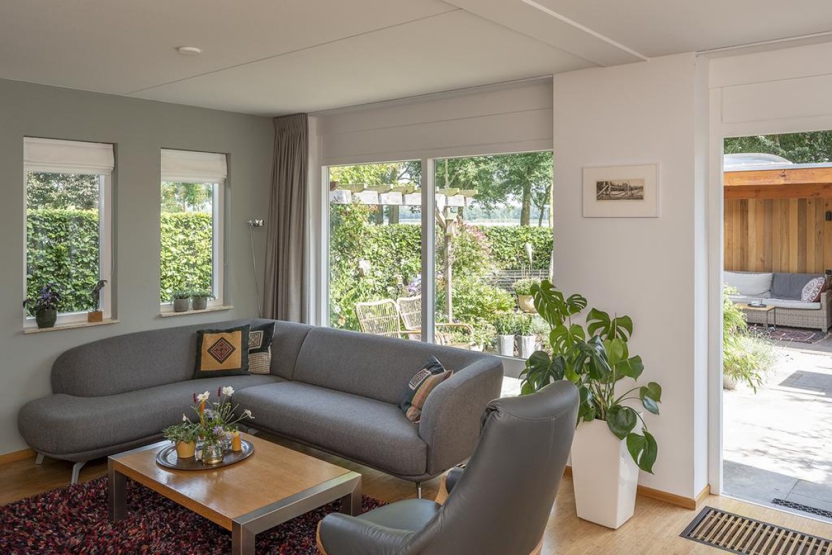 De woonkamer is over de volledige breedte gesitueerd. Hier kunt u genieten van een werkelijk fantastisch uitzicht. De sfeervolle tuin is recent aangelegd en beschikt over een fraaie houten overkapping met aansluitend een extra berging. De aangebouwde garage is later bijgebouwd. Tijdens de bouw is rekening gehouden met de fundering; deze is doorgelegd om eventueel de voorgevel van de woning te kunnen verplaatsen.