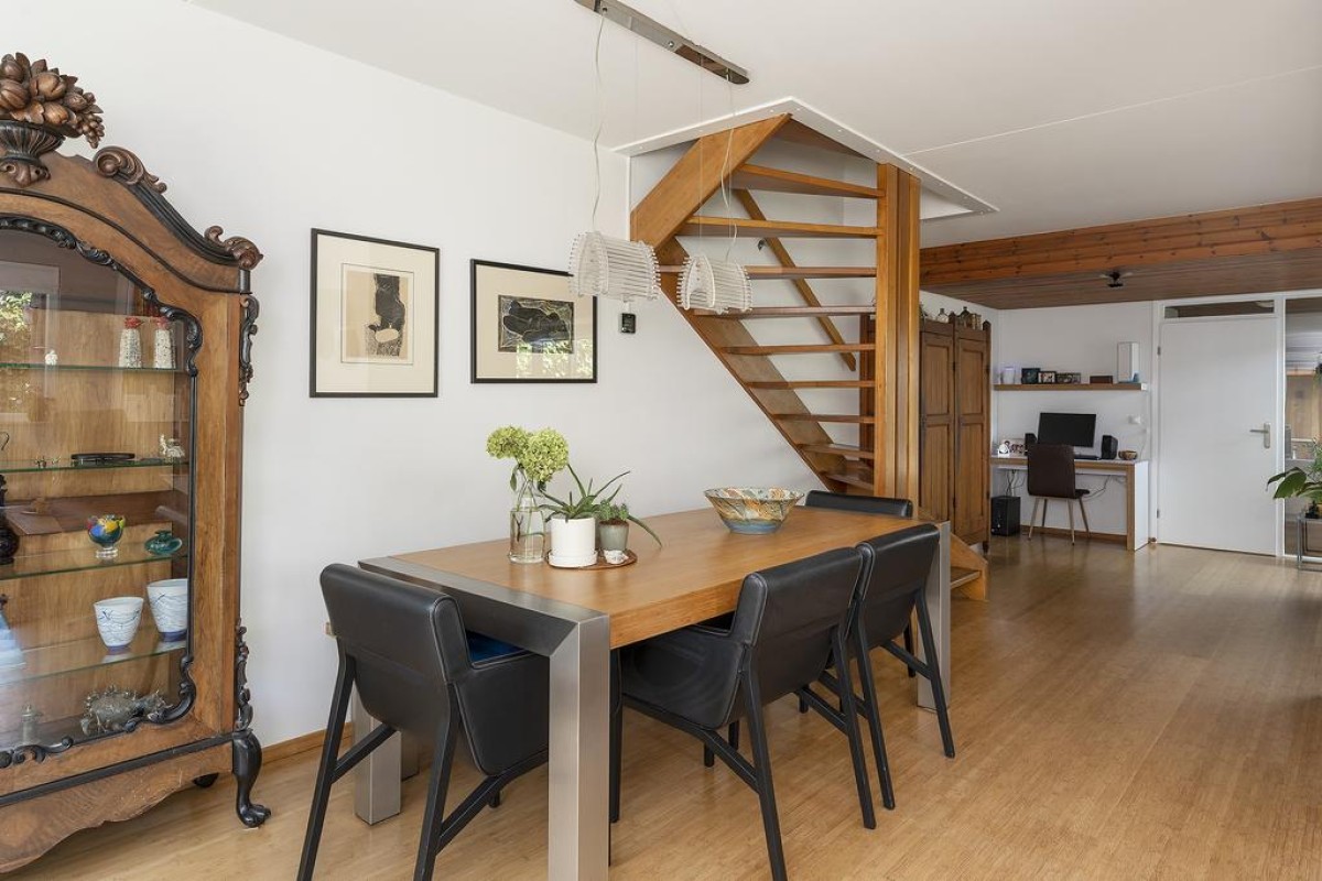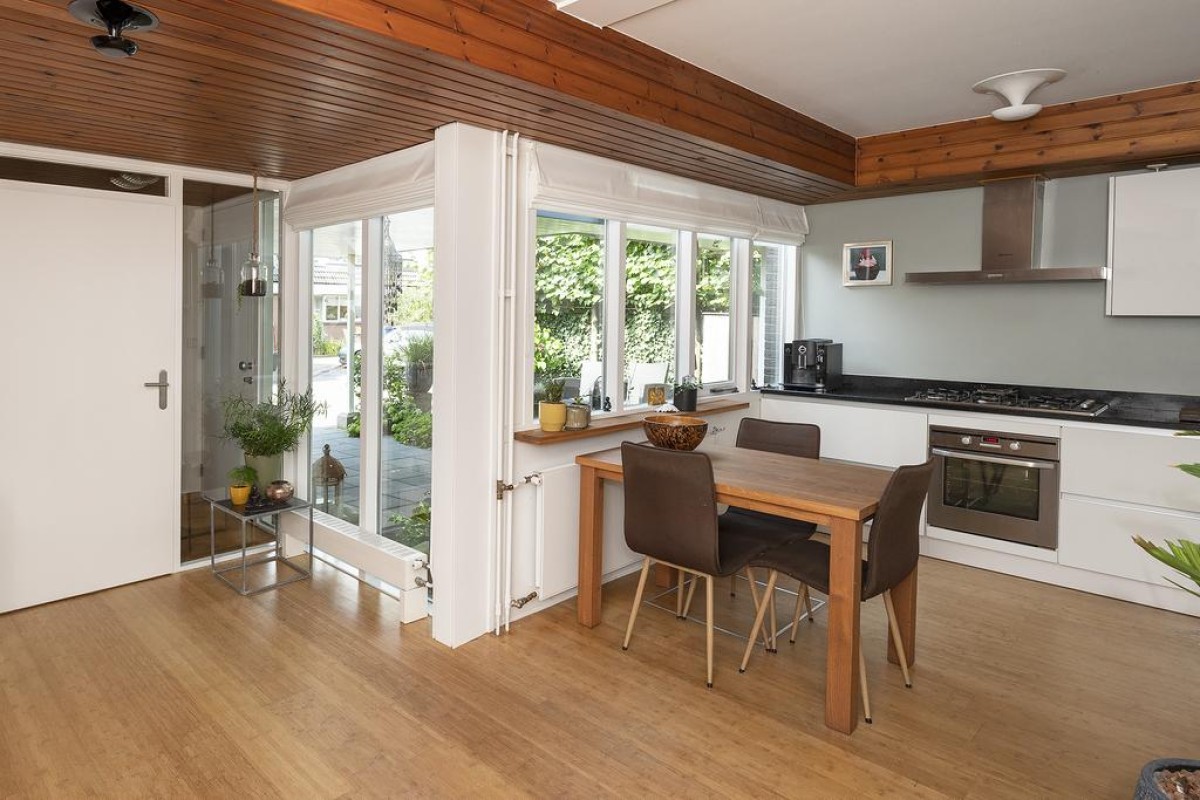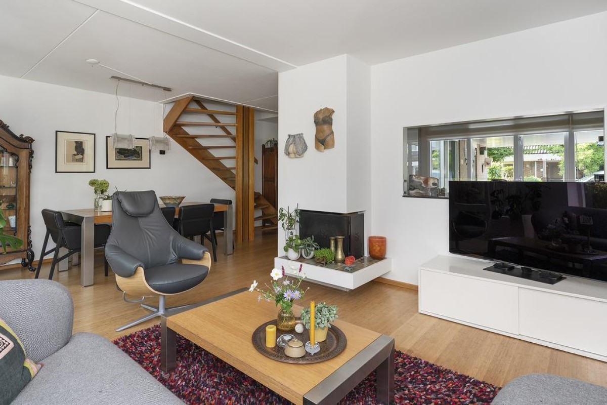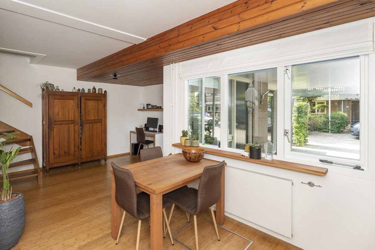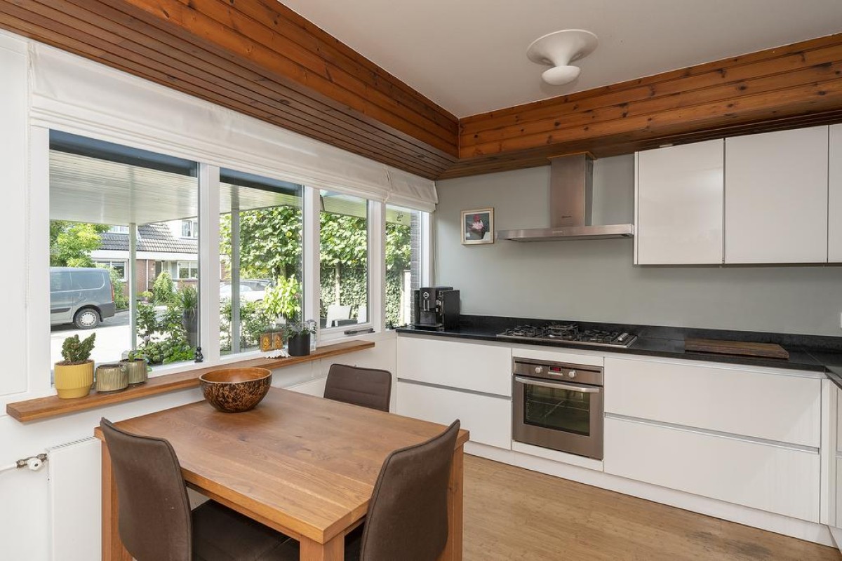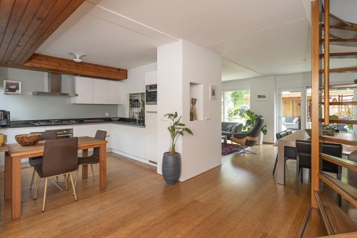 Het huis heeft een speelse en tegelijk praktische indeling. De gehele begane grond heeft recent gestucte wanden. Oorspronkelijke en typische jaren ’70 kenmerken zijn behouden met als resultaat een strakke en moderne woning met een eigen karakter. De keuken is aan de voorzijde van de woning gesitueerd en is voorzien van inbouwapparatuur. De toiletruimte met vrij hangend toilet en de bijkeuken zijn vanuit de entree bereikbaar.
