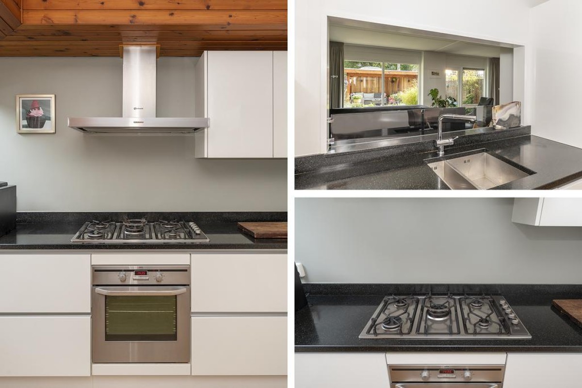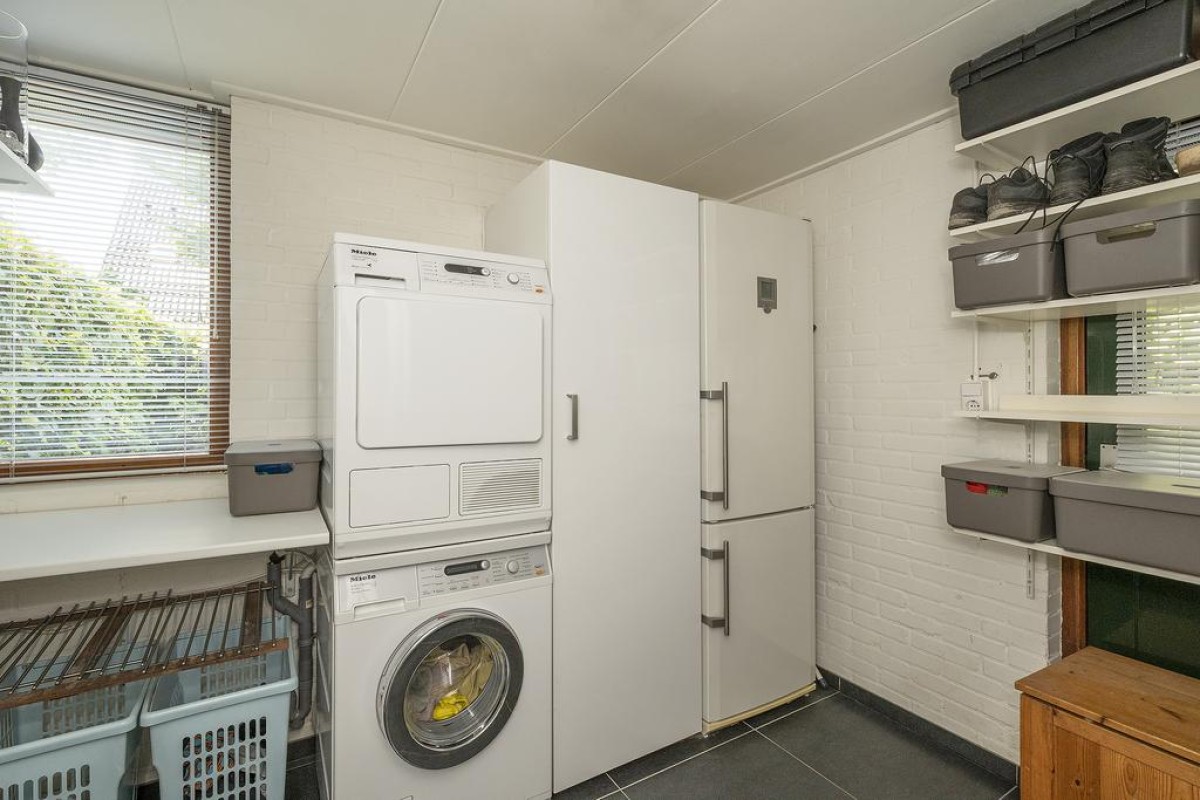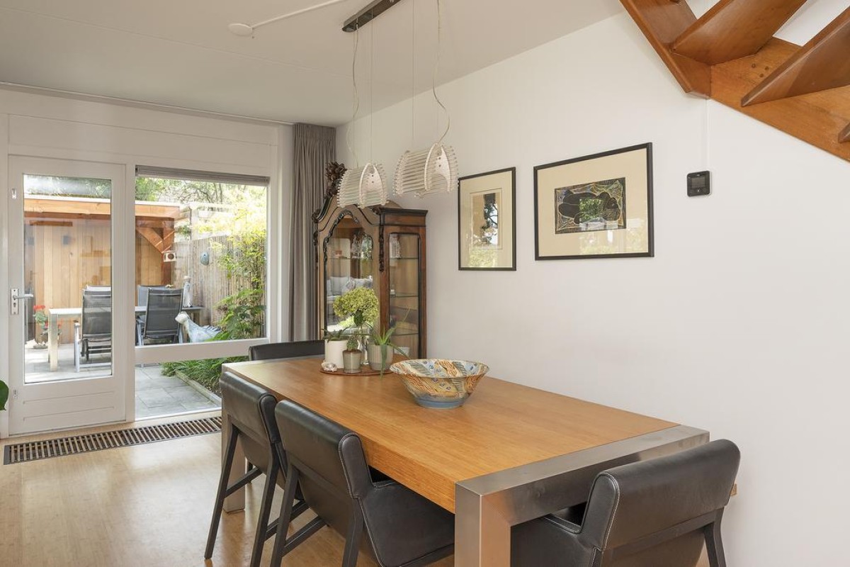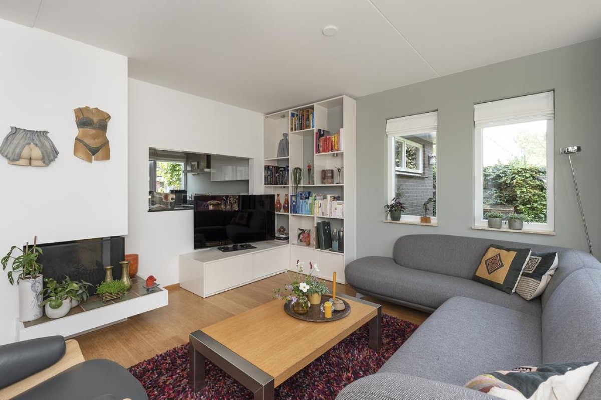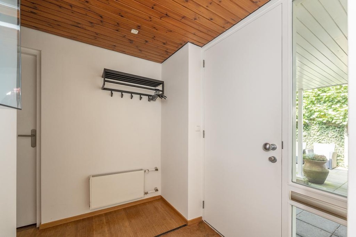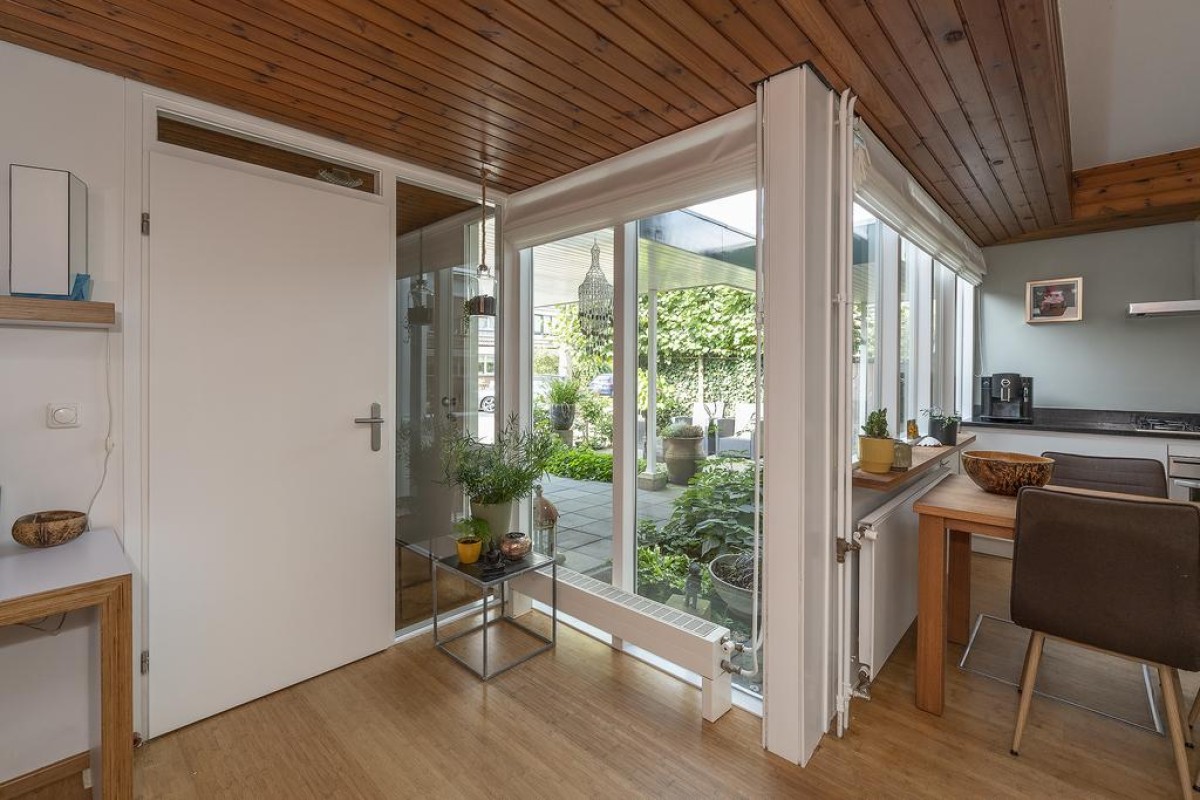 Het huis heeft een speelse en tegelijk praktische indeling. De gehele begane grond heeft recent gestucte wanden. Oorspronkelijke en typische jaren ’70 kenmerken zijn behouden met als resultaat een strakke en moderne woning met een eigen karakter. De keuken is aan de voorzijde van de woning gesitueerd en is voorzien van inbouwapparatuur. De toiletruimte met vrij hangend toilet en de bijkeuken zijn vanuit de entree bereikbaar.