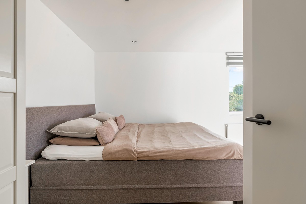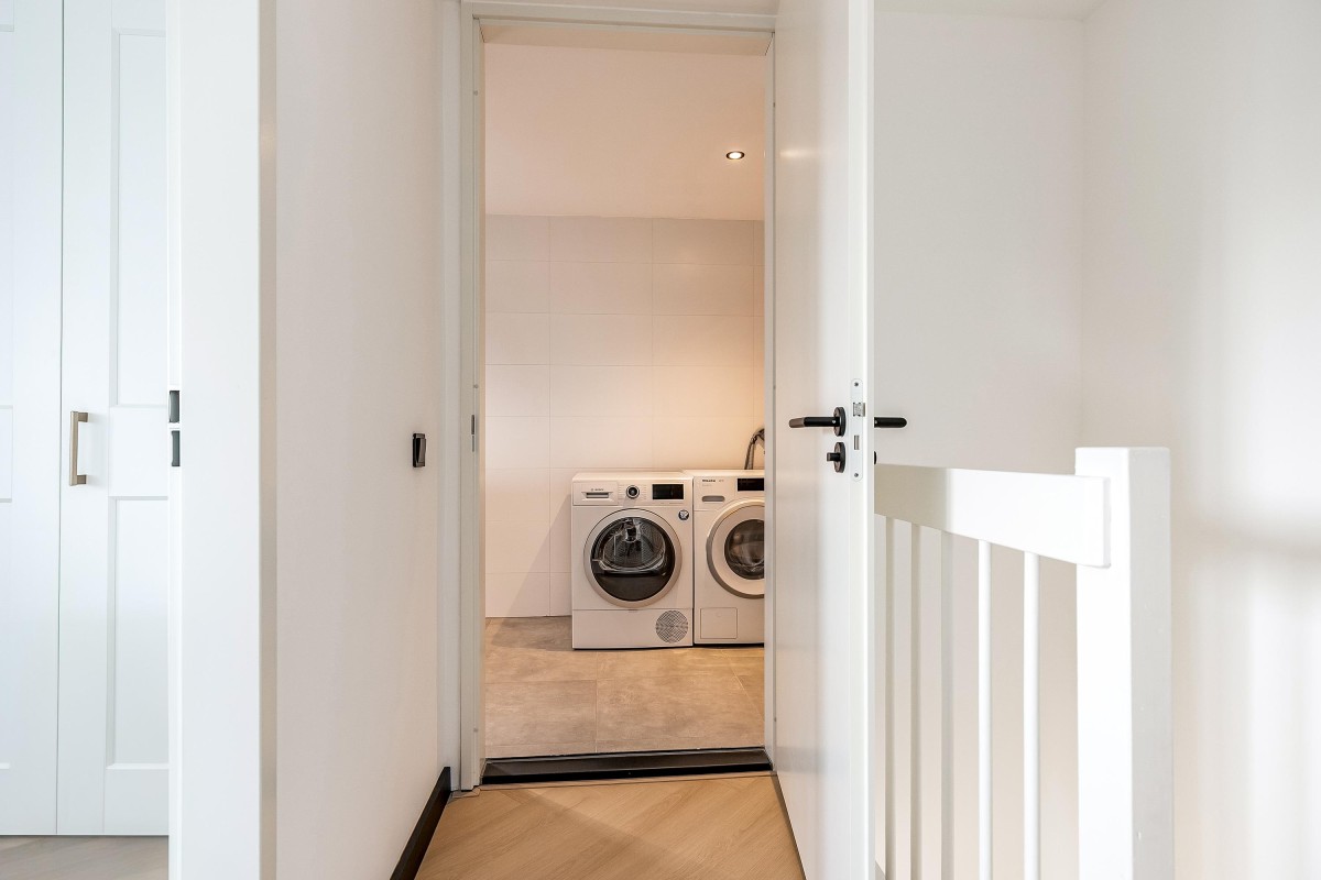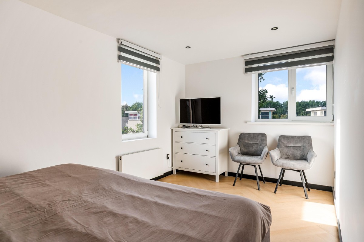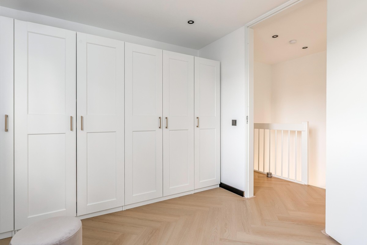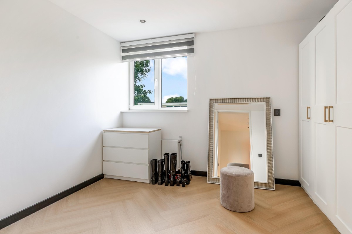 De riante hoofdslaapkamer biedt volop ruimte voor een groot bed, een kastenwand én een tv-meubel. De vierde kamer is nu in gebruik als kleedkamer, maar kan ook prima dienen als slaapkamer, kantoor/werk of hobbyruimte. Aan de voorzijde bevindt zich de tweede badkamer, voorzien van een inloopdouche, wastafelmeubel, toilet en de aansluitingen voor wasmachine en droger.