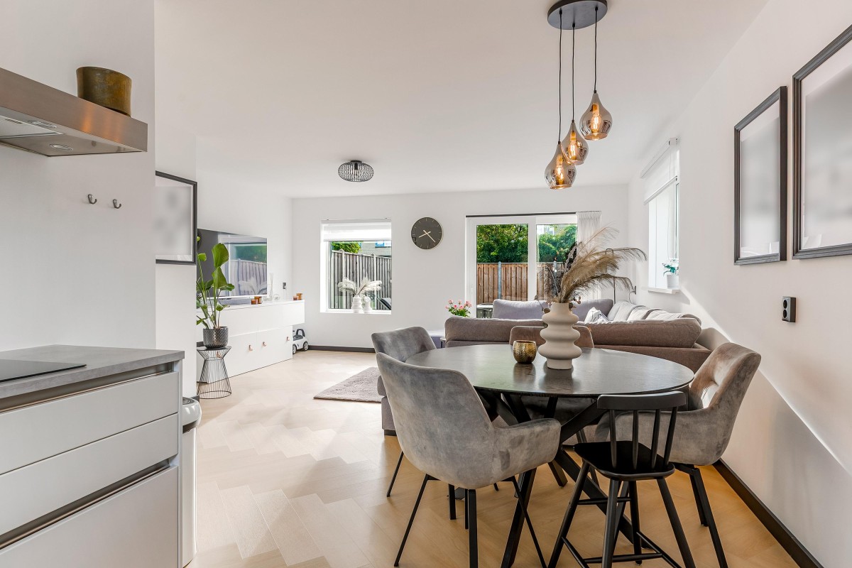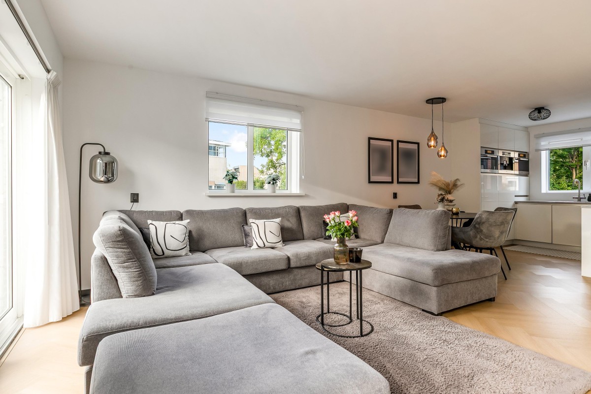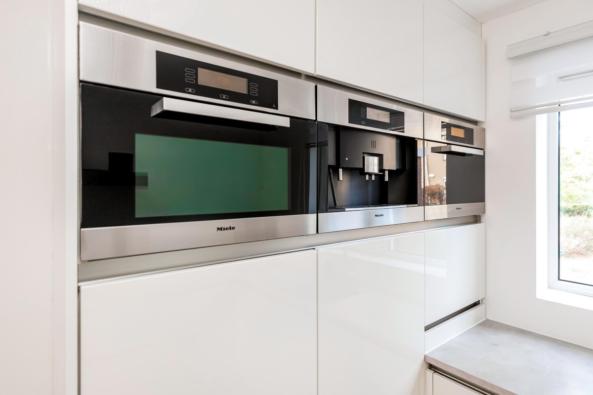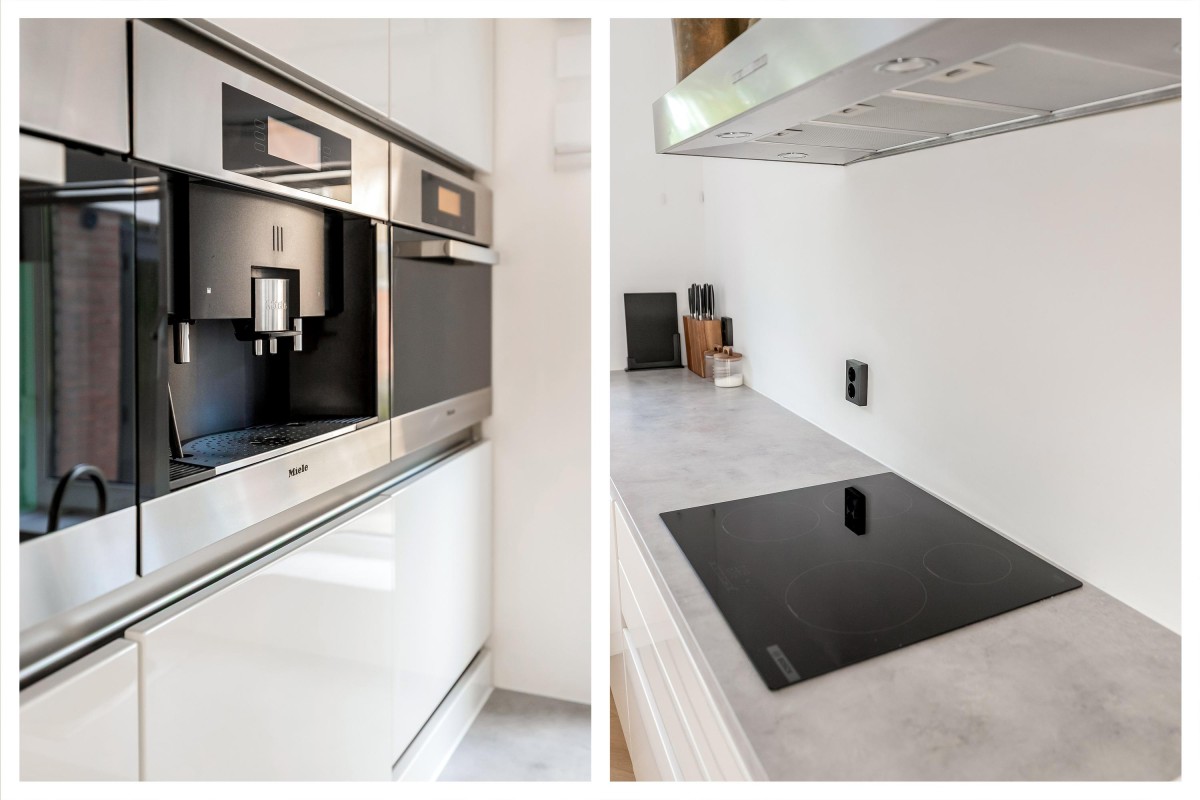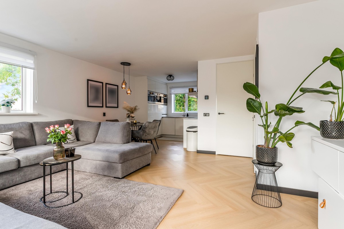 Via de entree met hal, toilet met fonteintje, meterkast en trapopgang betreedt u de lichte woonkamer. De tuingerichte woonkamer is een heerlijke plek om samen te komen. Grote raampartijen en een moderne schuifpui zorgen voor een overvloed aan daglicht en een directe verbinding met de zonnige achtertuin. De strakke wanden en de visgraat vloer met vloerverwarming geven het geheel een eigentijdse uitstraling. Aan de voorzijde bevindt zich de moderne open keuken, uitgevoerd met hoogwaardige inbouwapparatuur zoals een koel-vriescombinatie, kokend-waterkraan, inductiekookplaat, vaatwasser, oven, magnetron en zelfs een ingebouwd koffiezetapparaat. Ideaal voor de kookliefhebber!