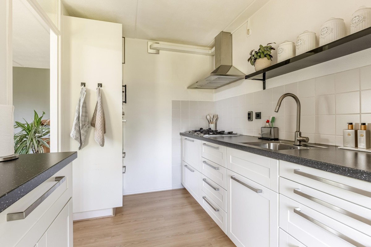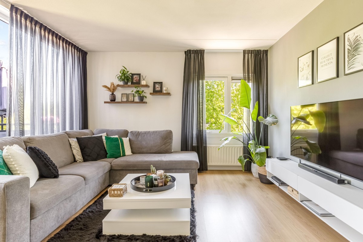 De lichte woonkamer is voorzien van grote raampartijen, wat zorgt voor veel natuurlijk daglicht en een mooi uitzicht op het omliggende groen. Vanuit de woonkamer is het balkon bereikbaar. Het balkon ligt gunstig op het zuidoosten, met zon van de ochtend tot in de late middag. Aansluitend bevindt zich de ruime keuken, die is uitgerust met een oven, magnetron, kookplaat, koel-/vriescombinatie en voldoende opbergruimte.