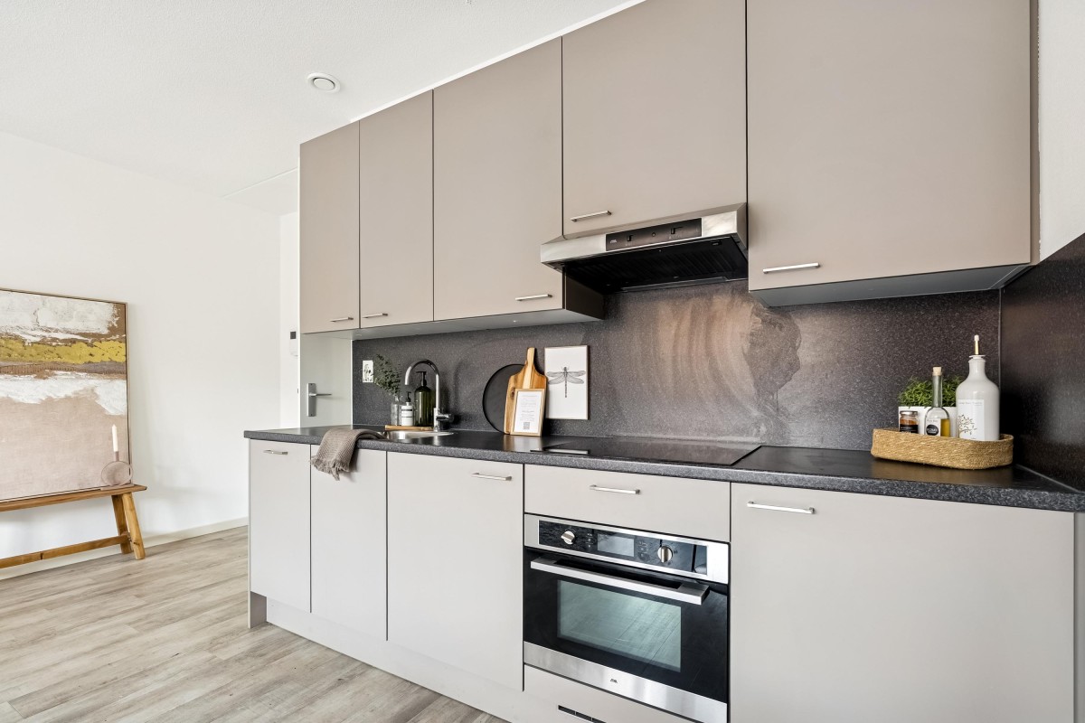 De moderne keuken is voorzien van een inductiekookplaat, afzuigkap, combi-oven, en voldoende kastruimte.