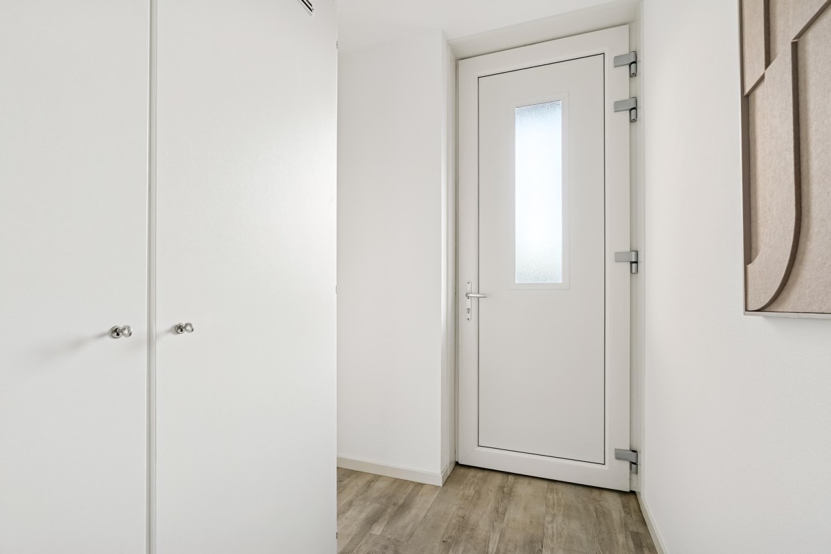 Binnenkomst in de hal met toegang tot de meterkast, technische ruimte, en een praktische bergkast met wasmachineaansluiting.