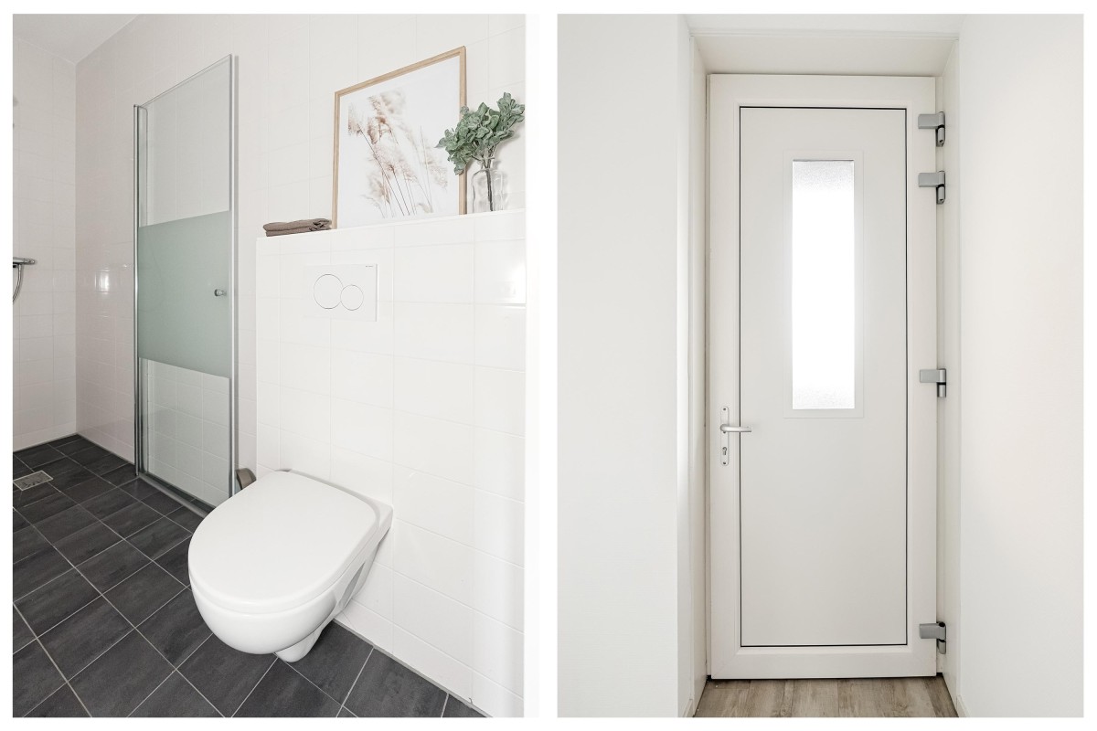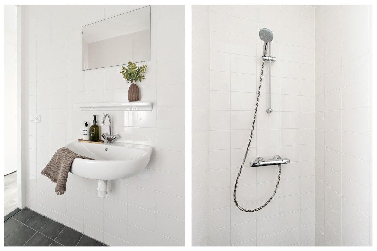 De slaapkamer is compact maar efficiënt ingericht en grenst direct aan de nette badkamer. Deze is volledig betegeld en voorzien van een inloopdouche, wastafel met spiegel en een toilet.