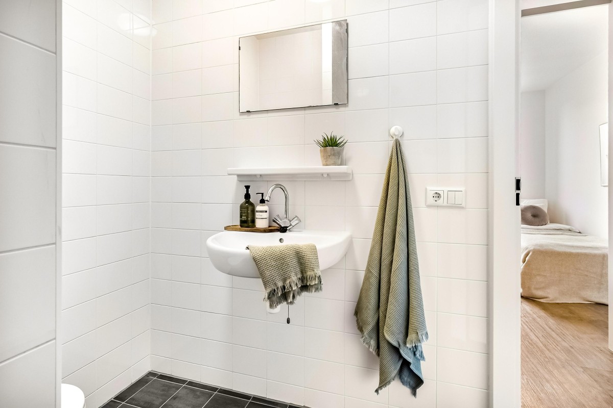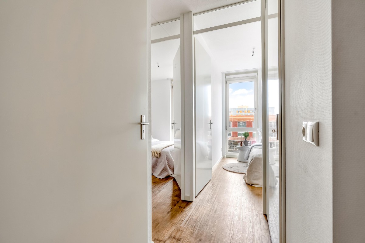 Je komt binnen in een ruime hal met toegang tot de meterkast, een aparte bergkast en de badkamer met inloopdouche, toilet en wastafel. De lichte woonkamer met open keuken is voorzien van moderne inbouwapparatuur en biedt ruimte aan zowel een zit- als eetgedeelte. Vanuit de woonkamer heb je toegang tot het balkon op het noorden. De grootste slaapkamer biedt voldoende plek voor een tweepersoonsbed en kastruimte. De kleine slaapkamer is ideaal als werkkamer of logeerruimte. De woning is afgewerkt met een pvc-vloer en strakke wanden.