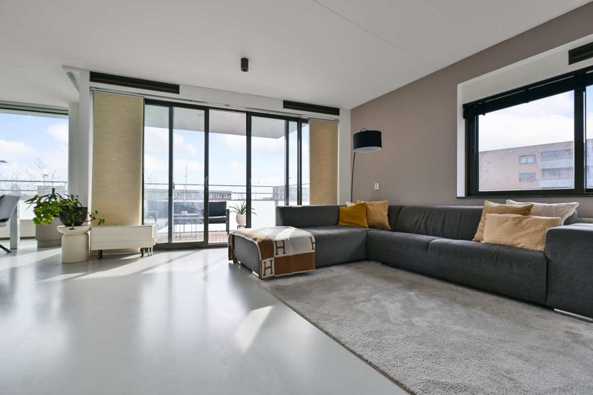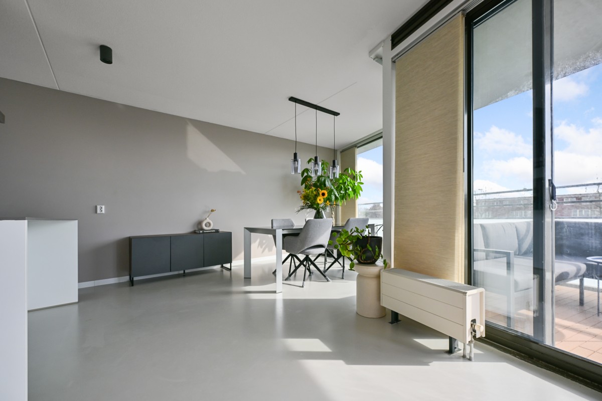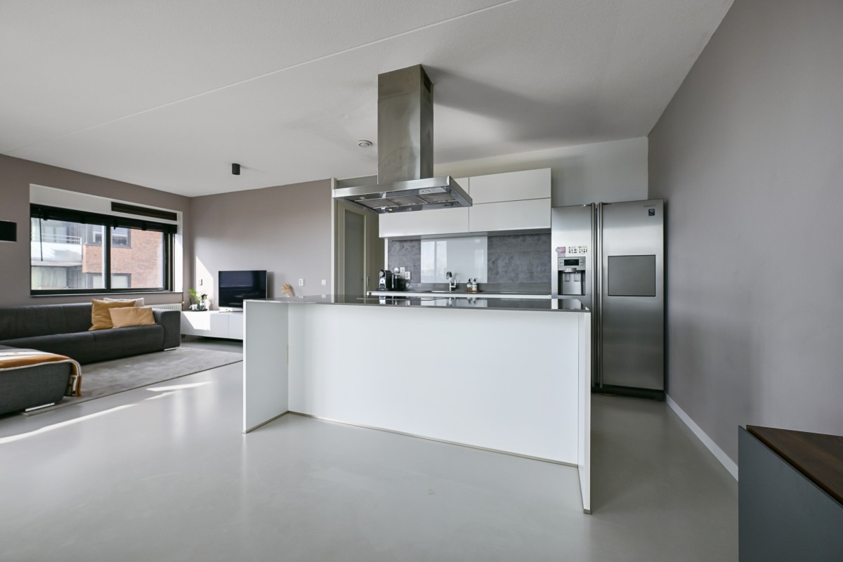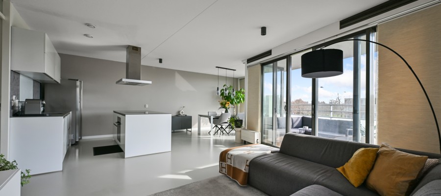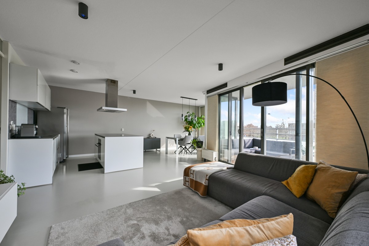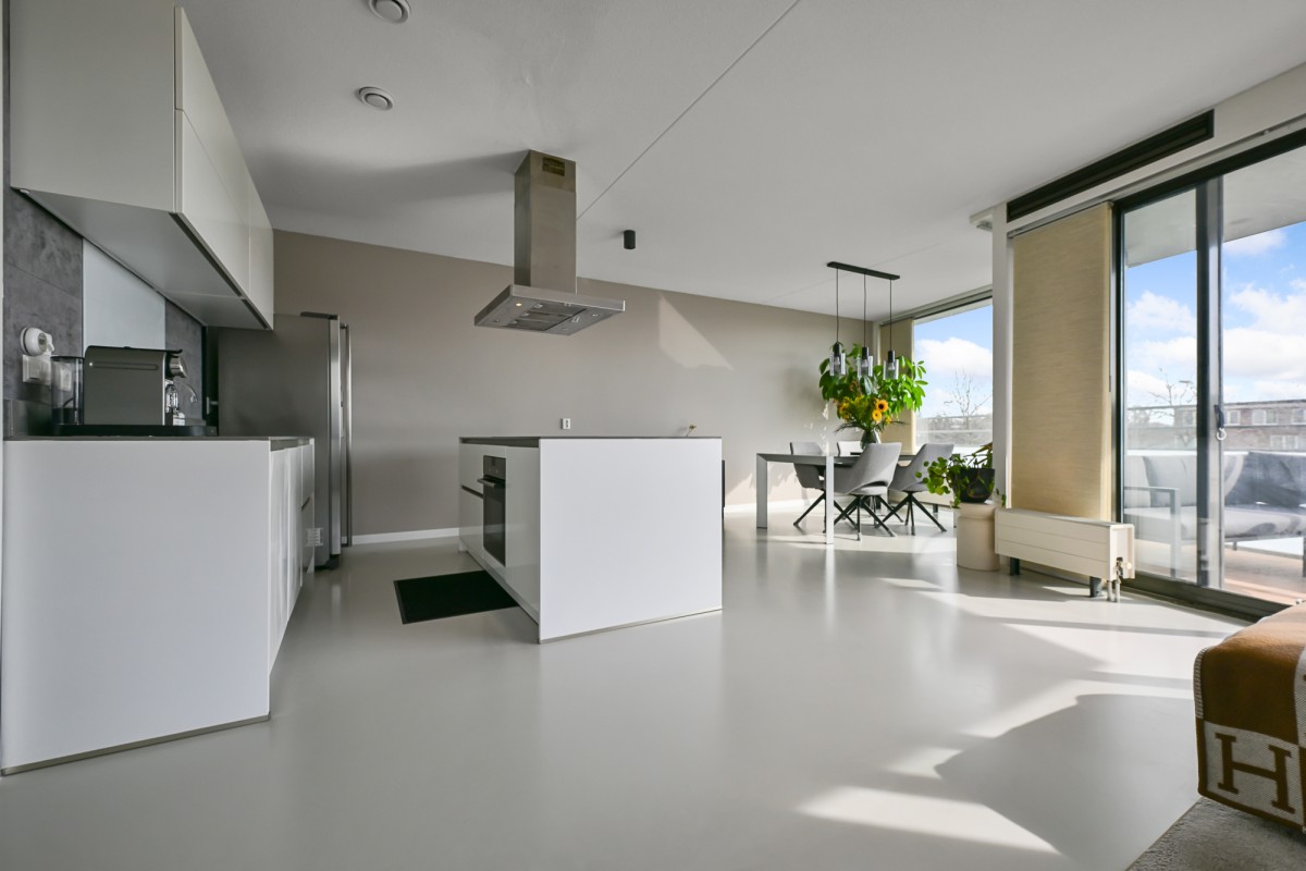 Bij binnenkomst in de woning leidt de hal u naar alle vertrekken. De ruime woonkamer, dat is voorzien is van een gietvloer aan de achterzijde van het appartement, beschikt over grote raampartijen, waardoor er een prachtige lichtinval ontstaat. Via de schuifpui heeft u toegang tot het royale en sfeervolle balkon van maar circa 11 m² op het zonnige zuiden – de perfecte plek om heerlijk van de zon te genieten.