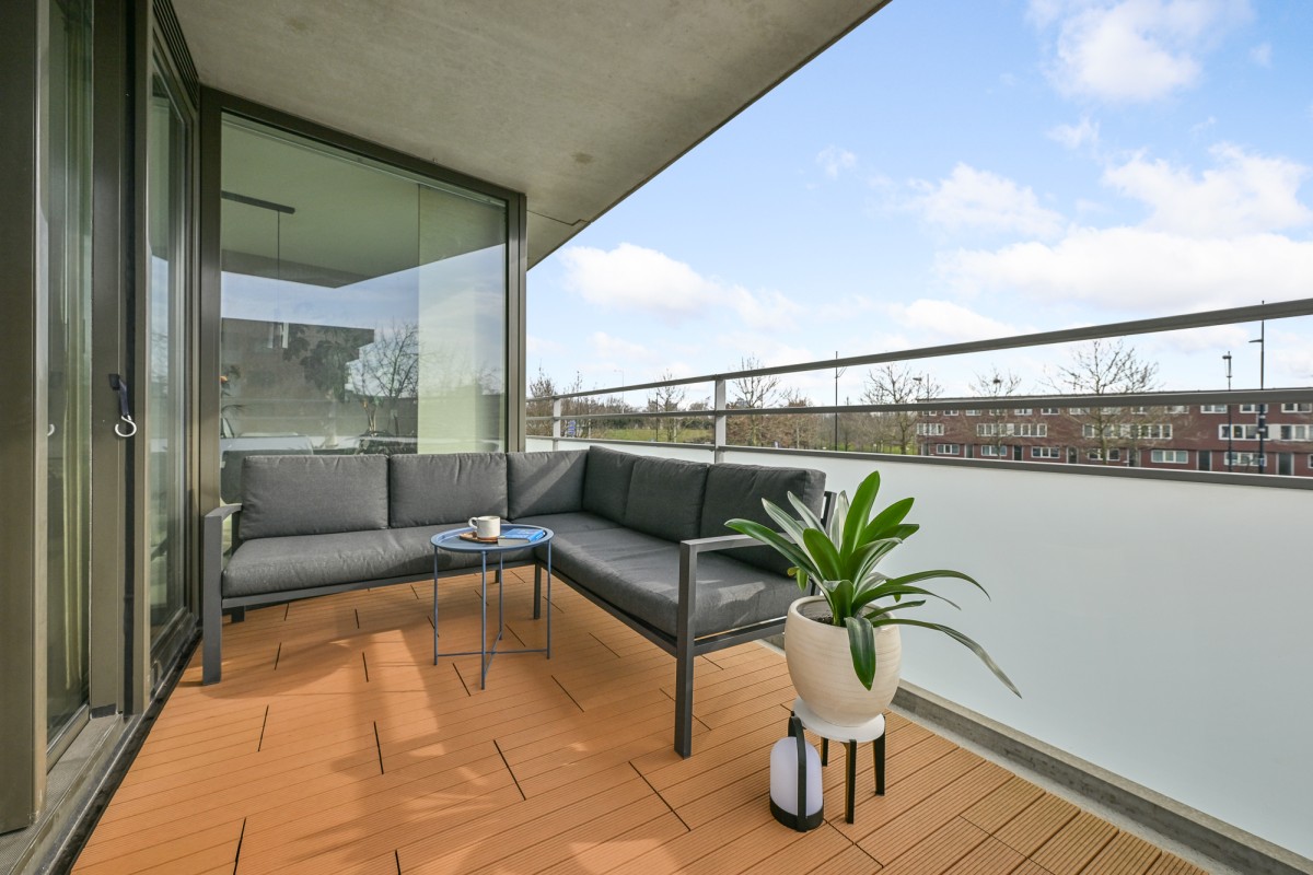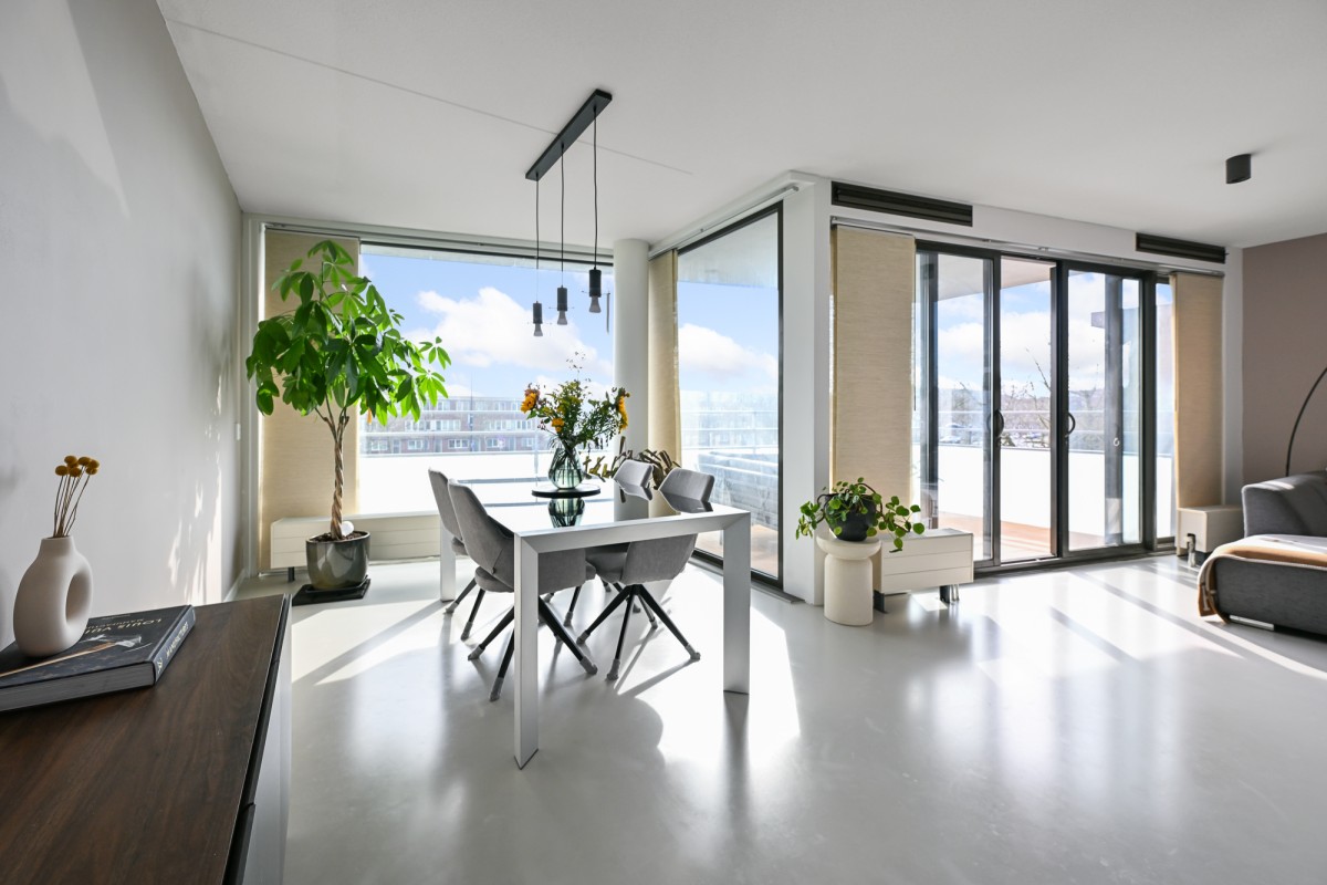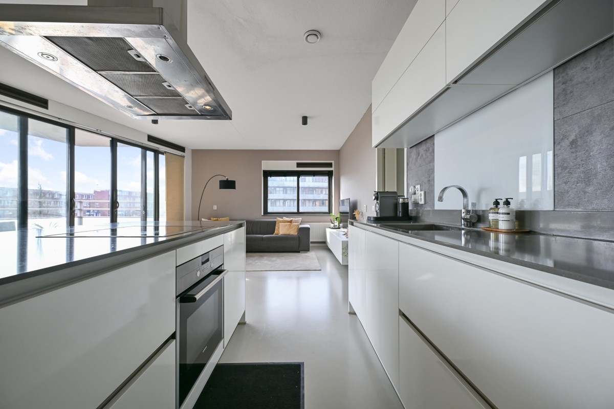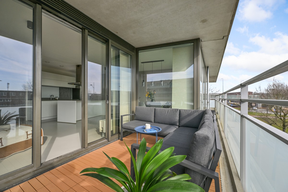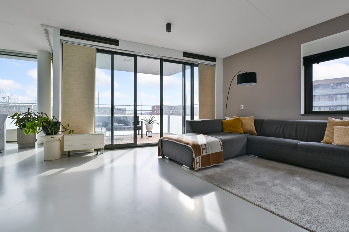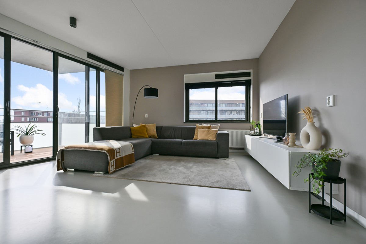 Bij binnenkomst in de woning leidt de hal u naar alle vertrekken. De ruime woonkamer, dat is voorzien is van een gietvloer aan de achterzijde van het appartement, beschikt over grote raampartijen, waardoor er een prachtige lichtinval ontstaat. Via de schuifpui heeft u toegang tot het royale en sfeervolle balkon van maar circa 11 m² op het zonnige zuiden – de perfecte plek om heerlijk van de zon te genieten.