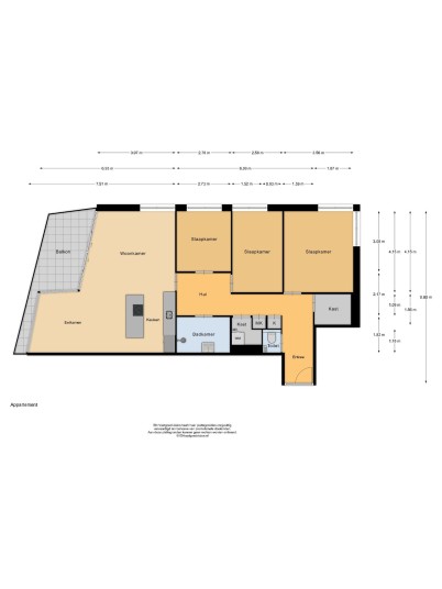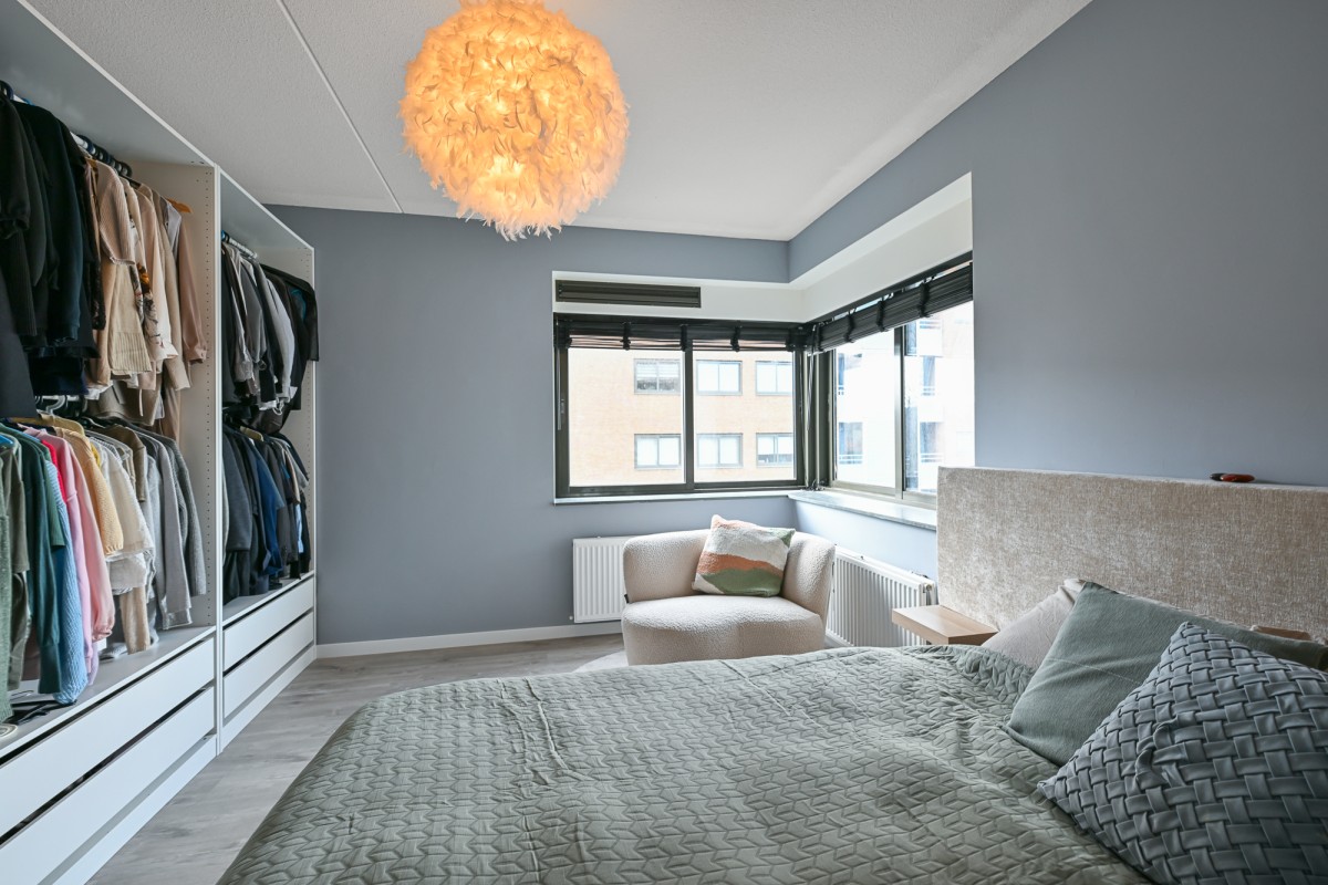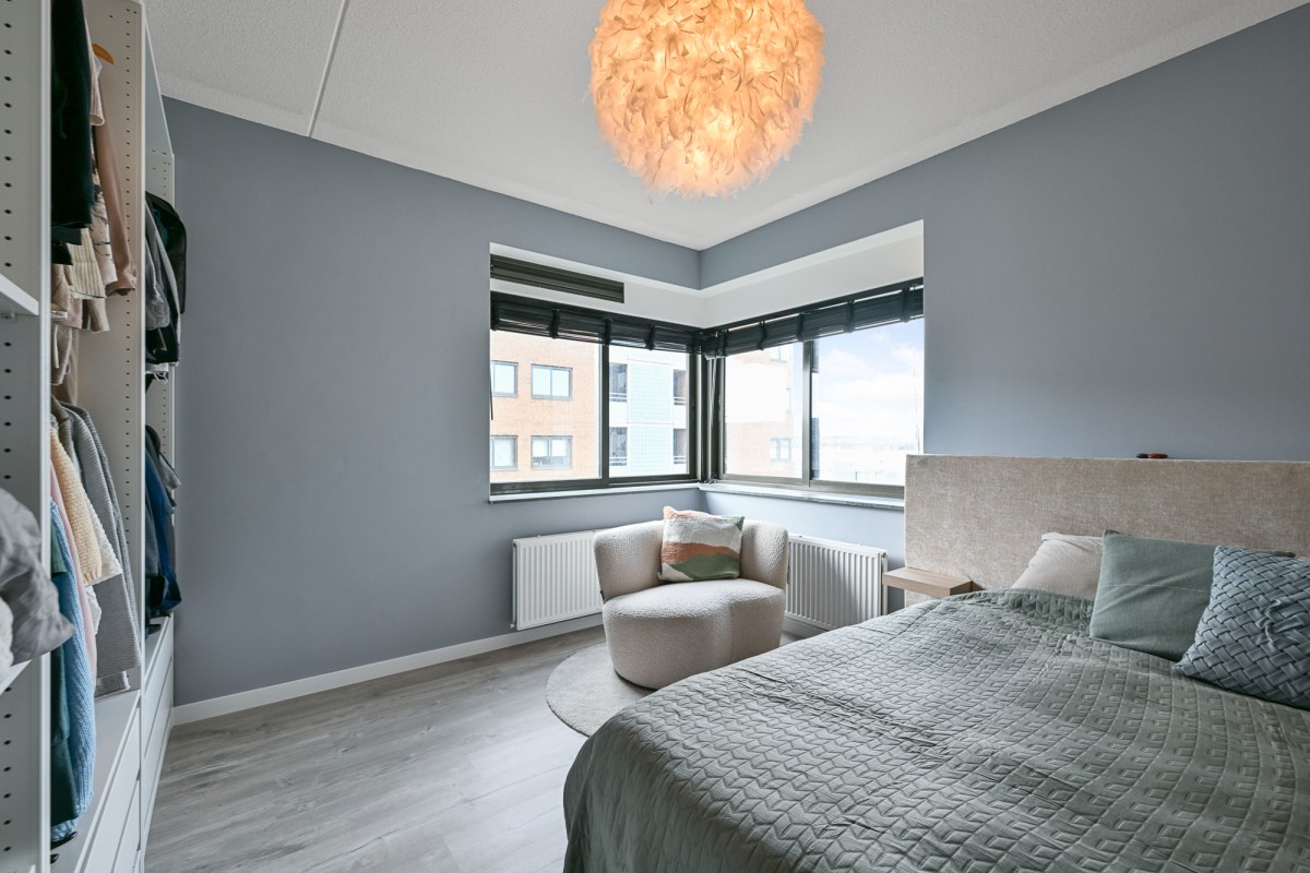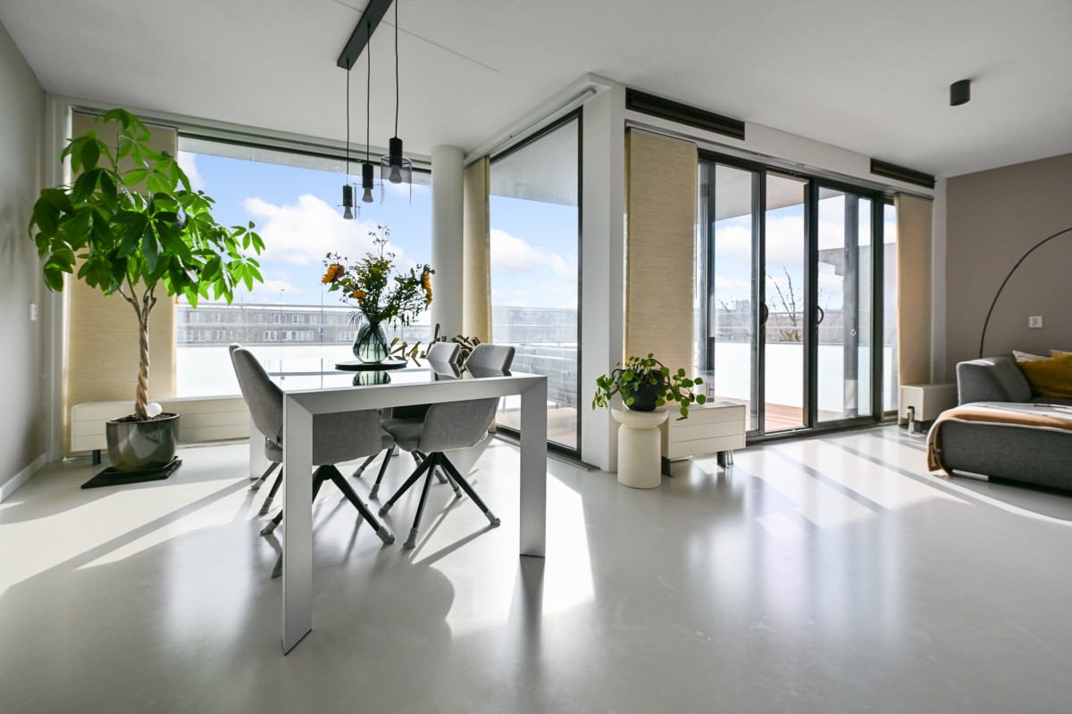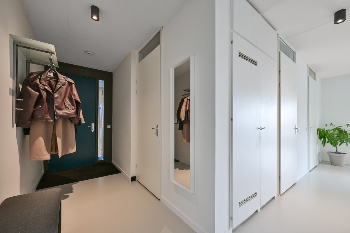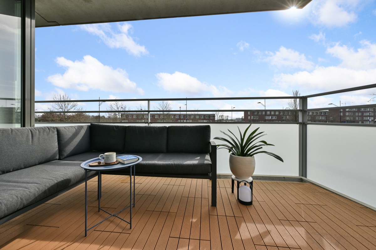 Bij binnenkomst in de woning leidt de hal u naar alle vertrekken. De ruime woonkamer, dat is voorzien is van een gietvloer aan de achterzijde van het appartement, beschikt over grote raampartijen, waardoor er een prachtige lichtinval ontstaat. Via de schuifpui heeft u toegang tot het royale en sfeervolle balkon van maar circa 11 m² op het zonnige zuiden – de perfecte plek om heerlijk van de zon te genieten.