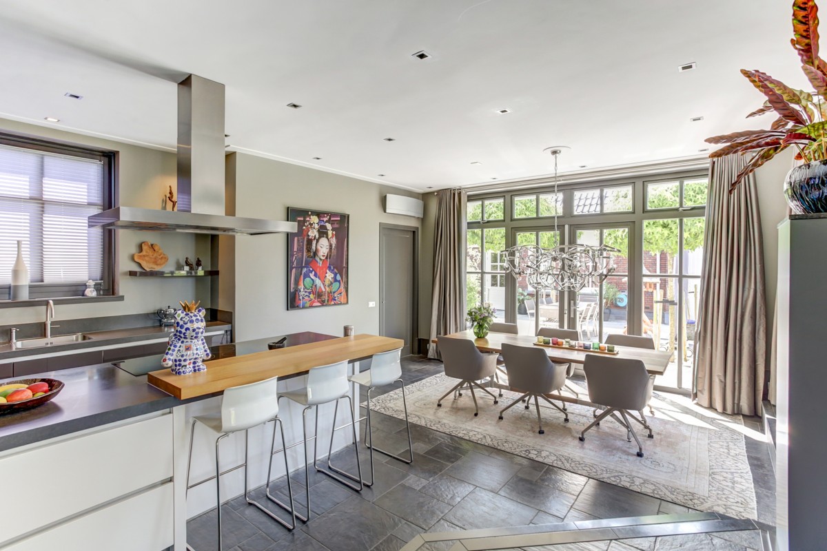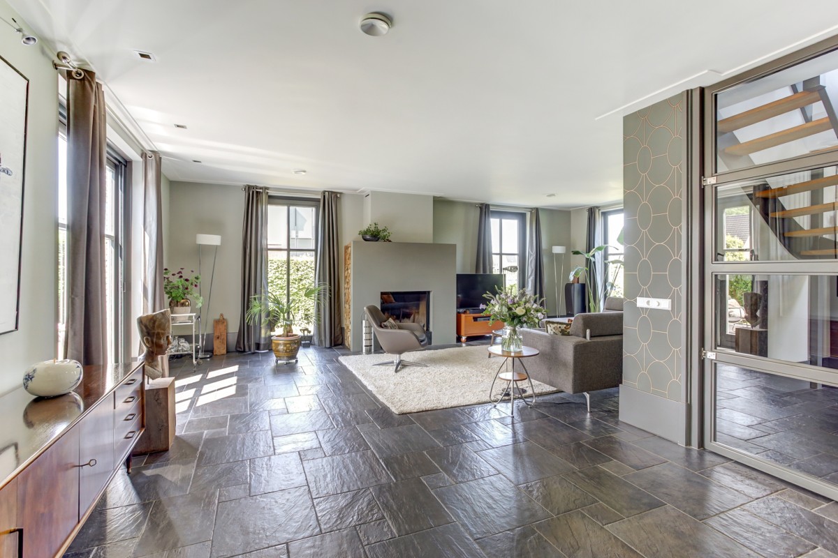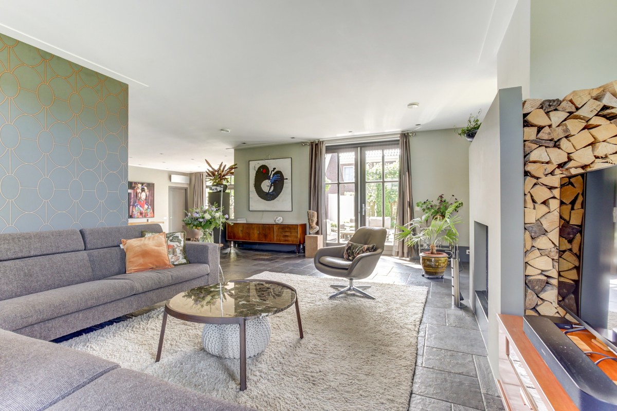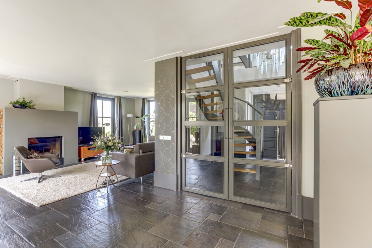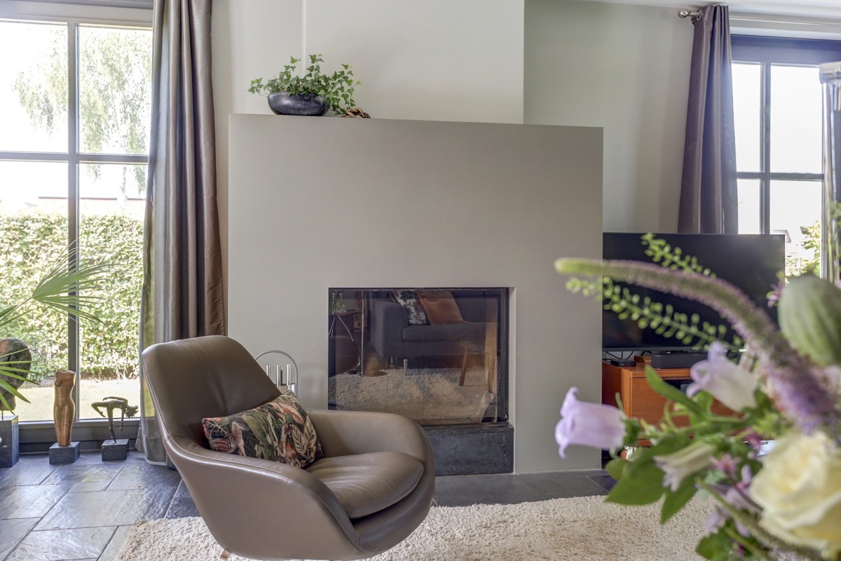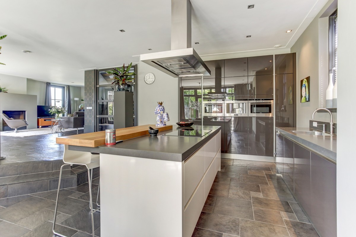 Begane grond: bordes naar verhoogde entree, dubbele deuren naar een ruime hal met vide en prachtige trappartij, dubbele openslaande glazen deuren naar de living, uitgebreide meterkast, moderne ruime toiletruimte met hangcloset en fonteintje, prachtige kantoorruimte aan de straatzijde met uitzicht over groen en water. De living ligt beschikt over prachtige uitzicht op de tuin en openbaar groen vanuit de hogere ligging. De living is tevens voorzien van een mooie hout haard met klassieke mantel. Aan de achterzijde van de woning is een verlaagde woonkeuken gesitueerd met mooie lichte eetkamer. De luxe keuken beschikt over een riant kookeiland en kastenwand met ingebouwde koelkast, vaatwasser, inductiekookplaat, afzuiging, koffieautomaat, oven, combimagnetron en Quooker. Vanuit de eetkamer is het ruime zonneterras aan de achterzijde van de woning bereikbaar middels openslaande tuindeuren. Ook dit terras is op hoogte gerealiseerd wat een speels hoogteverschil in de tuin geeft. Binnendoor is een bijkeuken met warmtepomp, elektrische boiler, wasmachine aansluiting en droger bereikbaar. Een loopdeur geeft toegang tot de zijtuin.