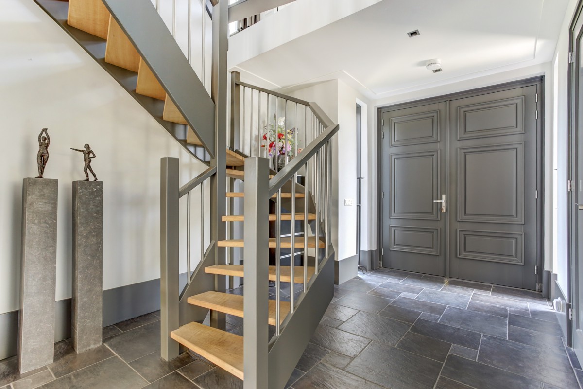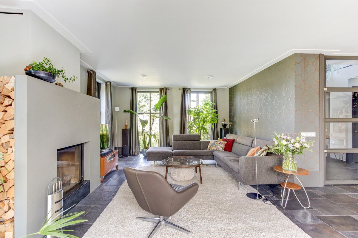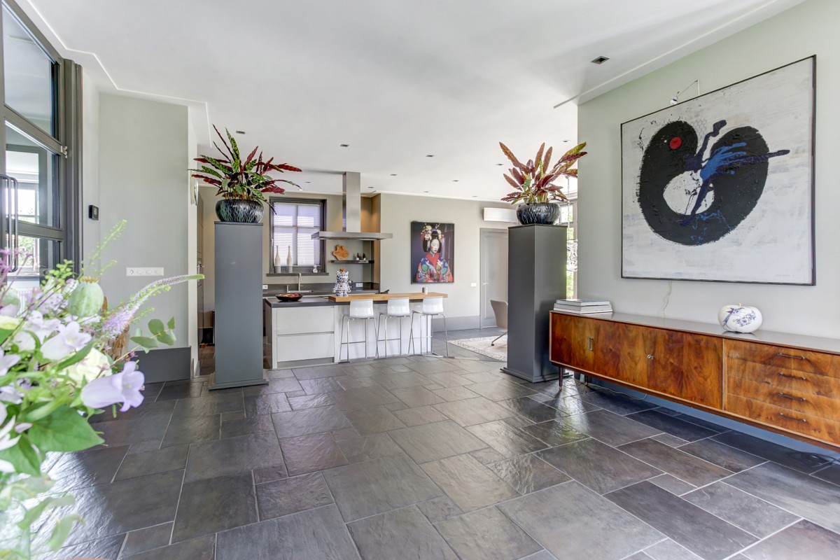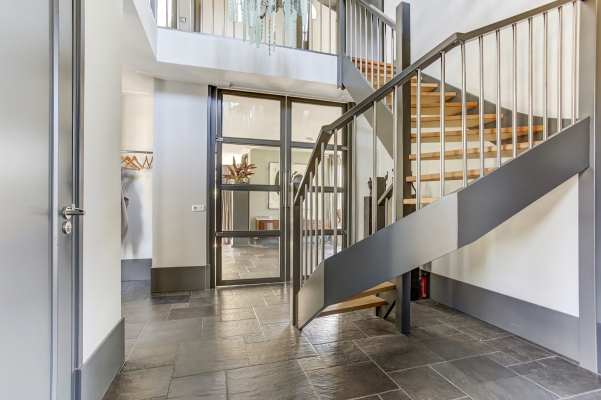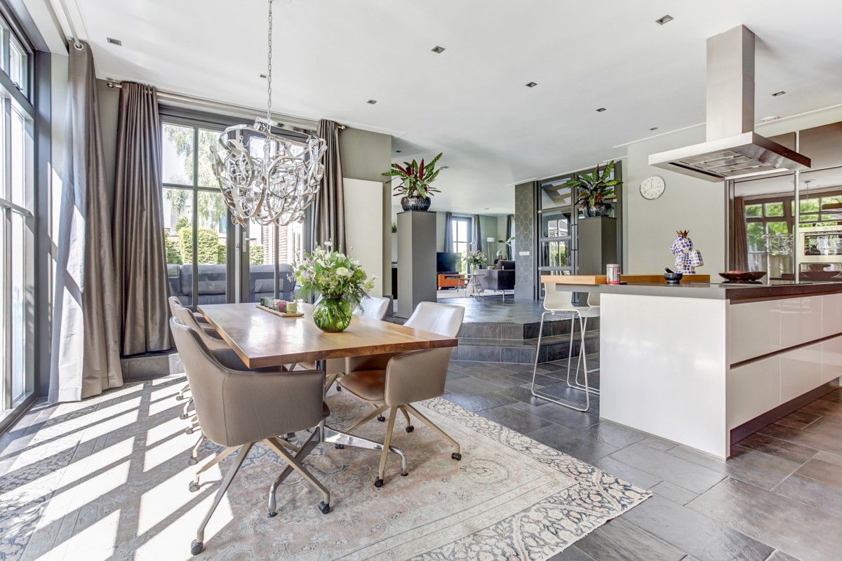 Begane grond: bordes naar verhoogde entree, dubbele deuren naar een ruime hal met vide en prachtige trappartij, dubbele openslaande glazen deuren naar de living, uitgebreide meterkast, moderne ruime toiletruimte met hangcloset en fonteintje, prachtige kantoorruimte aan de straatzijde met uitzicht over groen en water. De living ligt beschikt over prachtige uitzicht op de tuin en openbaar groen vanuit de hogere ligging. De living is tevens voorzien van een mooie hout haard met klassieke mantel. Aan de achterzijde van de woning is een verlaagde woonkeuken gesitueerd met mooie lichte eetkamer. De luxe keuken beschikt over een riant kookeiland en kastenwand met ingebouwde koelkast, vaatwasser, inductiekookplaat, afzuiging, koffieautomaat, oven, combimagnetron en Quooker. Vanuit de eetkamer is het ruime zonneterras aan de achterzijde van de woning bereikbaar middels openslaande tuindeuren. Ook dit terras is op hoogte gerealiseerd wat een speels hoogteverschil in de tuin geeft. Binnendoor is een bijkeuken met warmtepomp, elektrische boiler, wasmachine aansluiting en droger bereikbaar. Een loopdeur geeft toegang tot de zijtuin.