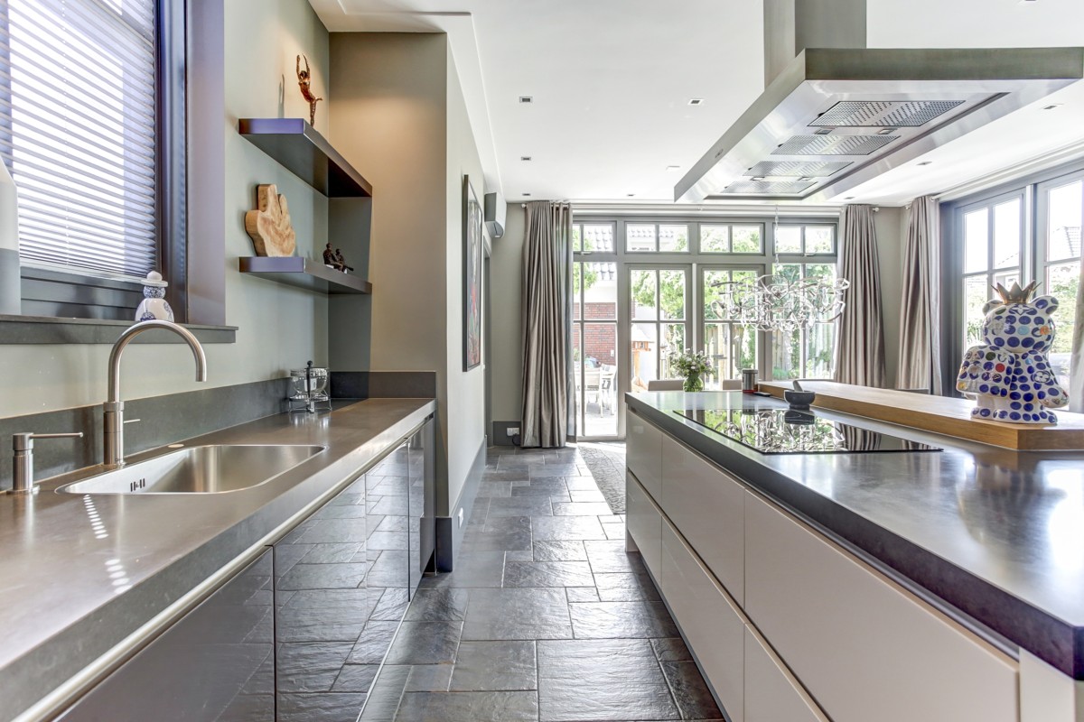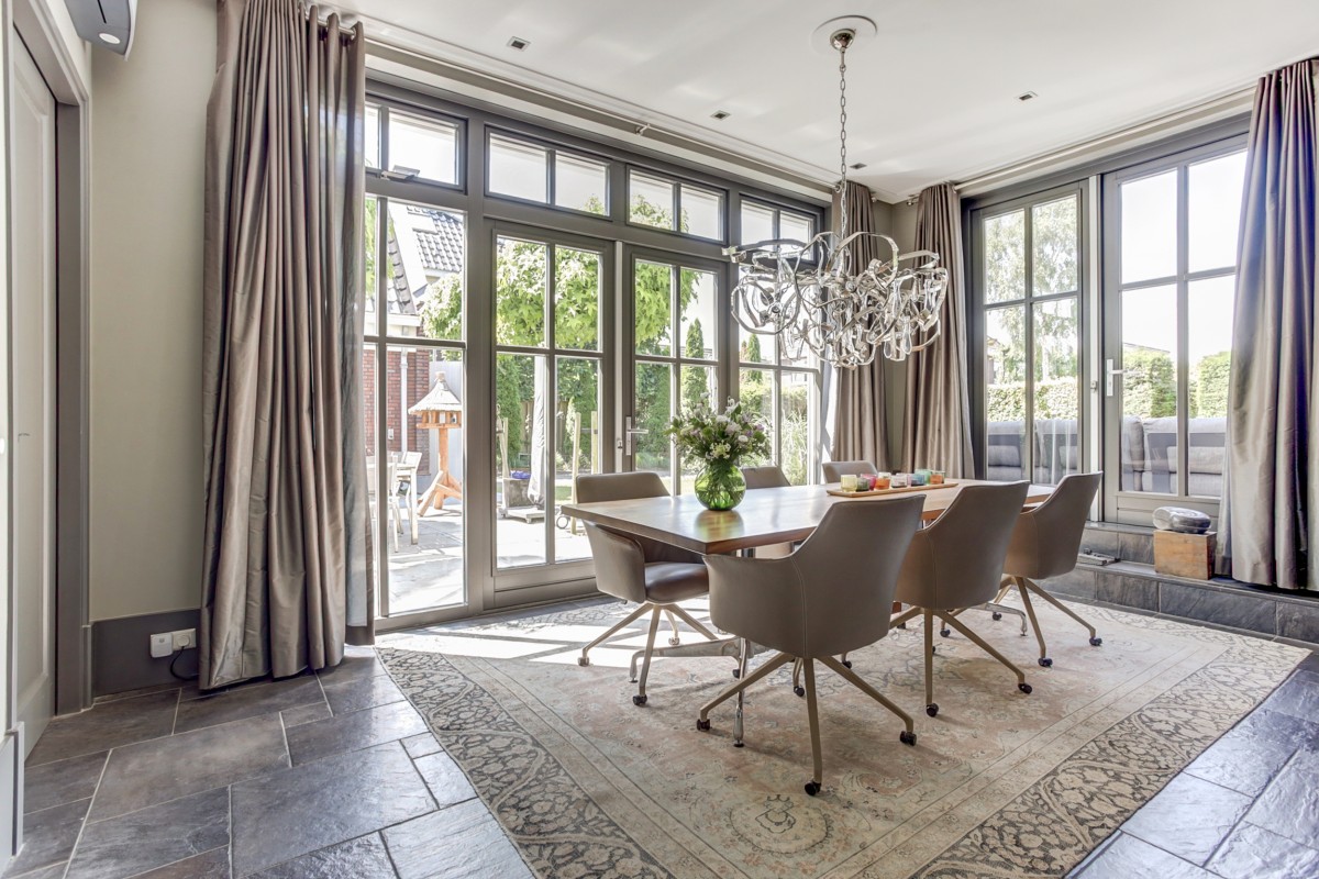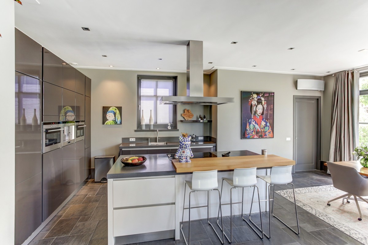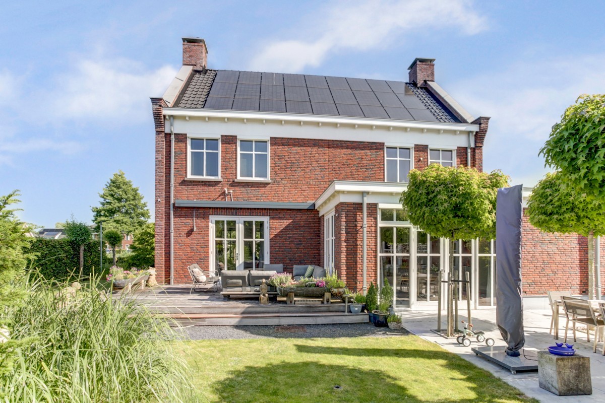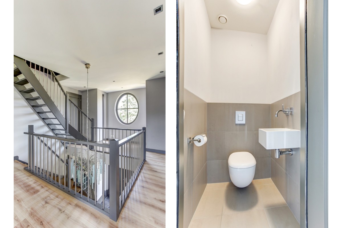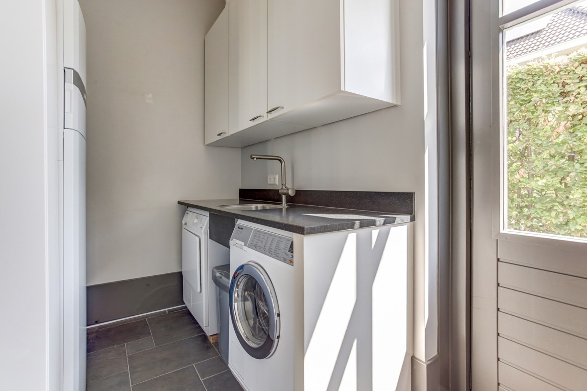 Begane grond: bordes naar verhoogde entree, dubbele deuren naar een ruime hal met vide en prachtige trappartij, dubbele openslaande glazen deuren naar de living, uitgebreide meterkast, moderne ruime toiletruimte met hangcloset en fonteintje, prachtige kantoorruimte aan de straatzijde met uitzicht over groen en water. De living ligt beschikt over prachtige uitzicht op de tuin en openbaar groen vanuit de hogere ligging. De living is tevens voorzien van een mooie hout haard met klassieke mantel. Aan de achterzijde van de woning is een verlaagde woonkeuken gesitueerd met mooie lichte eetkamer. De luxe keuken beschikt over een riant kookeiland en kastenwand met ingebouwde koelkast, vaatwasser, inductiekookplaat, afzuiging, koffieautomaat, oven, combimagnetron en Quooker. Vanuit de eetkamer is het ruime zonneterras aan de achterzijde van de woning bereikbaar middels openslaande tuindeuren. Ook dit terras is op hoogte gerealiseerd wat een speels hoogteverschil in de tuin geeft. Binnendoor is een bijkeuken met warmtepomp, elektrische boiler, wasmachine aansluiting en droger bereikbaar. Een loopdeur geeft toegang tot de zijtuin.