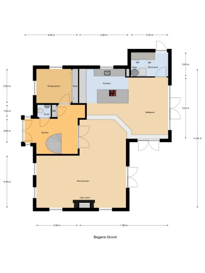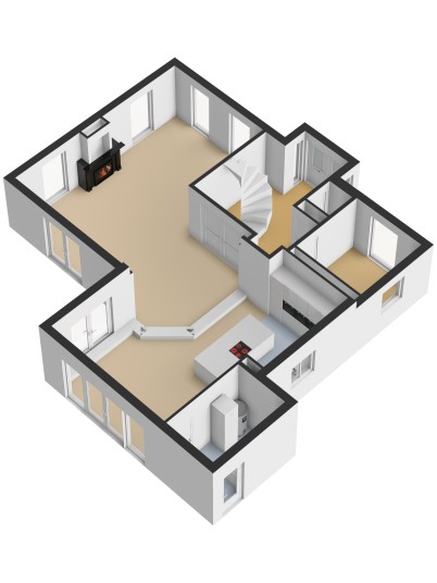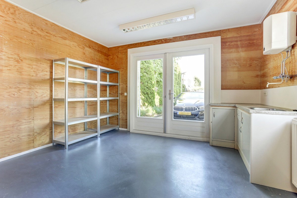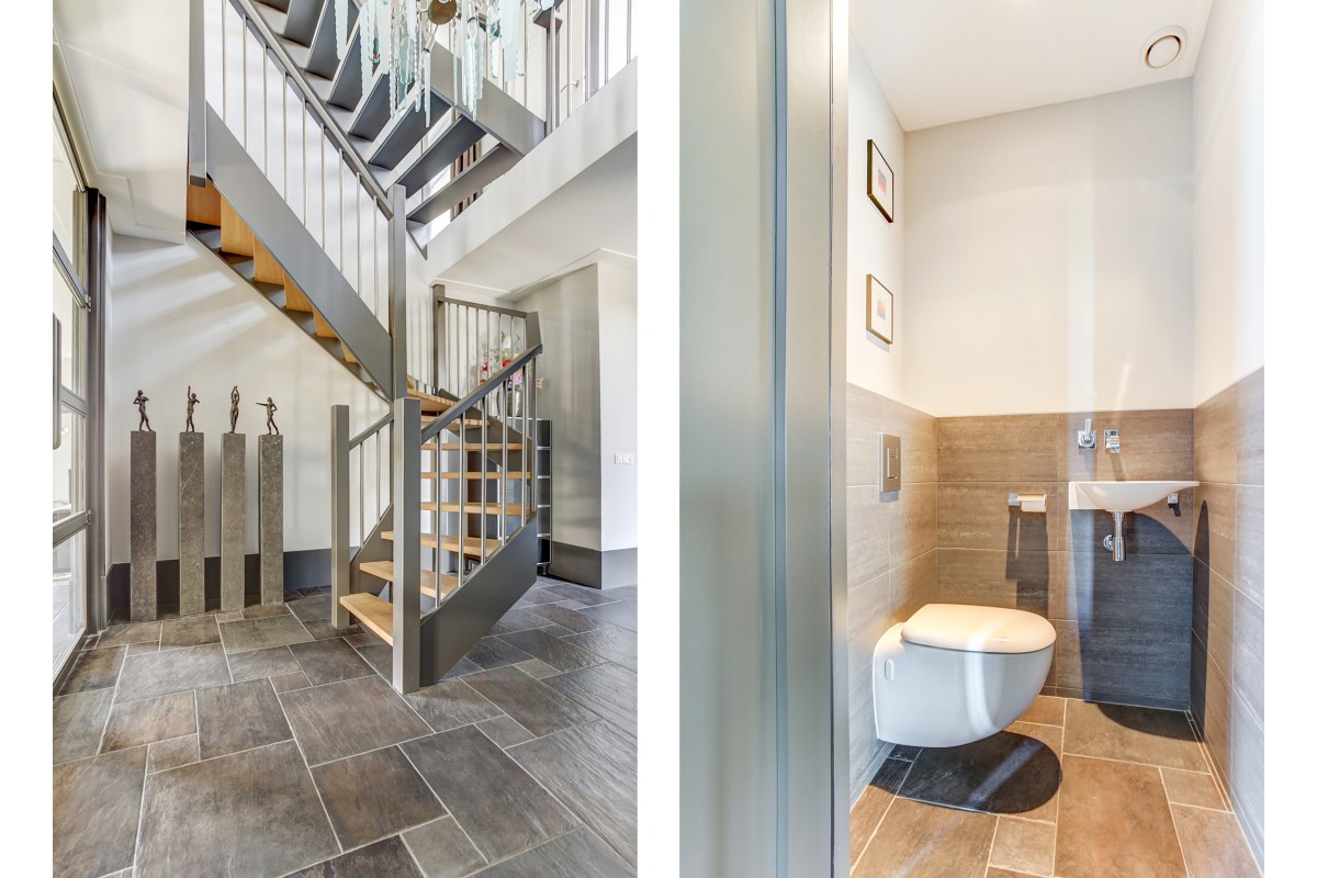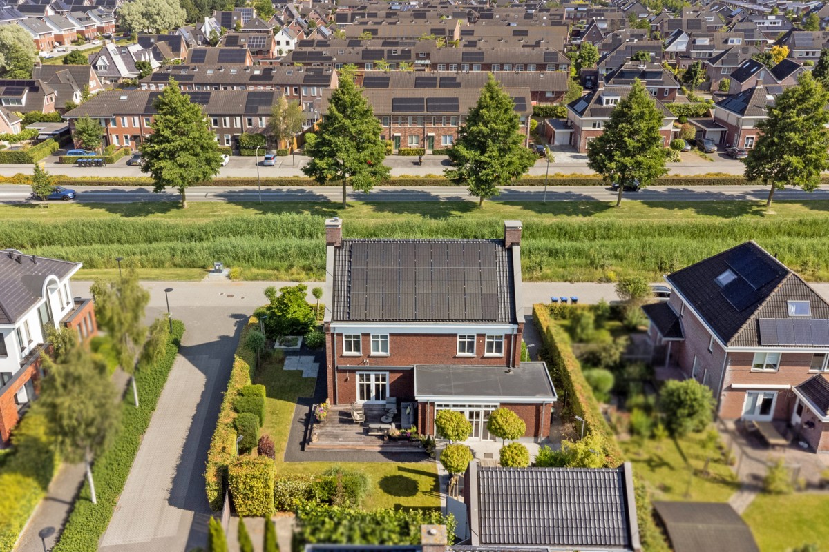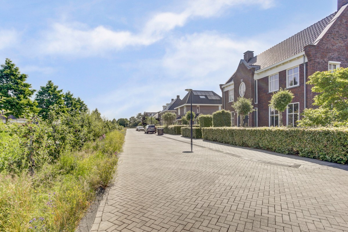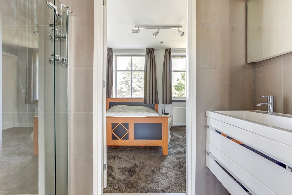Begane grond: bordes naar verhoogde entree, dubbele deuren naar een ruime hal met vide en prachtige trappartij, dubbele openslaande glazen deuren naar de living, uitgebreide meterkast, moderne ruime toiletruimte met hangcloset en fonteintje, prachtige kantoorruimte aan de straatzijde met uitzicht over groen en water. De living ligt beschikt over prachtige uitzicht op de tuin en openbaar groen vanuit de hogere ligging. De living is tevens voorzien van een mooie hout haard met klassieke mantel. Aan de achterzijde van de woning is een verlaagde woonkeuken gesitueerd met mooie lichte eetkamer. De luxe keuken beschikt over een riant kookeiland en kastenwand met ingebouwde koelkast, vaatwasser, inductiekookplaat, afzuiging, koffieautomaat, oven, combimagnetron en Quooker. Vanuit de eetkamer is het ruime zonneterras aan de achterzijde van de woning bereikbaar middels openslaande tuindeuren. Ook dit terras is op hoogte gerealiseerd wat een speels hoogteverschil in de tuin geeft. Binnendoor is een bijkeuken met warmtepomp, elektrische boiler, wasmachine aansluiting en droger bereikbaar. Een loopdeur geeft toegang tot de zijtuin.