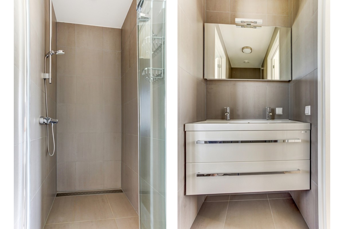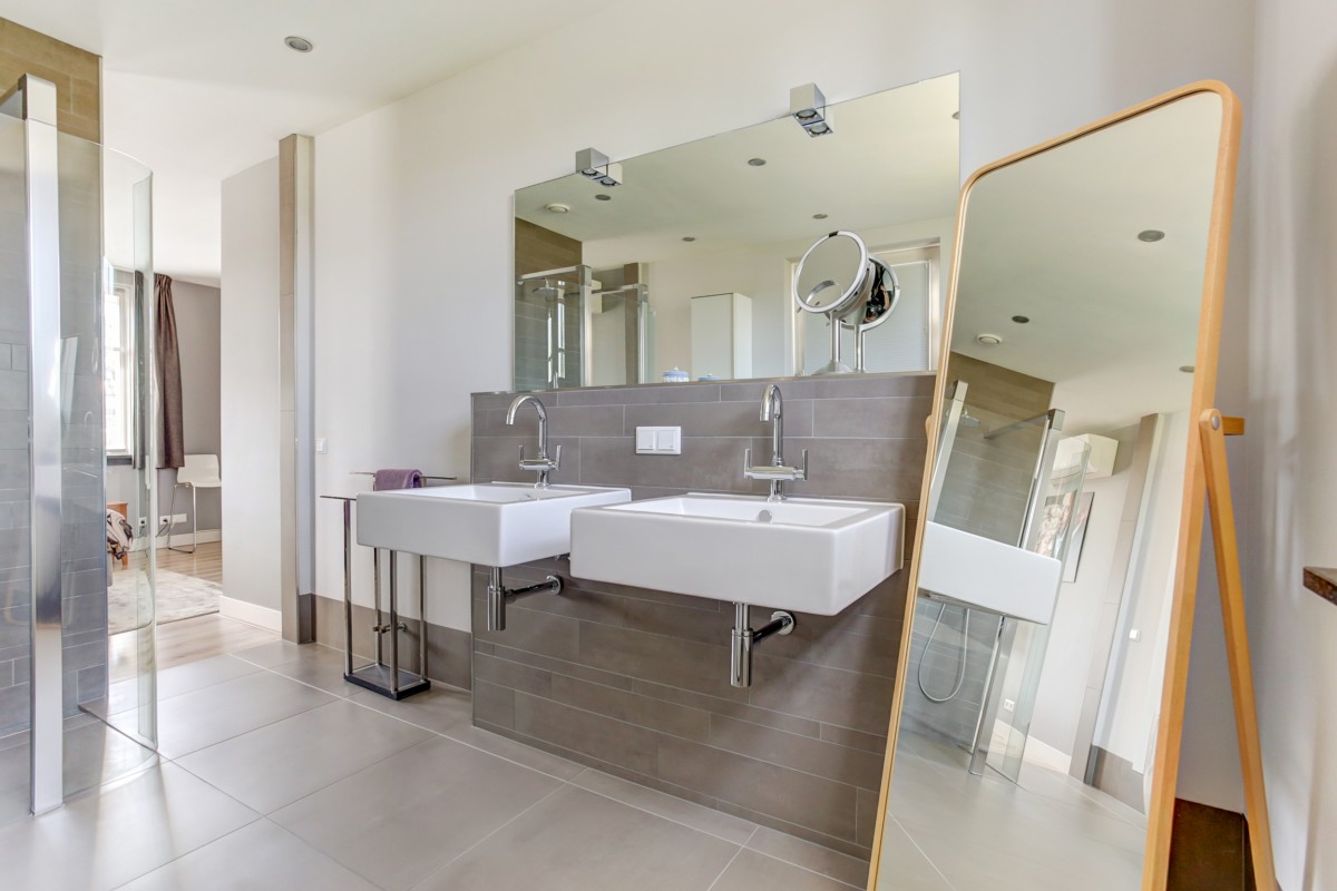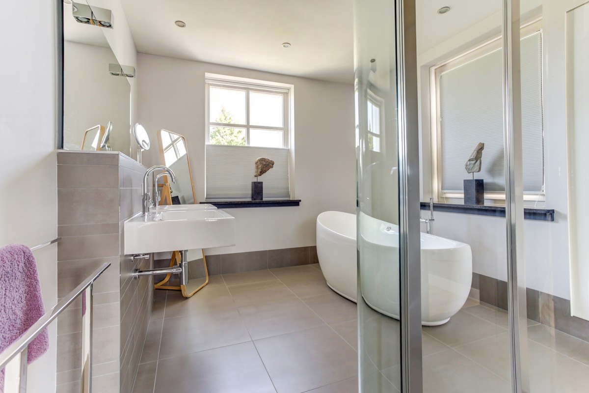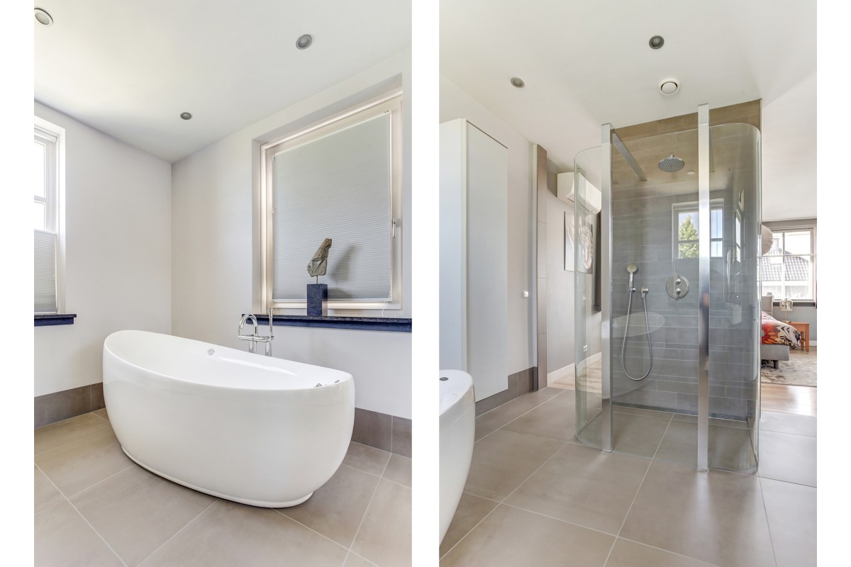 Eerste verdieping: prachtige open trap met vide naar de ruime lichte overloop met aansluitend 3 grote slaapkamers, 2 badkamers en separate toiletruimte. De master bedroom met luxe badkamer en suite beschikt over een ruime maatvoering met kastenwand. De badkamer beschikt over een vrijstaand design ligbad, ruime douche met cabine en dubbele wastafel met meubel. Rondom geven de vele ramen een prachtige lichtinval. Aan de ander zijde van de woning zijn 2 mooie slaapkamers gesitueerd met daartussen een 2e badkamer met inloopdouche en wastafelmeubel. deze badkamer is vanuit beide slaapkamer bereikbaar en afsluitbaar. Een separate toiletruimte met 2e hangcloset en design fonteintje is aan de overloop gelegen.