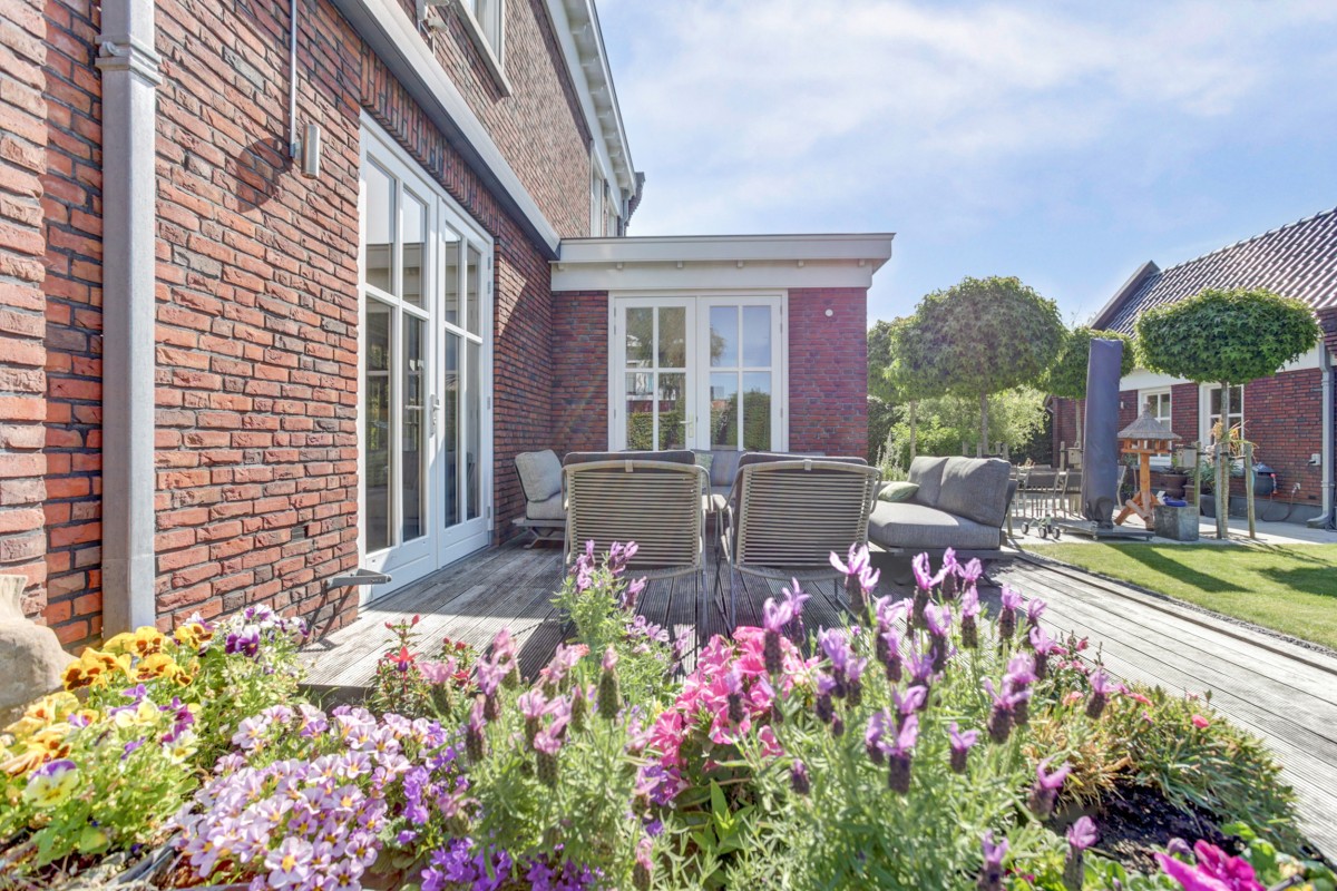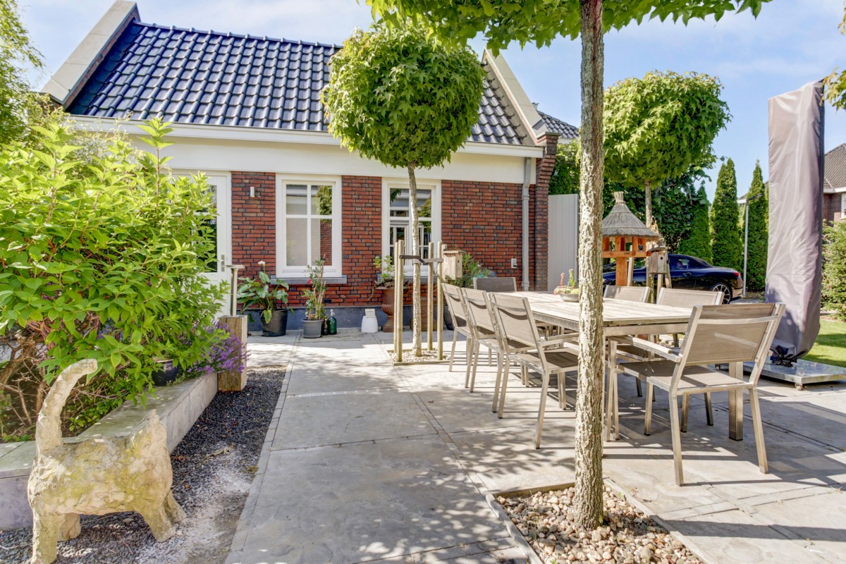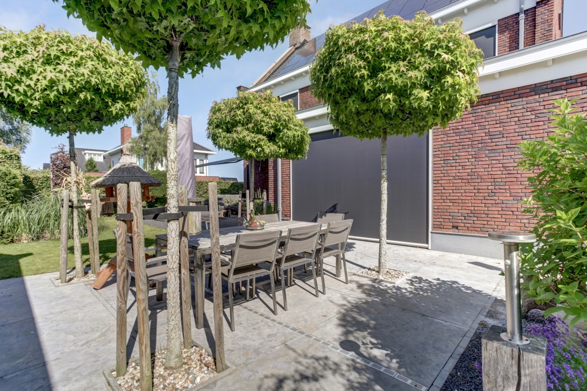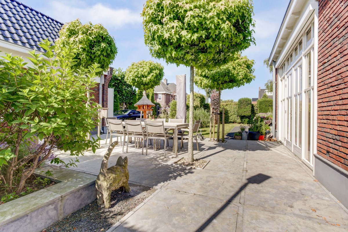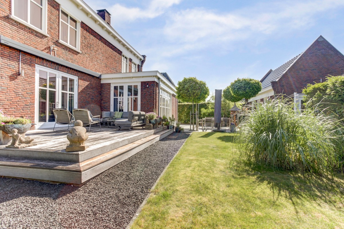 De tuin is rondom de woning gelegen waarbij de achtertuin op het zuiden gesitueerd is. De tuin biedt mede door de omheining veel privacy alsmede parkeergelegenheid en een vrijstaand stenen tuinhuis. Het tuinhuis is in de dezelfde stijl gebouwd als het woonhuis en ingericht als een atelier met openslaande tuindeuren, berging en bergzolder. Deze ruimte is volledig geïsoleerd, verwarmd en voorzien van een klassieke pantry. De tuin is tevens voorzien van grindkoffers met een dompelpomp ter voorbereiding op toenemende neerslag alsmede professionele beveiliging middels een camerasysteem en verlichting.