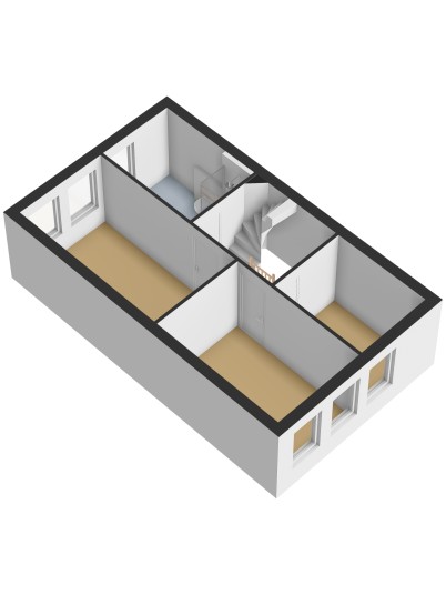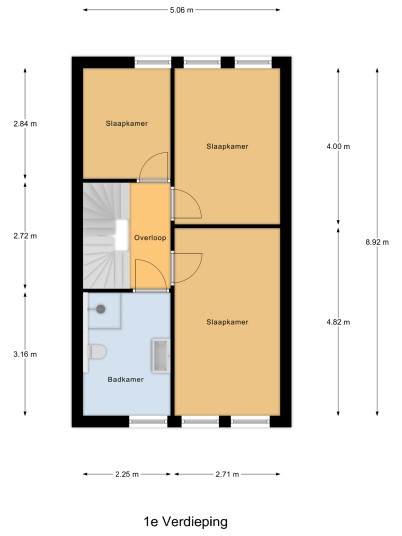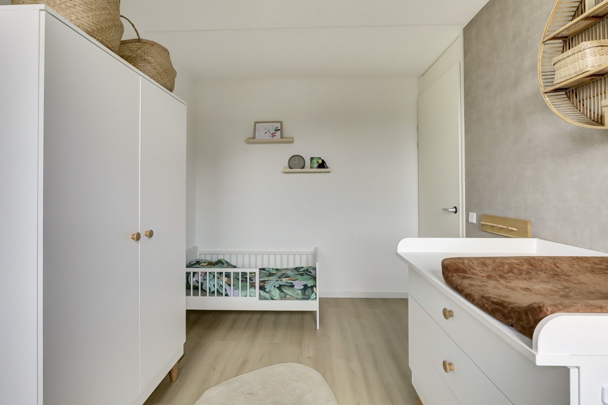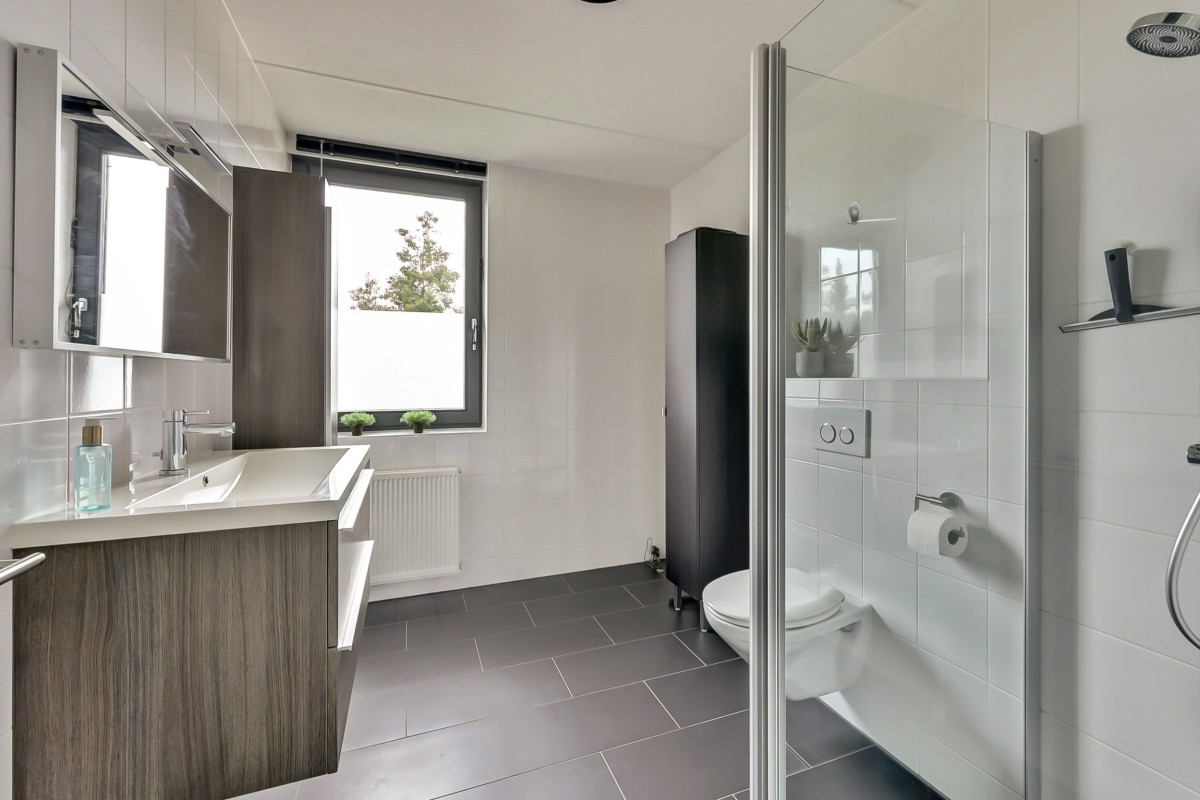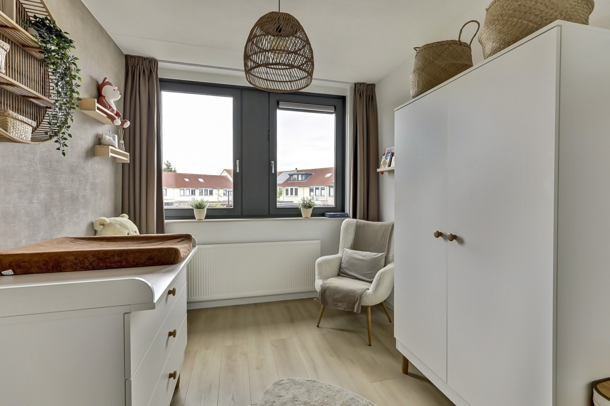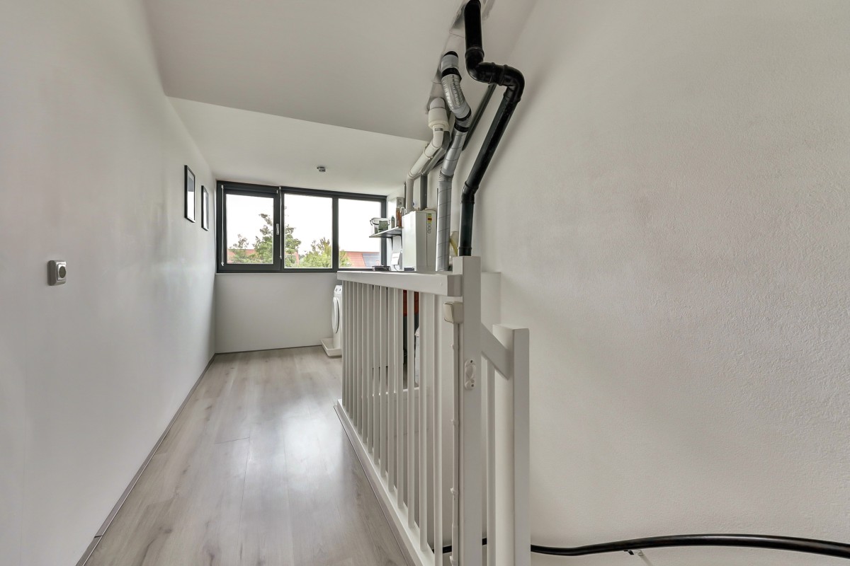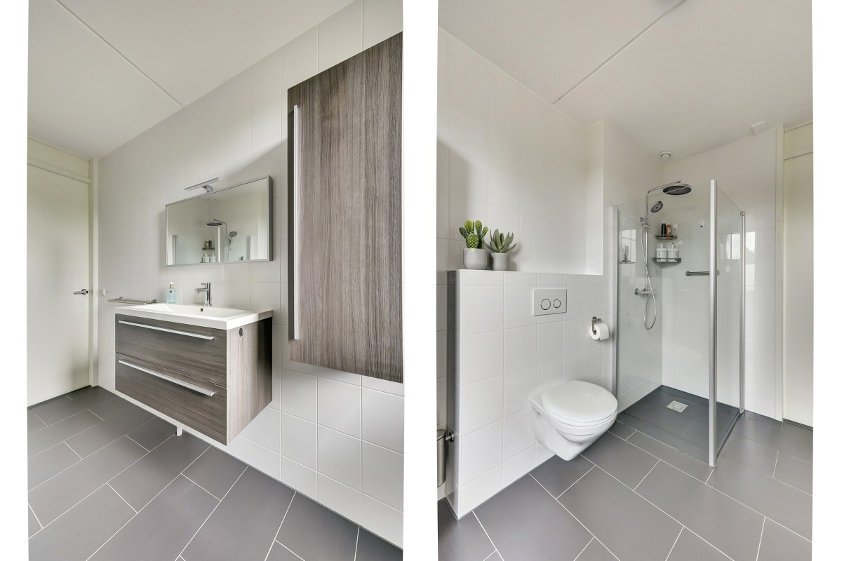 Eerste verdieping: overloop met aansluitend de slaapkamers en de badkamer. Aan de voorzijde van de woning is een ruime slaapkamer met daarnaast de badkamer gesitueerd. Aan de achterzijde bevinden zich nog 2 slaapkamers. De badkamer is modern betegeld en voorzien van een douche met cabine, 2e hangcloset en wastafelmeubel. De overloop en slaapkamers zijn voorzien van een moderne laminaatvloer.