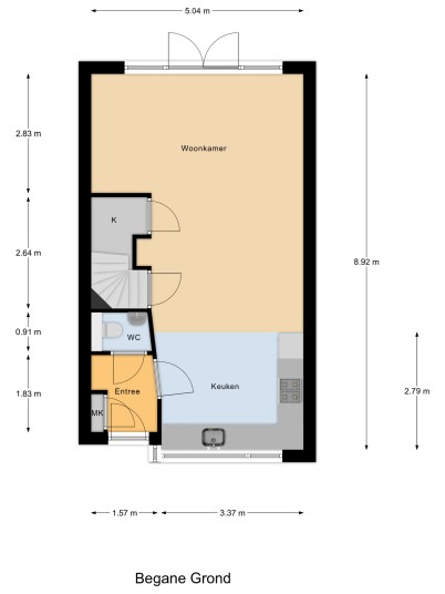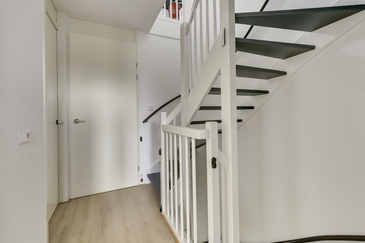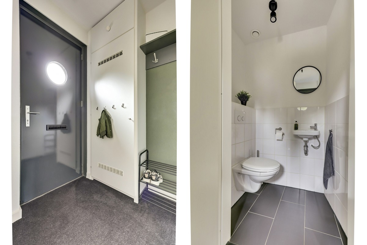 Begane grond: entree, hal met meterkast, garderobe en moderne toiletruimte met hangcloset en fonteintje, doorgang naar de woonkamer.