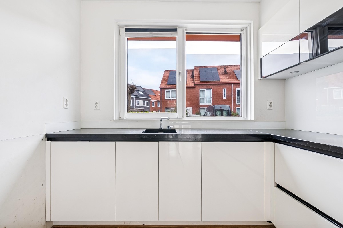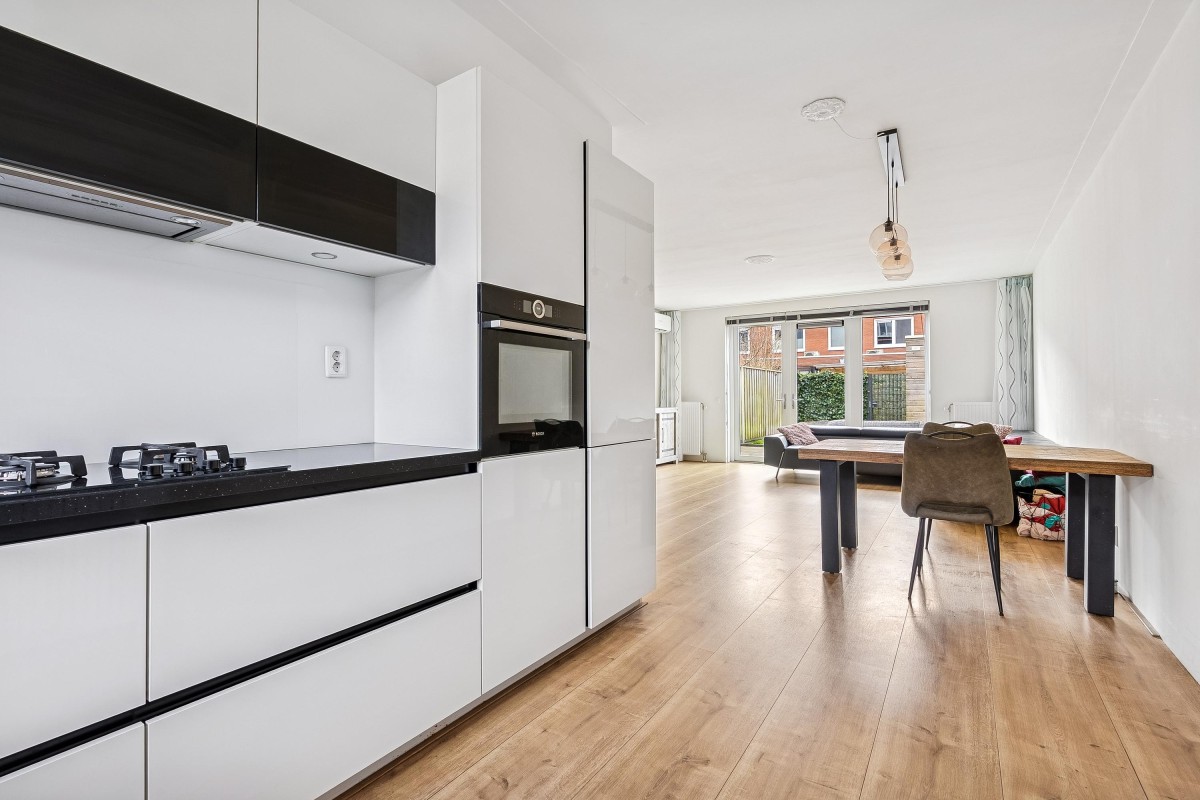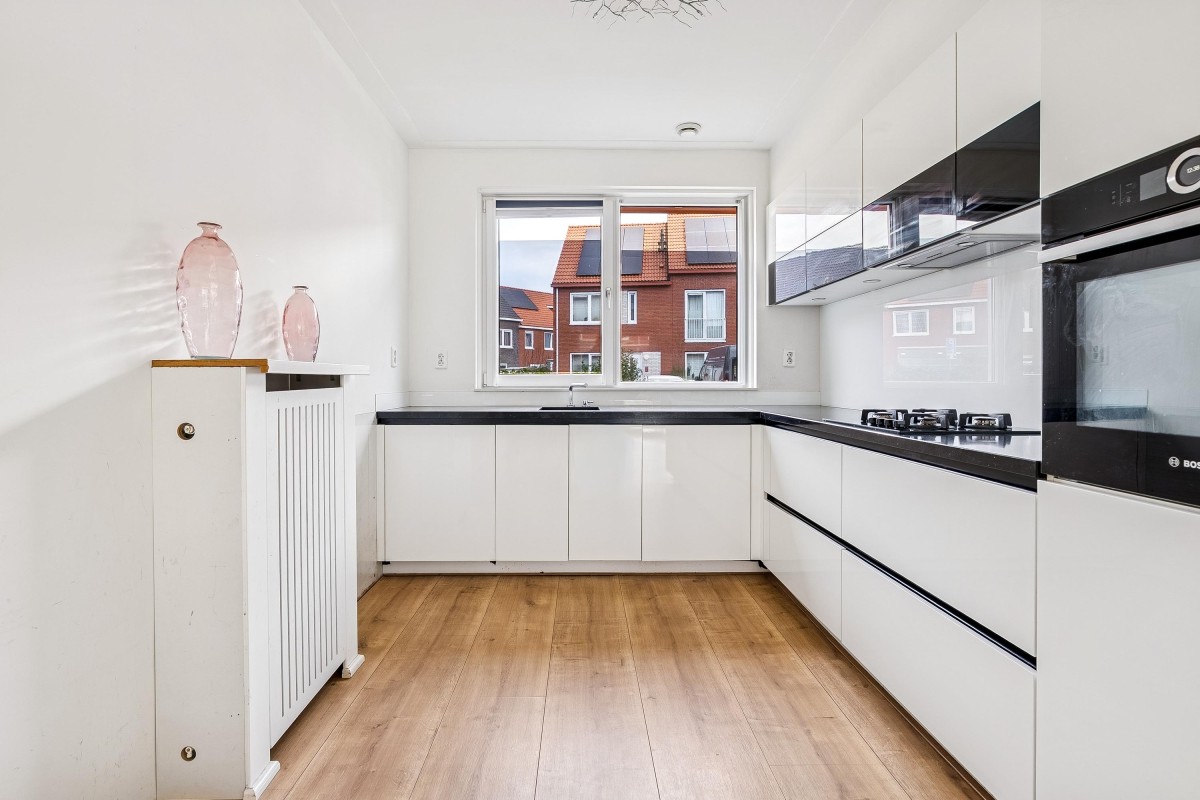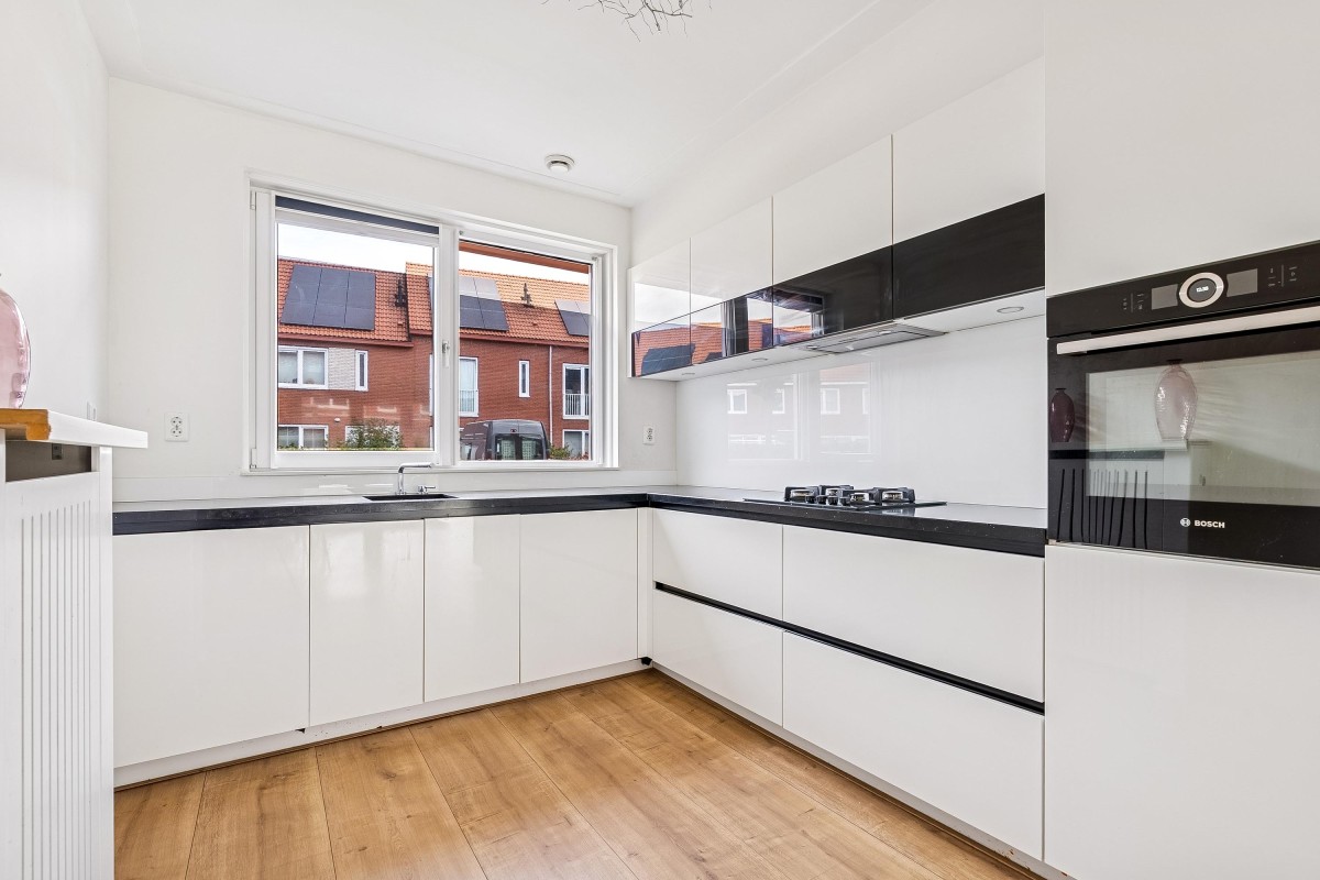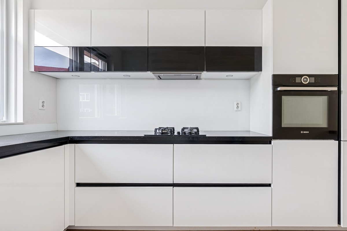 Aan de voorzijde van de woning bevindt zich de open keuken in praktische L-opstelling, uitgerust met diverse inbouwapparatuur: een vaatwasser, combi oven/magnetron, gasfornuis, koelkast en vriezer.