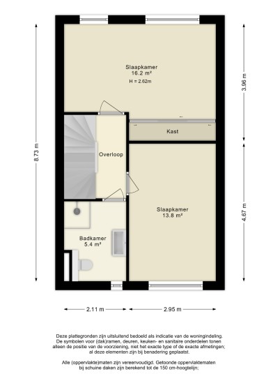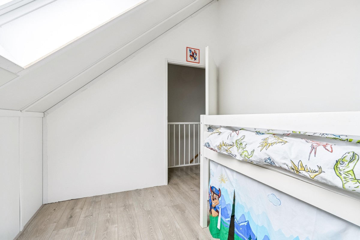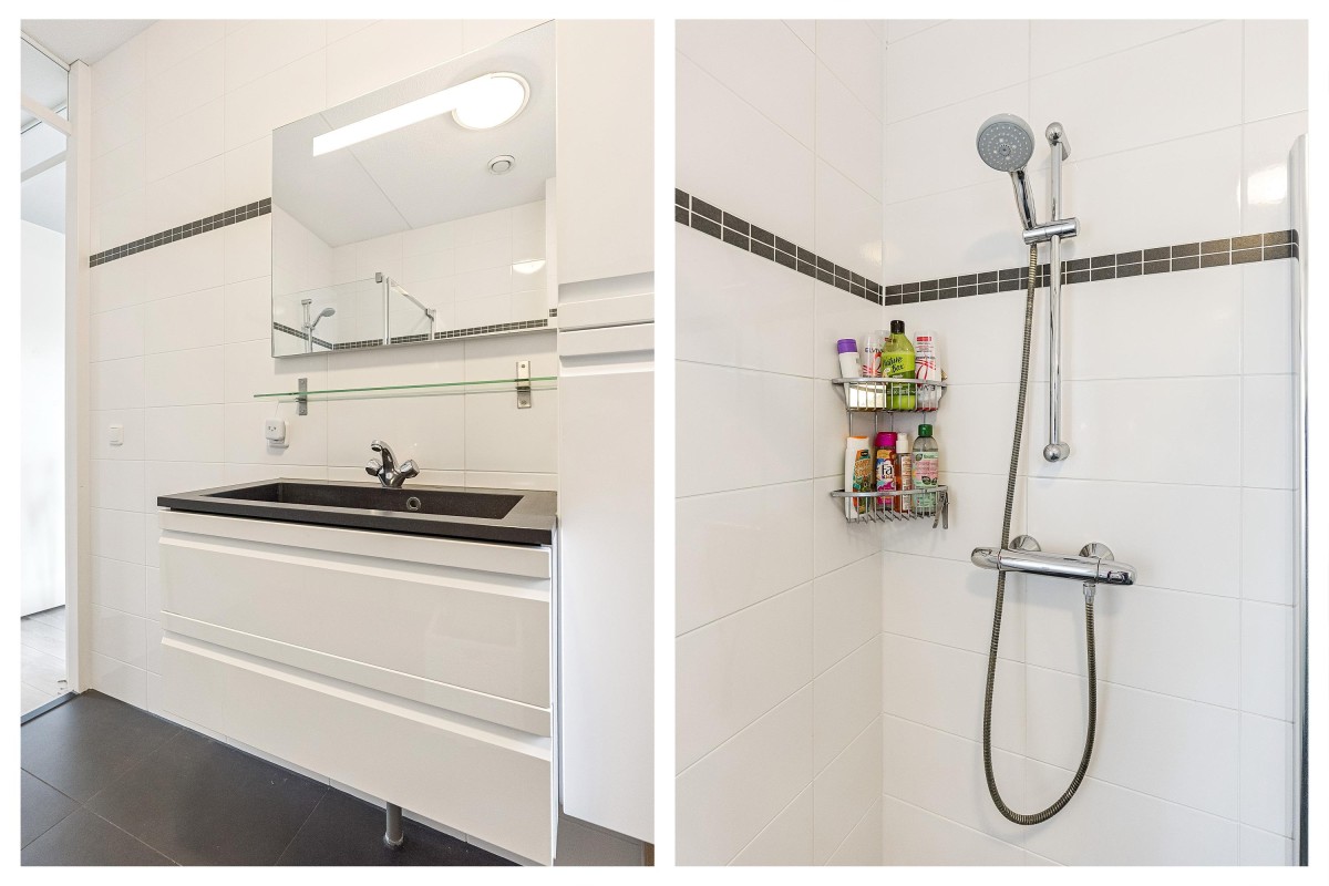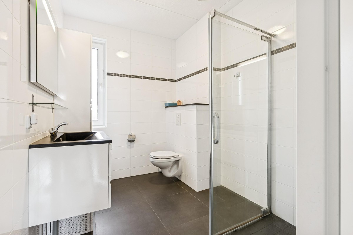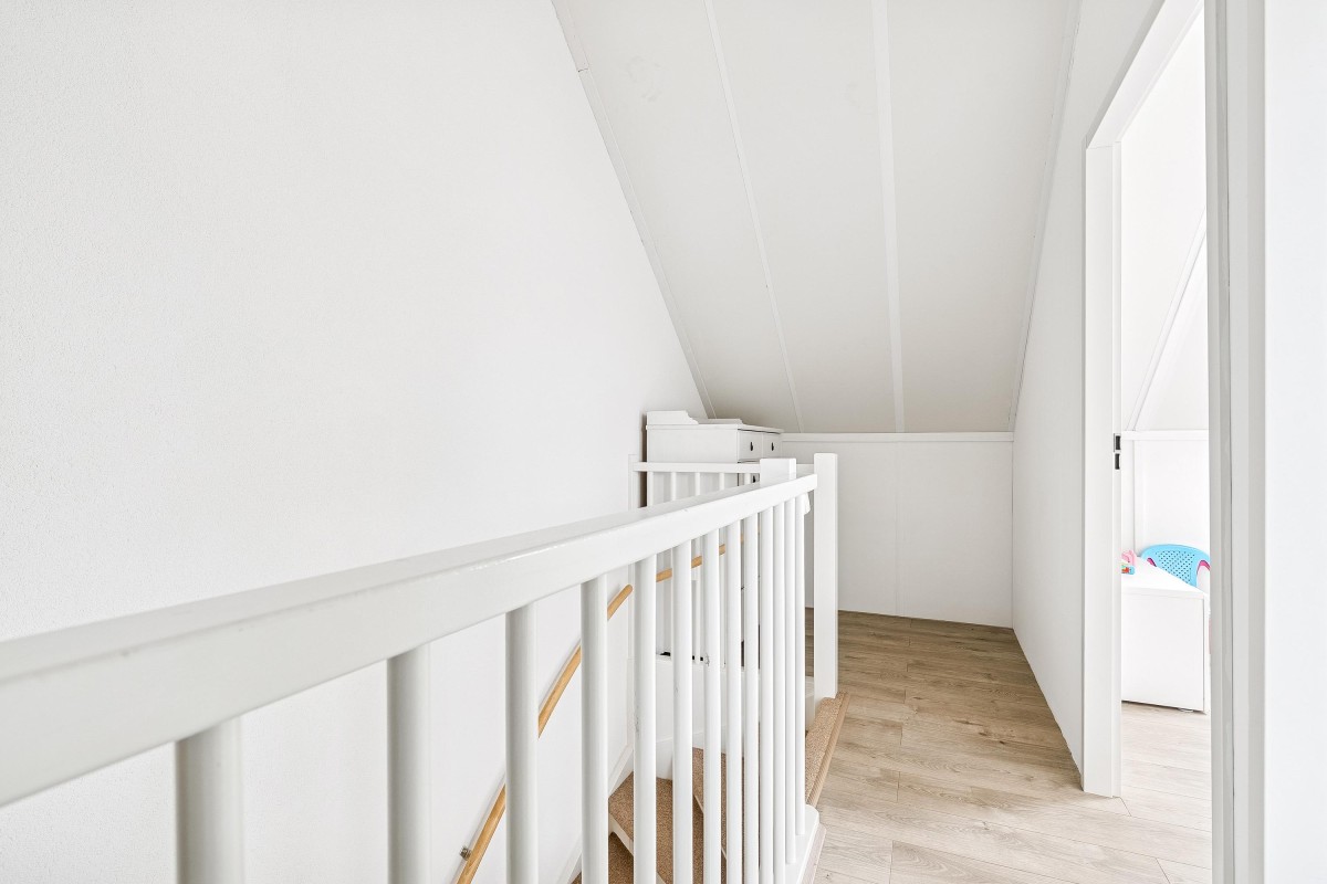 De ruime overloop biedt toegang tot twee slaapkamers van verschillende afmetingen en de nette badkamer. De badkamer is voorzien van een inloopdouche, een wastafelmeubel en een tweede toilet.