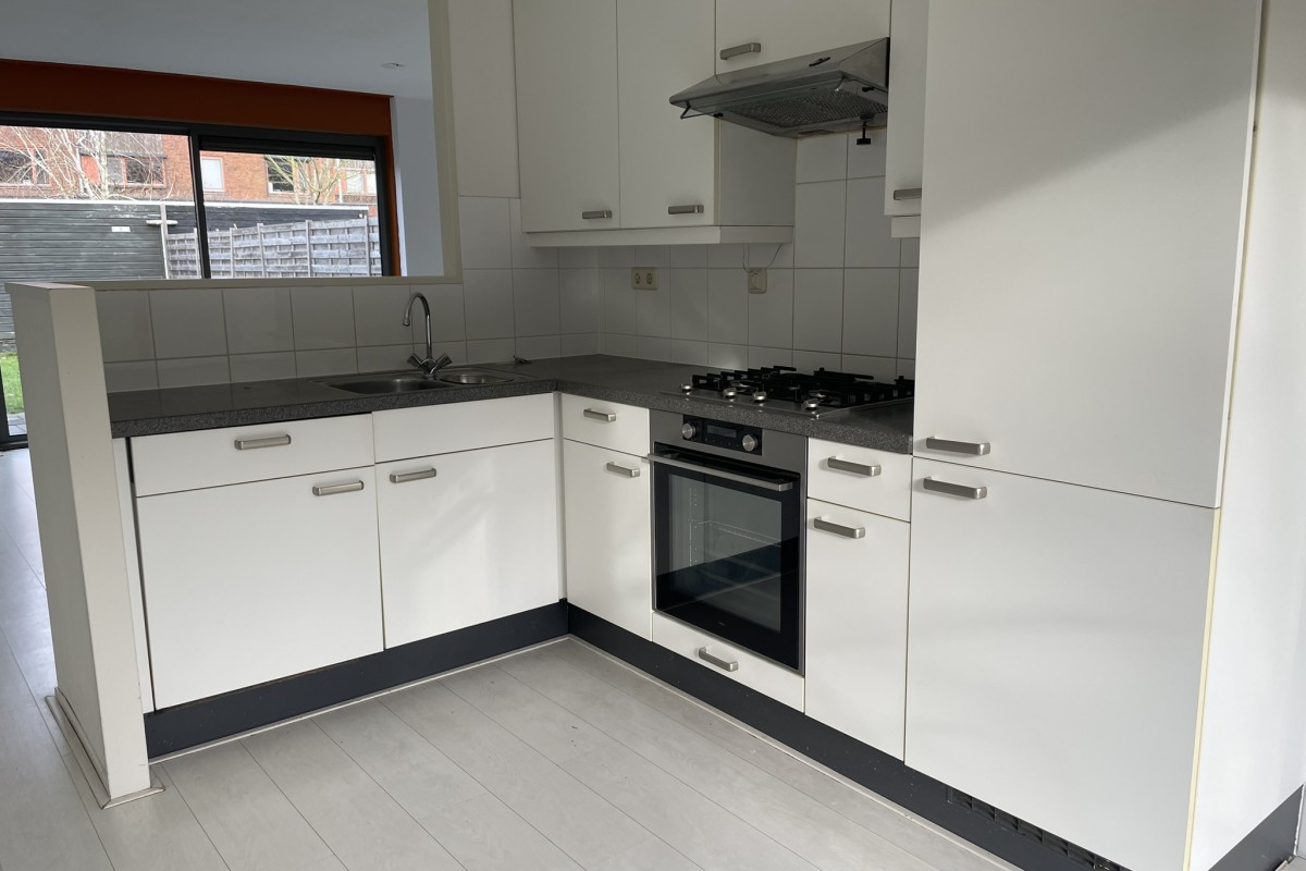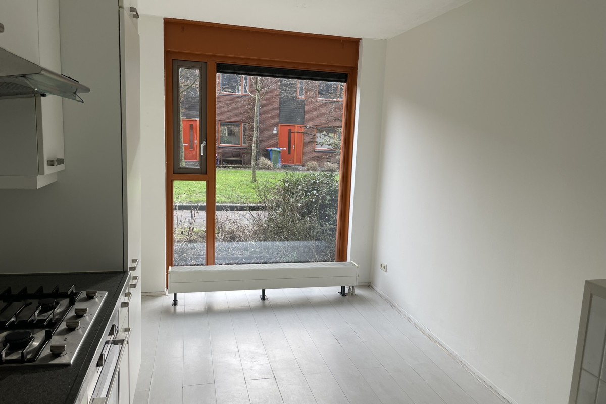 entree met toilet. Royale tuingerichte woonkamer over de volledige breedte van de woning, de hoekkeuken met inbouwapparatuur is centraal gesitueerd waardoor de eetkamer aan de voorzijde is gerealiseerd. Vanuit de woonkeuken is er uitzicht op de groenvoorziening.