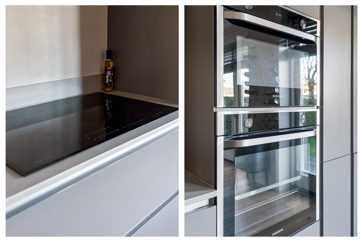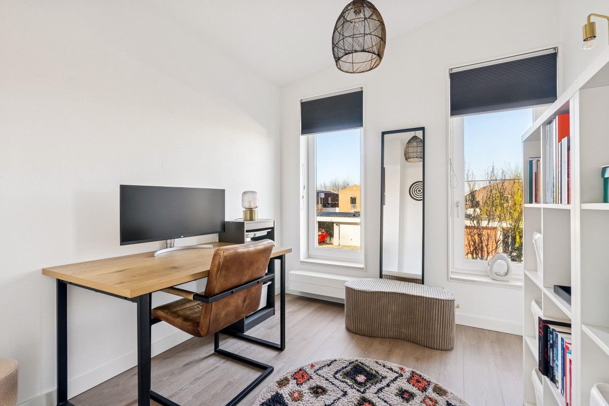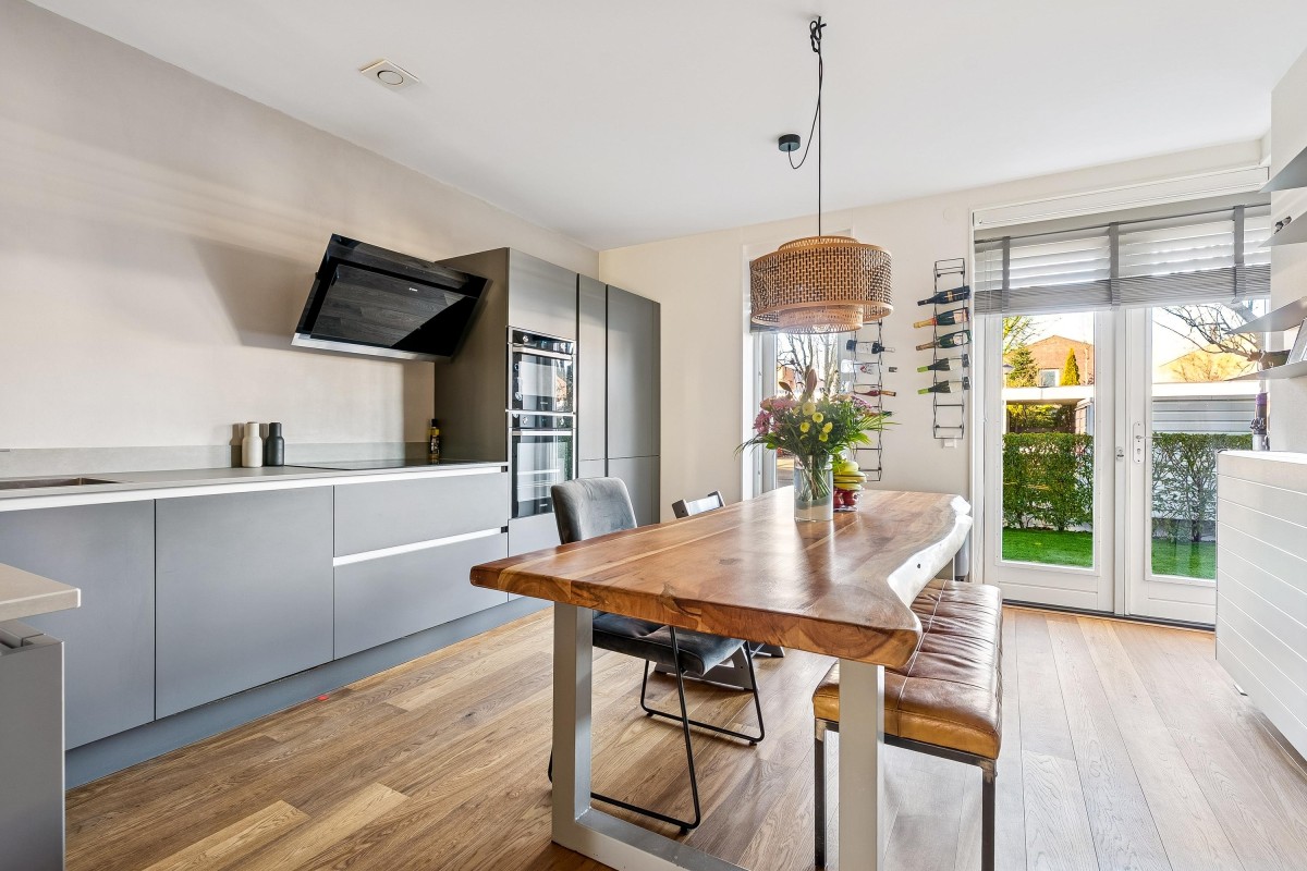 De woonkeuken bevindt zich aan de voorzijde van de woning en biedt voldoende ruimte voor een gezellige eettafel. De keuken is uitgerust met alle benodigde inbouwapparatuur, waaronder een koelkast, vriezer, oven, combi-oven/magnetron, inductiekookplaat, vaatwasser, Quooker en een keramiek werkblad. Vanuit de keuken heb je via dubbele openslaande deuren toegang tot de voortuin – perfect voor de zomermaanden.