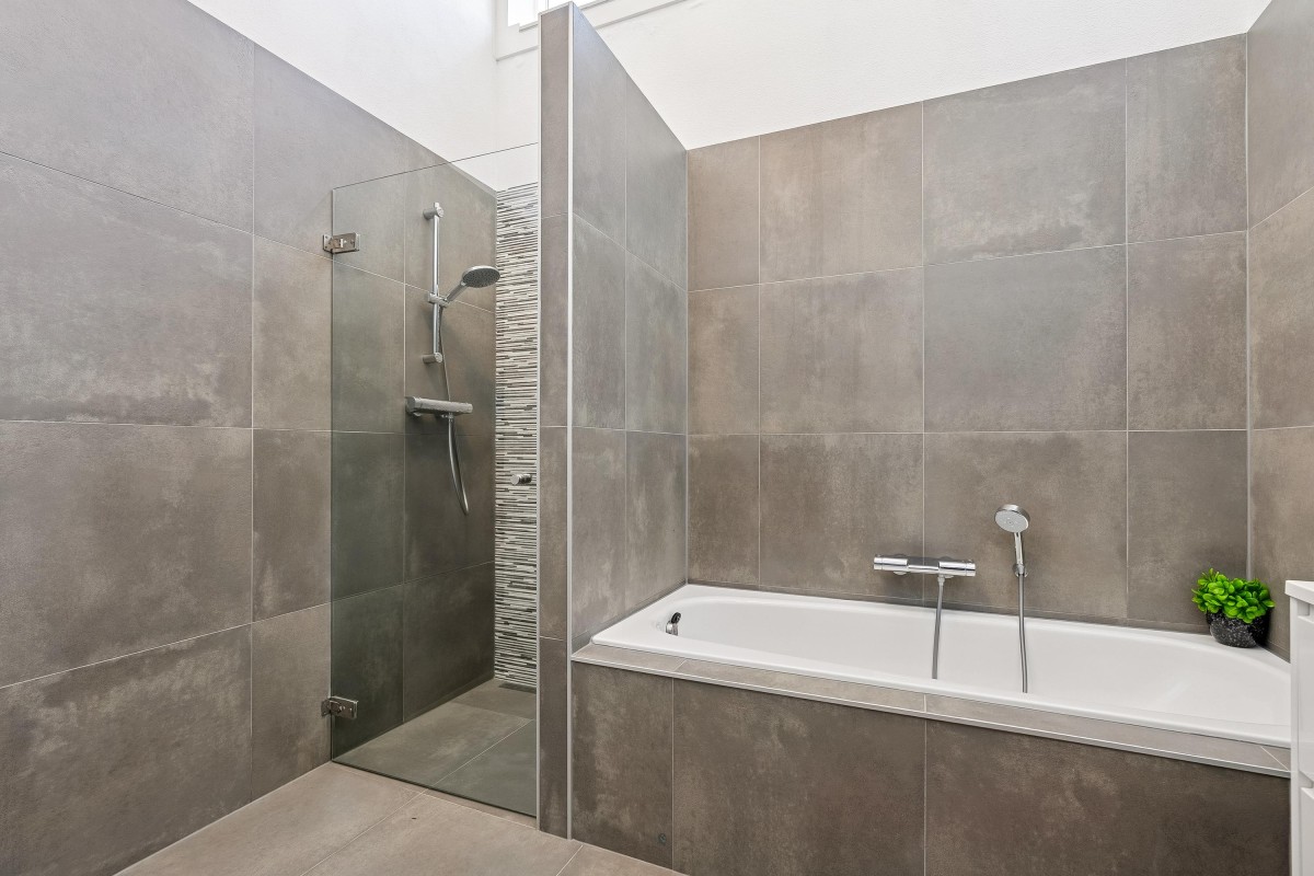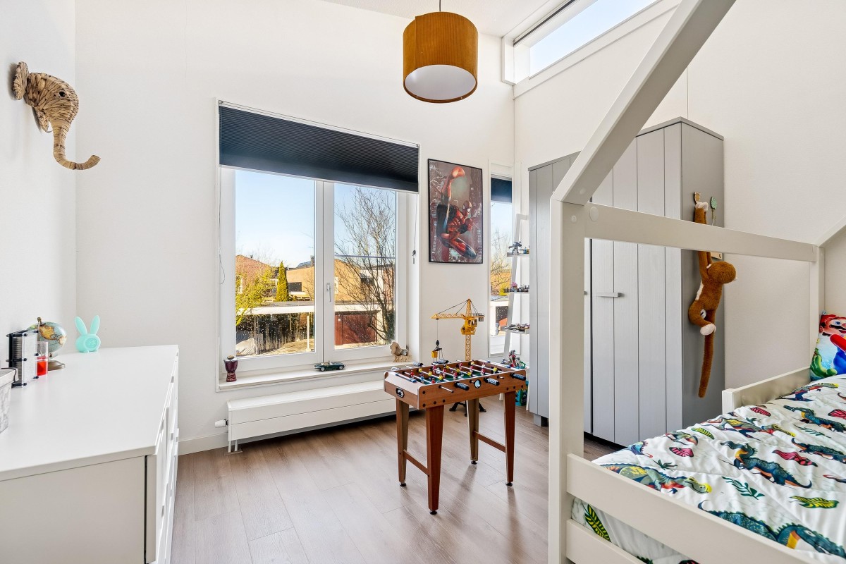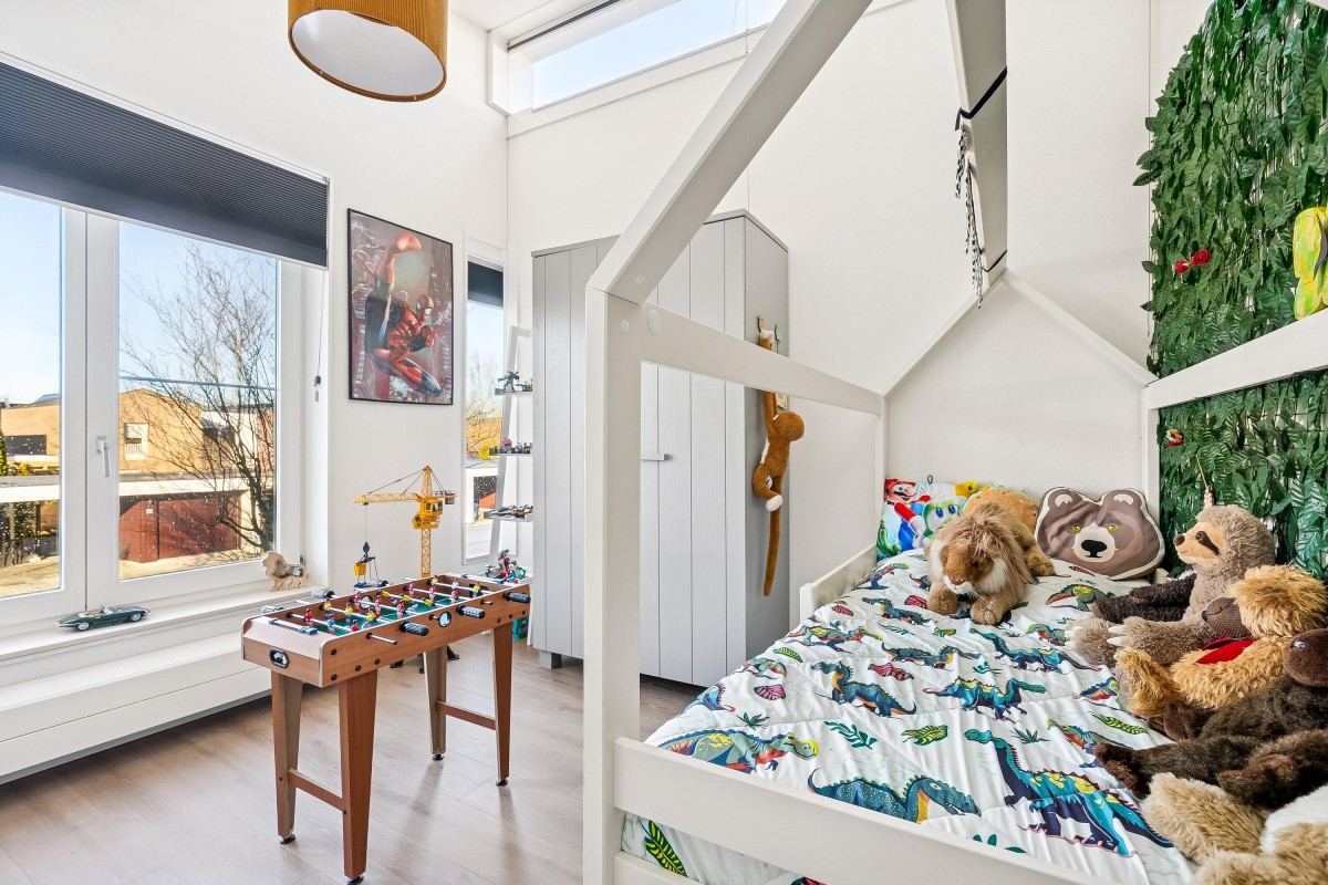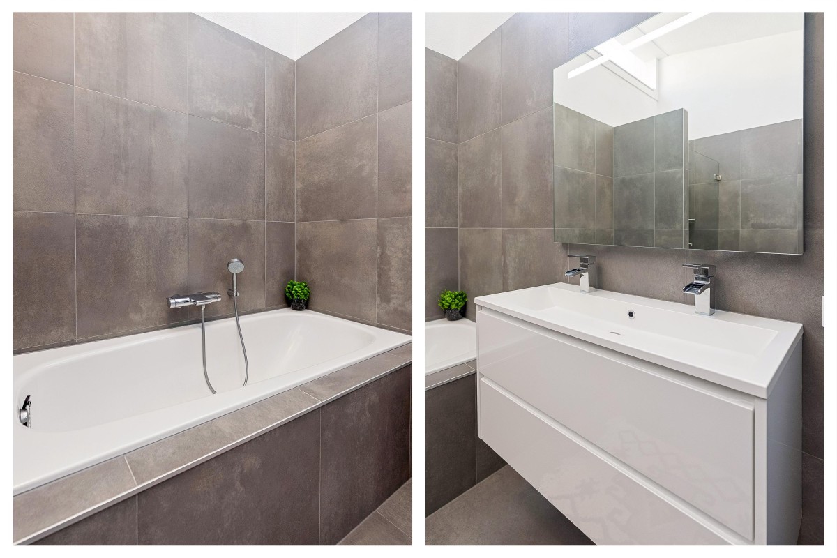 Overloop met vier prachtige slaapkamers. Dankzij het naar boven oplopende plafond voelt de verdieping zeer ruimtelijk aan en is perfect ingedeeld. De lichte badkamer heeft hetzelfde effect en is uitgerust met een ligbad, douchecabine, wastafelmeubel, toilet en nette betegeling. Alle kamers zijn voorzien van lange ramen die veel licht binnenlaten, wat zorgt voor een prachtig uitzicht aan de achterzijde van de woning door de gunstige ligging.