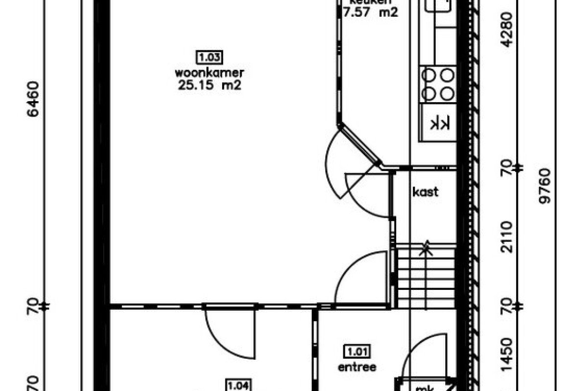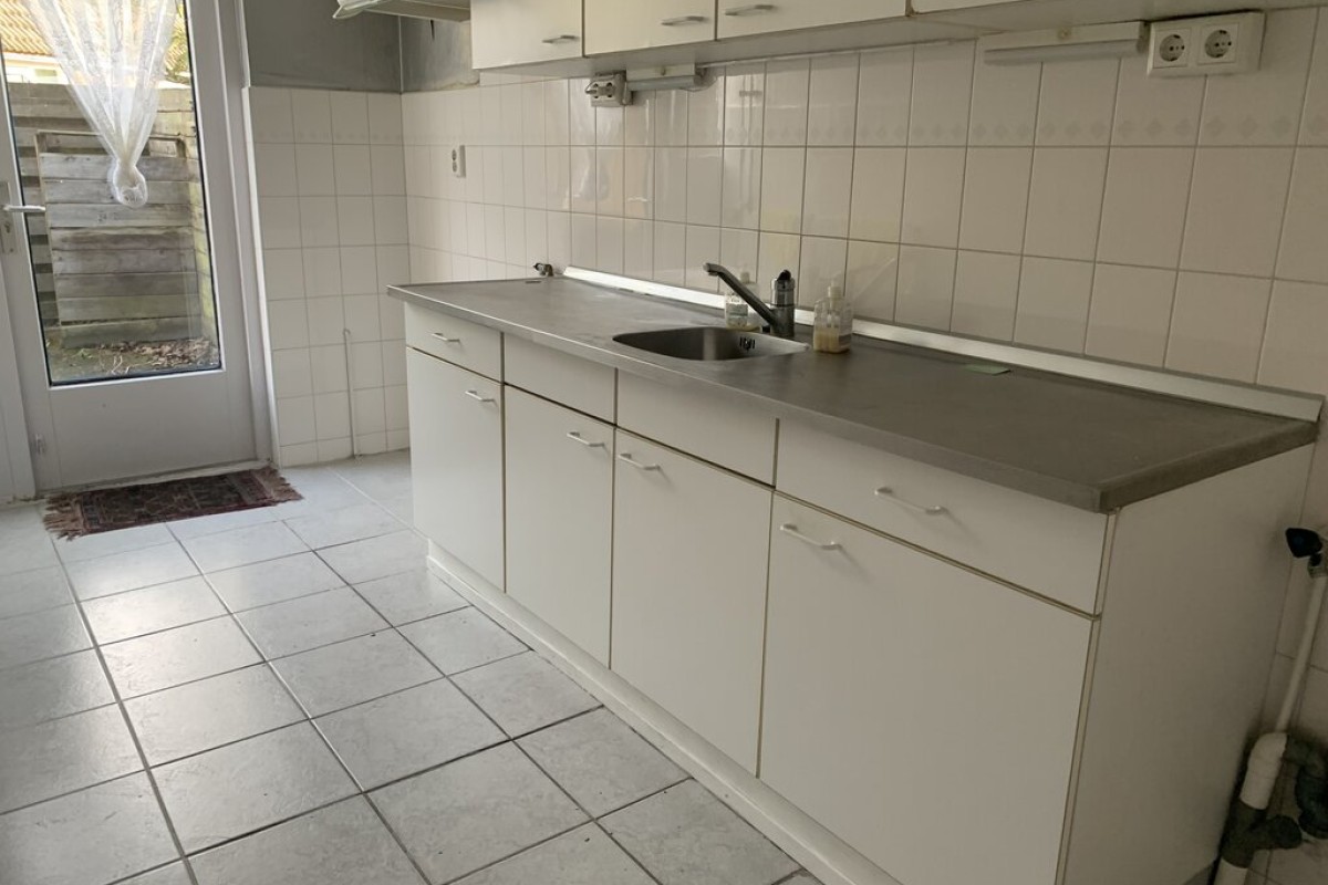 De dichte keuken heeft een standaard keukenblok. In de keuken dient een boiler geplaatst te worden voor het warmwater in de keuken, deze is niet meer aanwezig er is enkel een koudwater leiding in de keuken aanwezig.