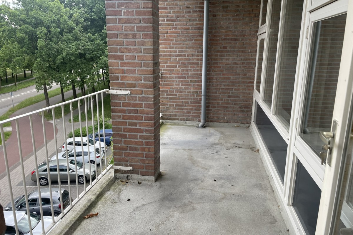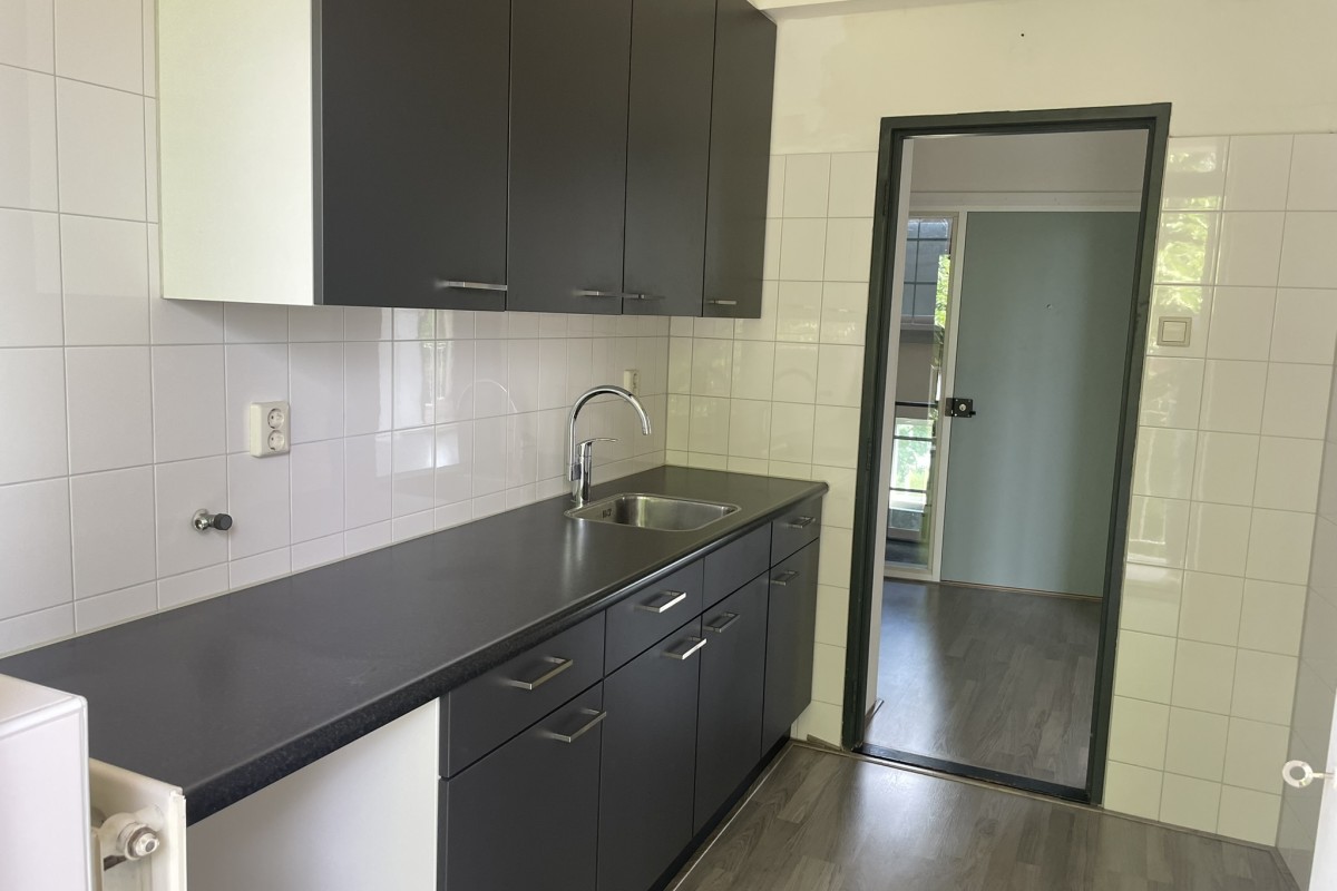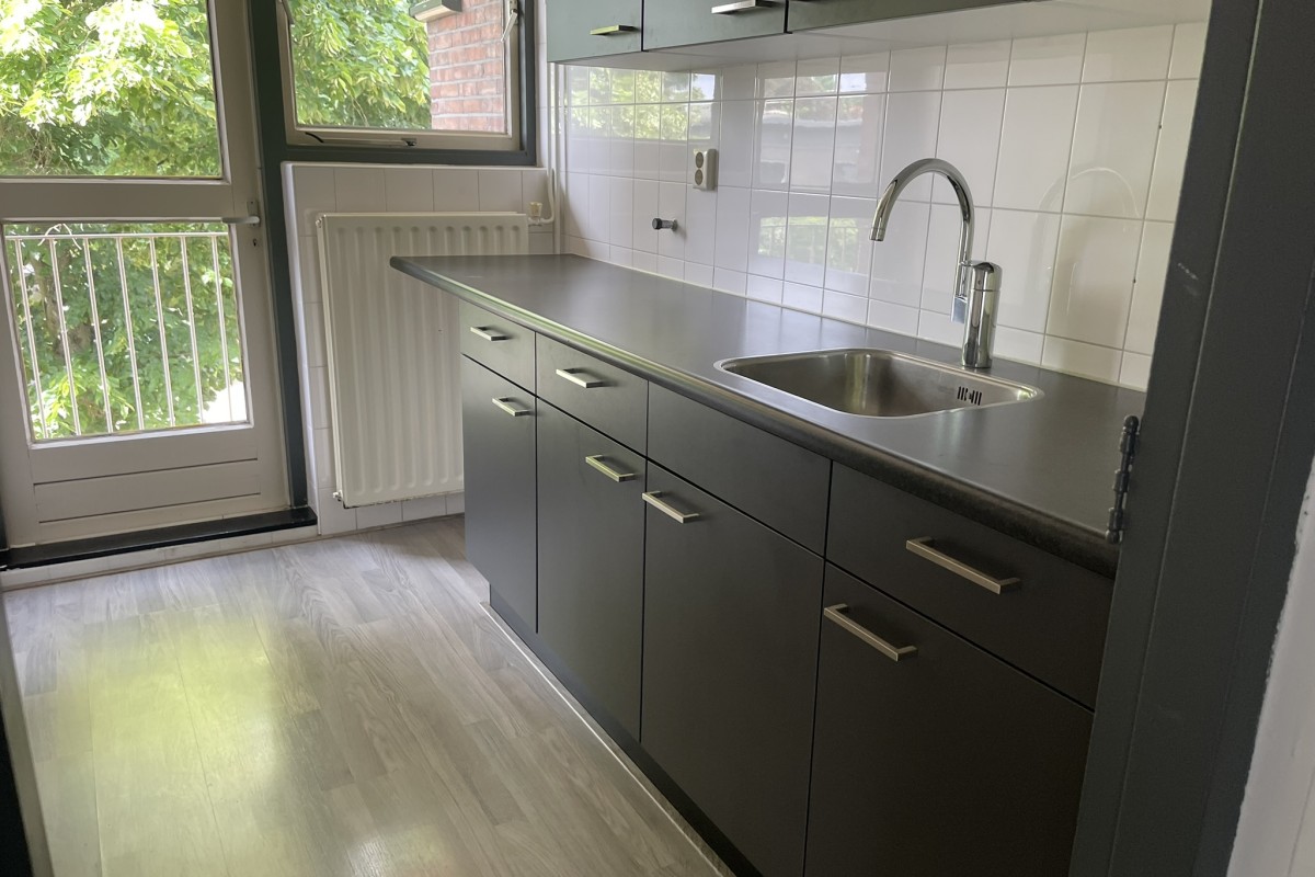 De keuken heeft een frisse, uitstraling met een donker werkblad en donkere kasten én een aansluiting voor de wasmachine. Op zonnige dagen en tijdens het koken zet u lekker de deur naar het tweede balkon open.