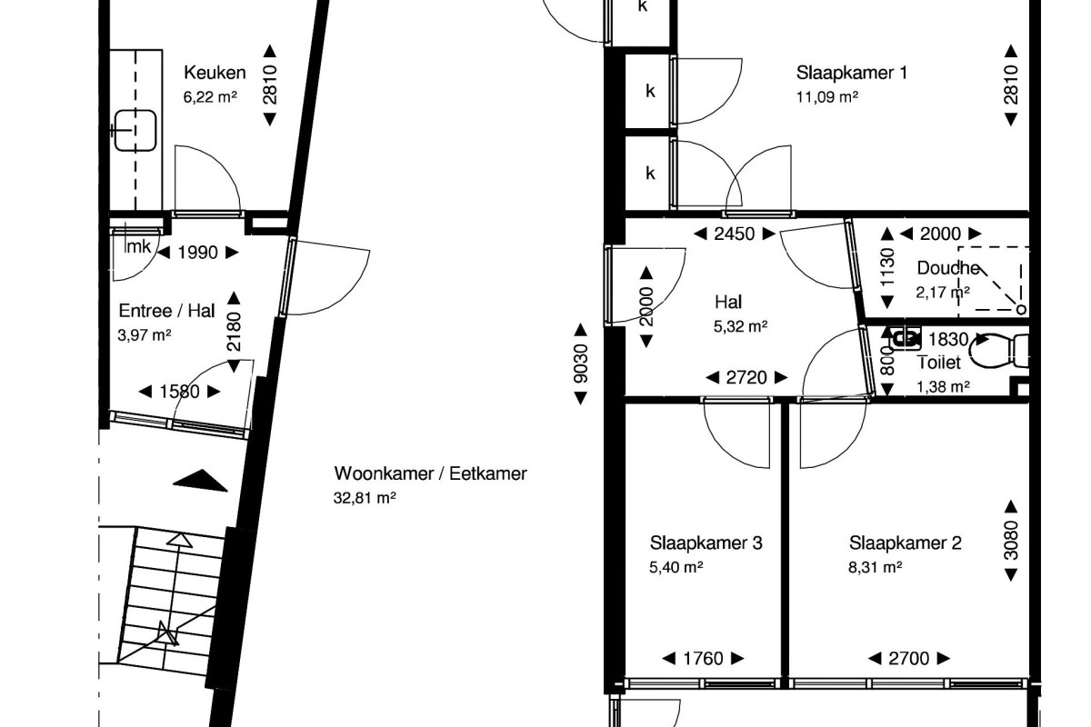 Vanuit de woonkamer leidt een aparte hal naar het slaapgedeelte. Hier bevinden zich drie slaapkamers in verschillende formaten. De hoofdslaapkamer beschikt over handige inbouwkasten en in alle kamers zorgen grote ramen voor een prettige lichtinval. De badkamer is praktisch ingericht, met een ruime inloopdouche en een wastafel. Het toilet is separaat en bevindt zich direct ernaast.