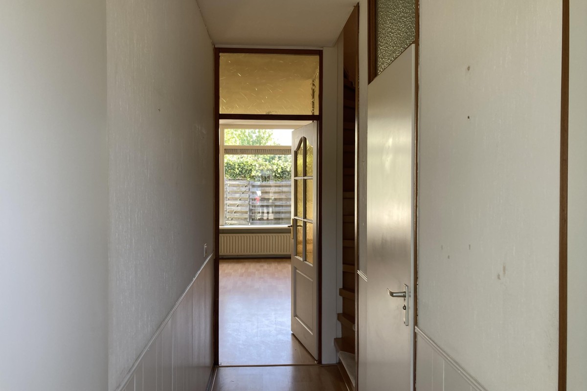 Begane grond: entree, hal met meterkast toiletruimte met toilet en fonteintje, volledig betegelde doucheruimte met douche en wastafel met planchet en spiegel, trapopgang en doorgang naar de woonkamer. De tuingerichte woonkamer met praktische trapkast biedt toegang tot de bijkeuken met opstelplaats voor de wasmachine alsmede de open keuken.