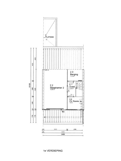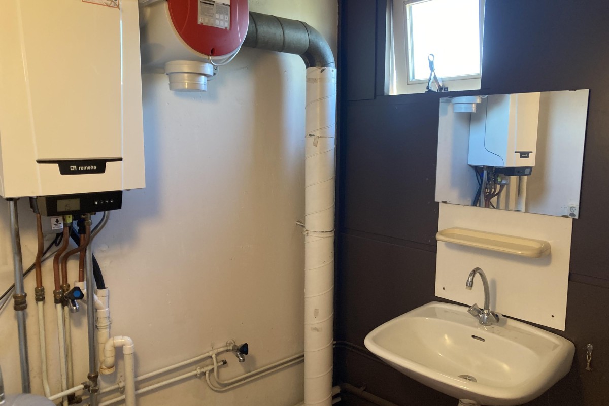 Eerste verdieping: overloop met aansluitend een tweede royale slaapkamer over bijna de volle diepte van de woning, een ruimte met een wastafel, de opstelling van de c.v.-ketel, mechanische ventilatie en nog een ruime separate bergruimte. De vloer op de etage is voorzien van een vinyl vloer.