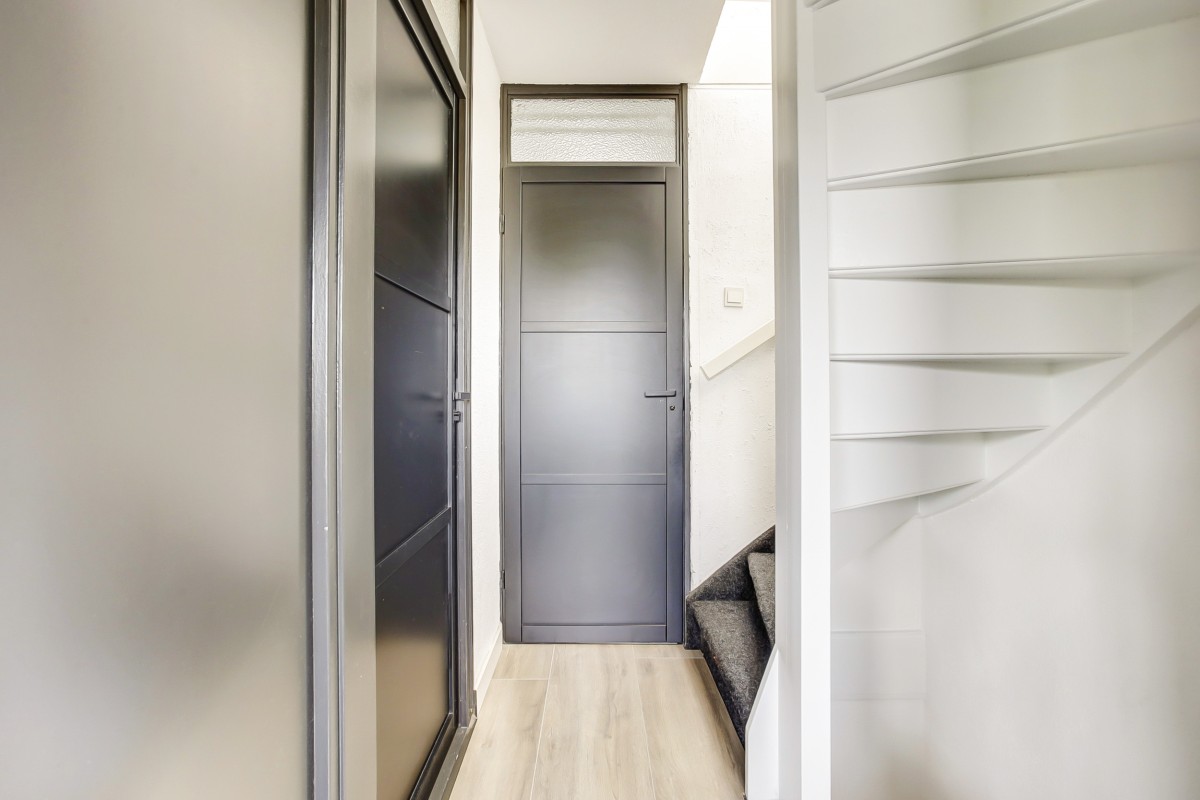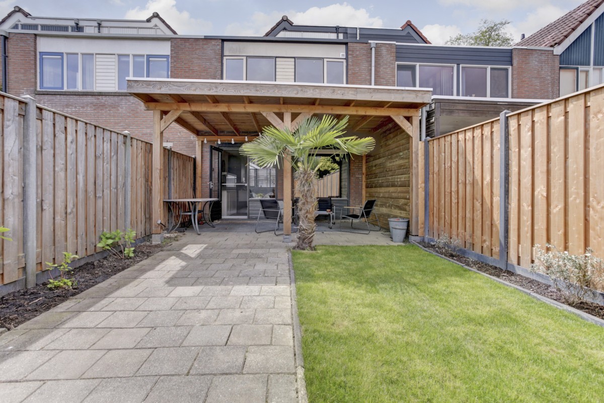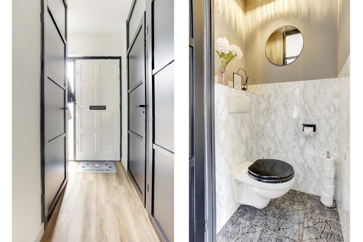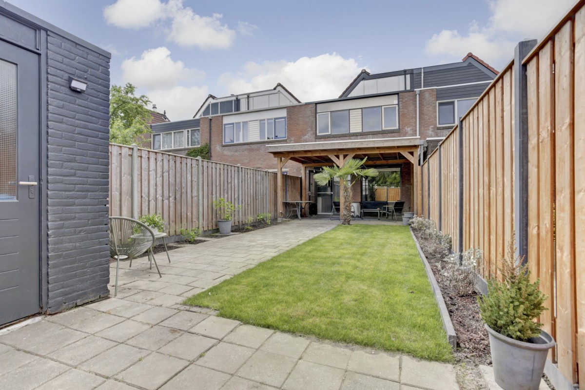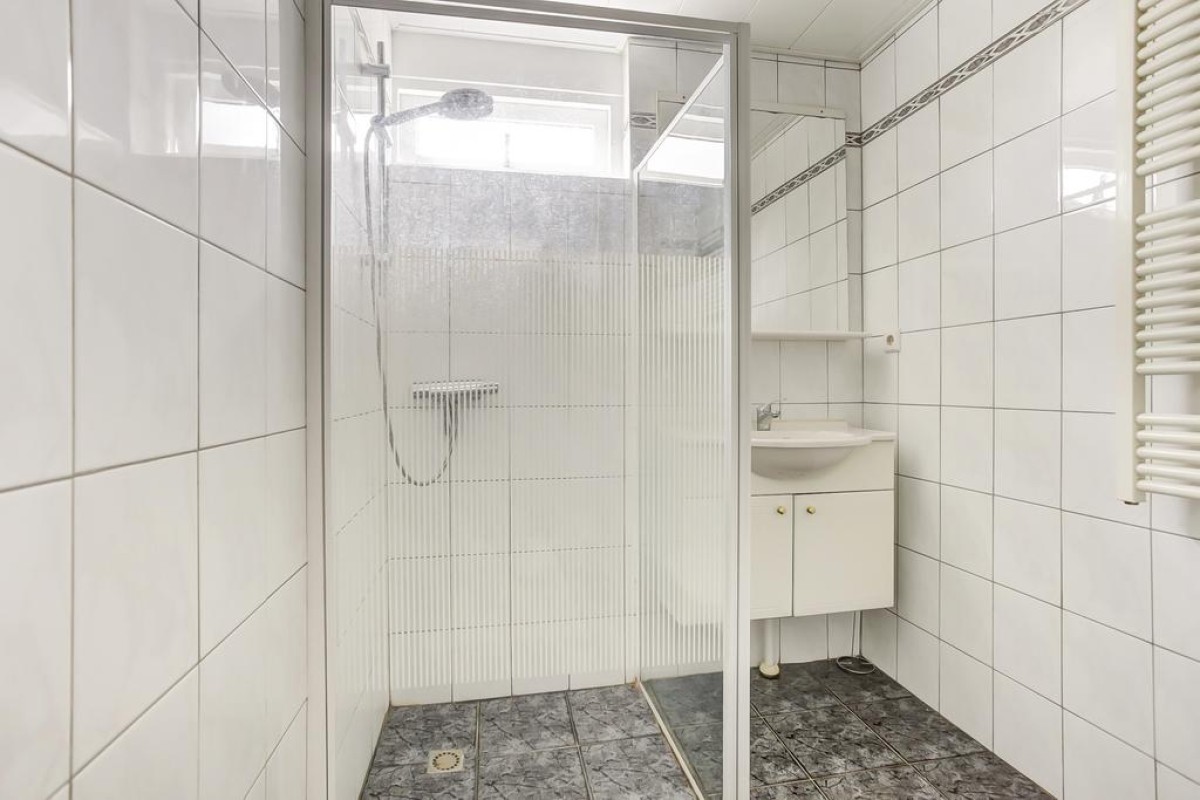 Begane grond: entree, hal met mooie zwarte designdeuren, gemoderniseerde meterkast, voorraadkast met garderobe, toiletruimte met hangcloset met fonteintje en doorgang naar de woonkamer. De tuingerichte woonkamer beschikt over een loopdeur naar het overdekte terras. Tegen de achtergevel is recent een nieuwe overkapping gerealiseerd. De tuin is fraai aangelegd, maar liefst 17 meter diep en voorzien van nieuwe schuttingen, een achterom en vrijstaande stenen berging. Aan de voorzijde van de woning is de nieuwe keuken gesitueerd. De keuken is in een hoek opgesteld en voorzien van veel kastruimte, een groot werkblad en ingebouwde koelkast, vrieskast, vaatwasser, close-in-boiler, combi-oven en een gaskookplaat met afzuiging. De begane grondvloer beschikt over een nieuwe pvc-vloer.