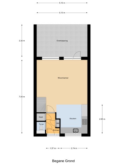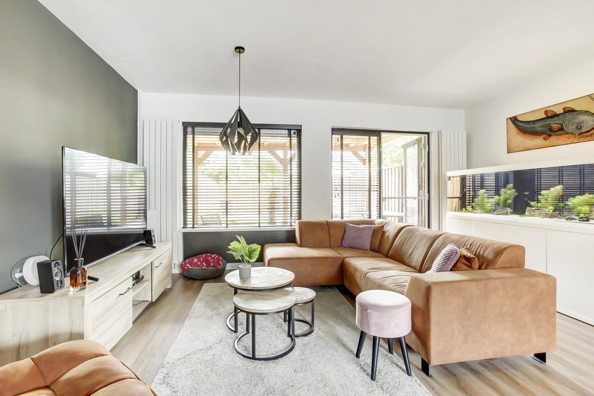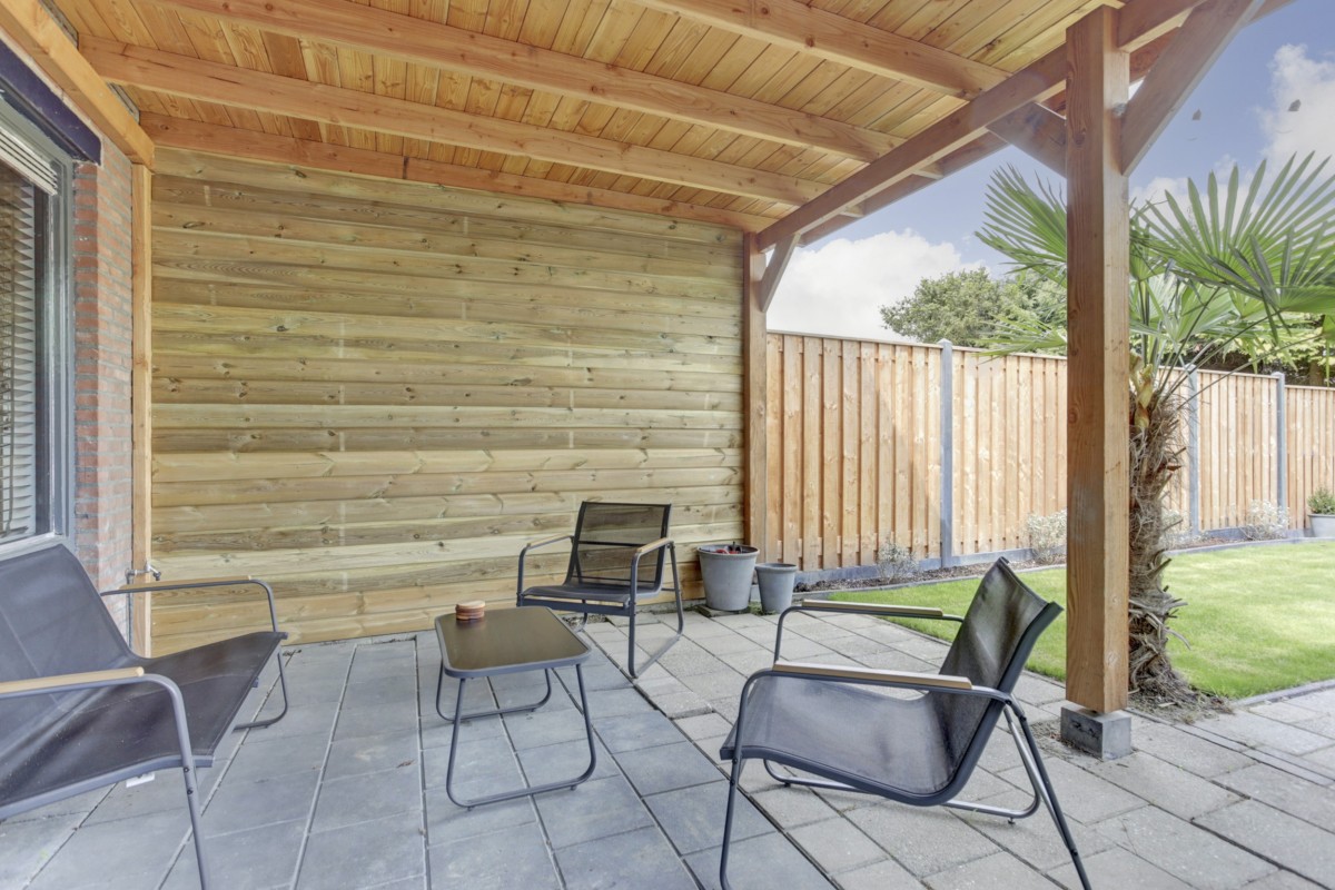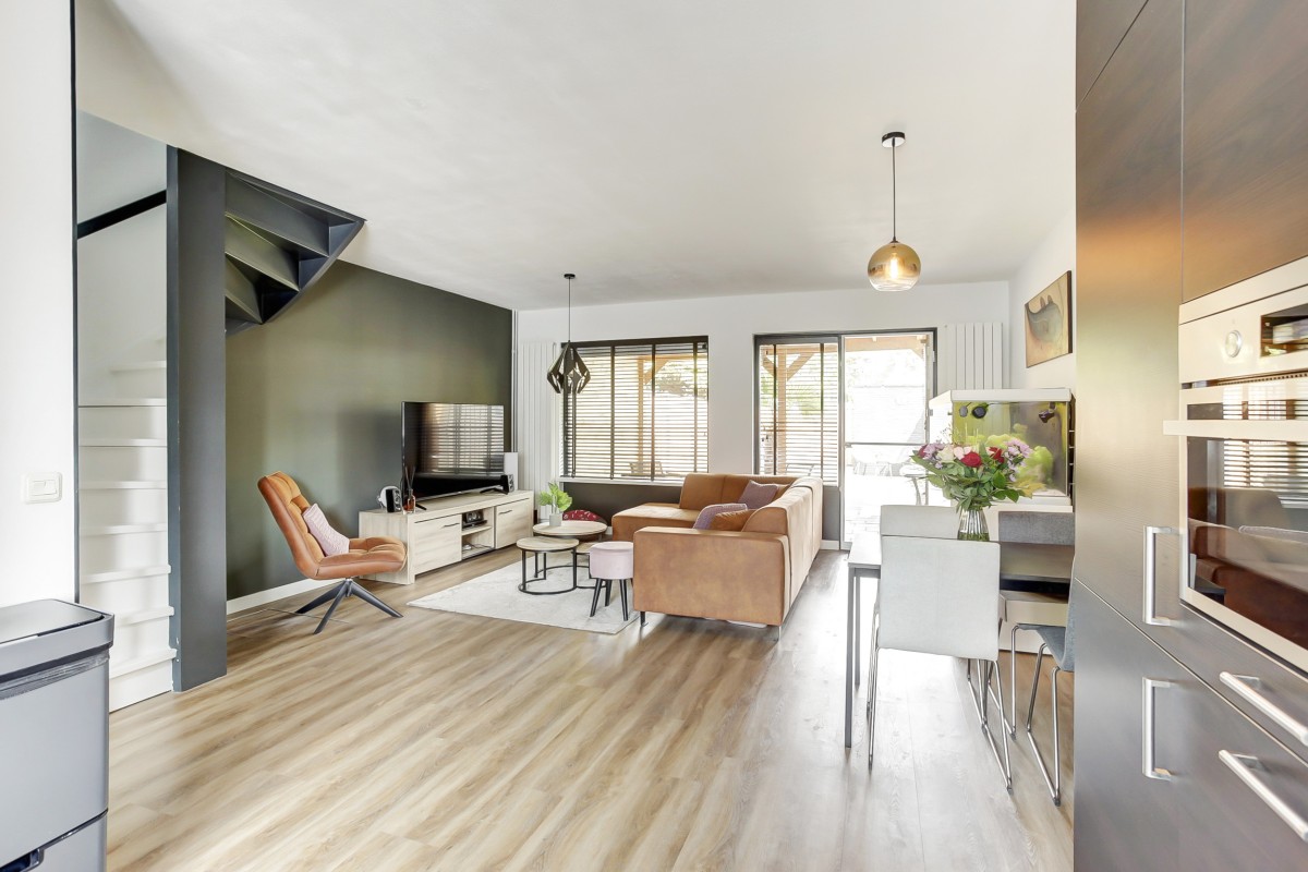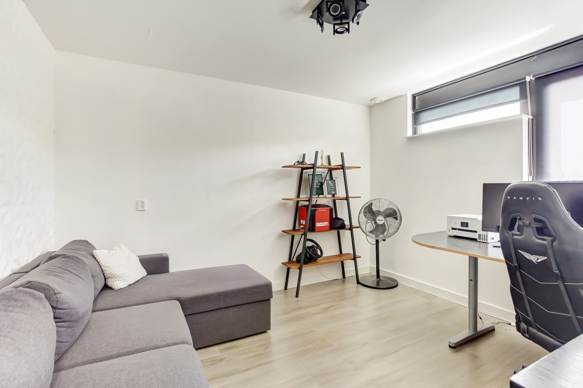 Begane grond: entree, hal met mooie zwarte designdeuren, gemoderniseerde meterkast, voorraadkast met garderobe, toiletruimte met hangcloset met fonteintje en doorgang naar de woonkamer. De tuingerichte woonkamer beschikt over een loopdeur naar het overdekte terras. Tegen de achtergevel is recent een nieuwe overkapping gerealiseerd. De tuin is fraai aangelegd, maar liefst 17 meter diep en voorzien van nieuwe schuttingen, een achterom en vrijstaande stenen berging. Aan de voorzijde van de woning is de nieuwe keuken gesitueerd. De keuken is in een hoek opgesteld en voorzien van veel kastruimte, een groot werkblad en ingebouwde koelkast, vrieskast, vaatwasser, close-in-boiler, combi-oven en een gaskookplaat met afzuiging. De begane grondvloer beschikt over een nieuwe pvc-vloer.