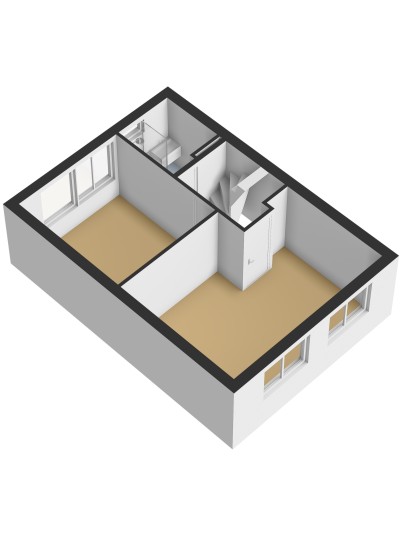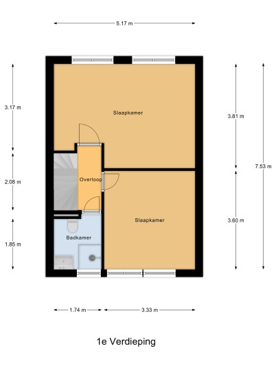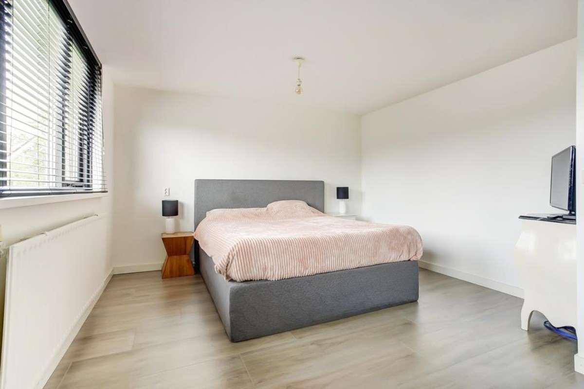 Eerste verdieping: overloop met eveneens mooie zwarte designdeuren welke toegang geven tot de slaapkamer en badkamer. De twee slaapkamers hebben beide een mooie maatvoering en zijn indien gewenst te splitsen in 3 slaapkamers. De slaapkamers en overloop beschikken over een moderne laminaatvloer. De badkamer is voorzien van een douche met cabine, wastafel met meubel en een tweede hangcloset.
