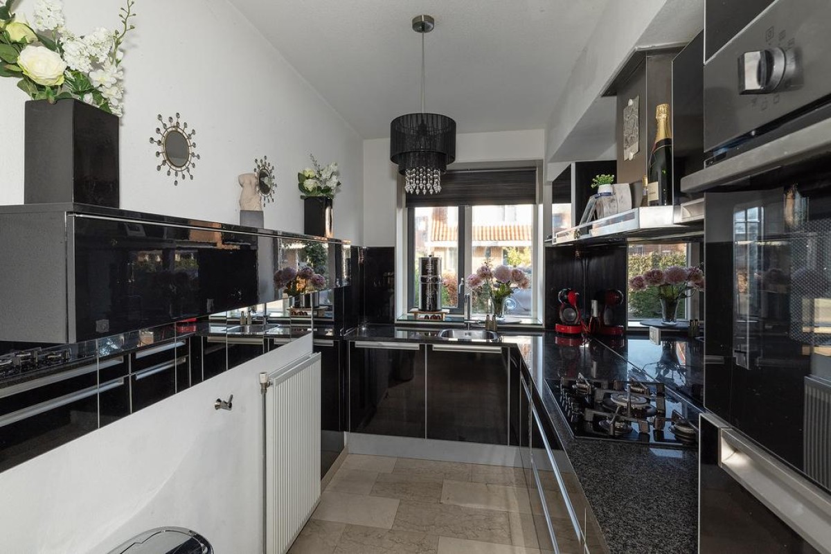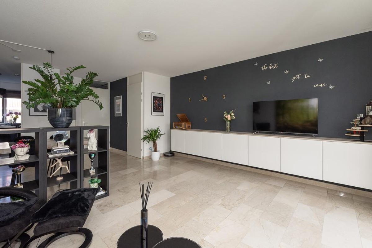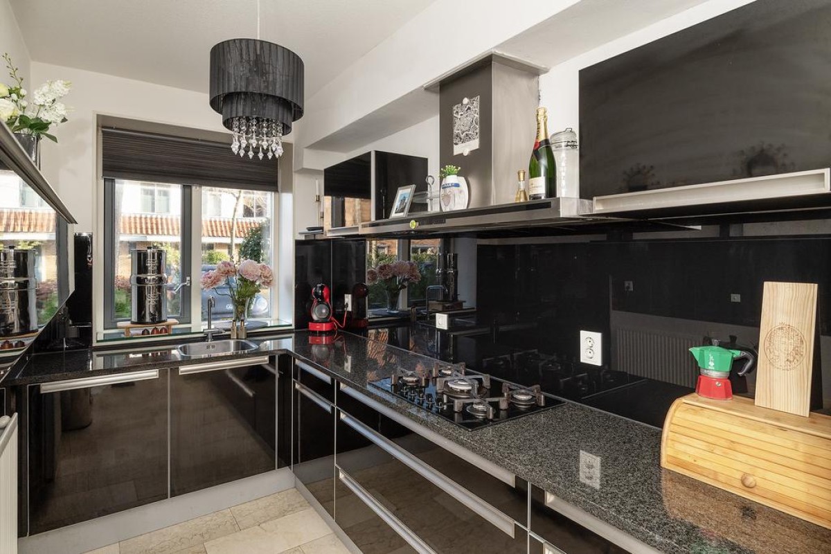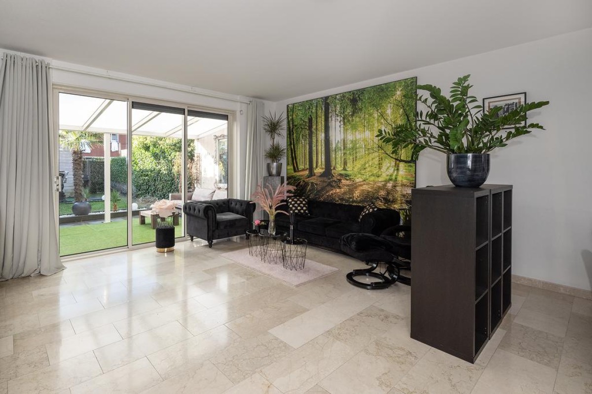 Entree/hal, Trapopgang, meterkast en het toilet met fonteintje. Ruime uitgebouwde L-vormige woonkamer met een prachtige marmeren vloer. Middels de schuifpui komt u in de zonnige achtertuin. De openkeuken is voorzien van alle gemakken, namelijk: vaatwasser ( vernieuwd in 2022), combi-oven ( vernieuwd in 2022 ), koelkast, 5 pits gaskookstel en een afzuigkap.