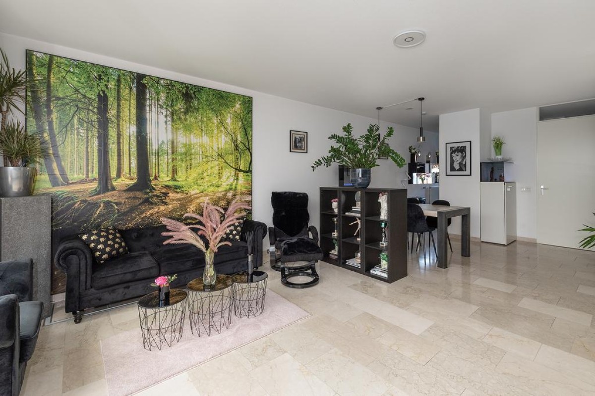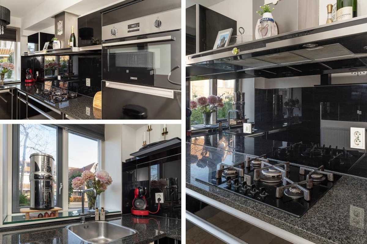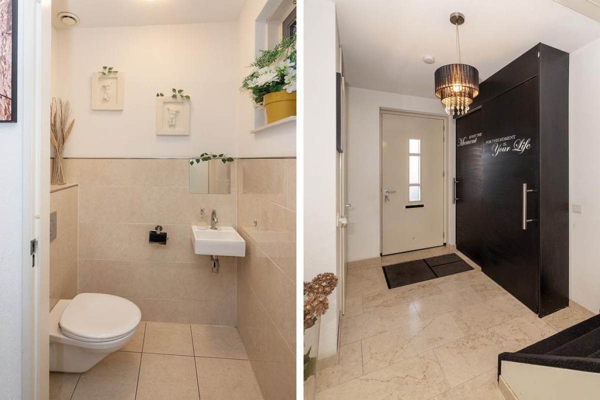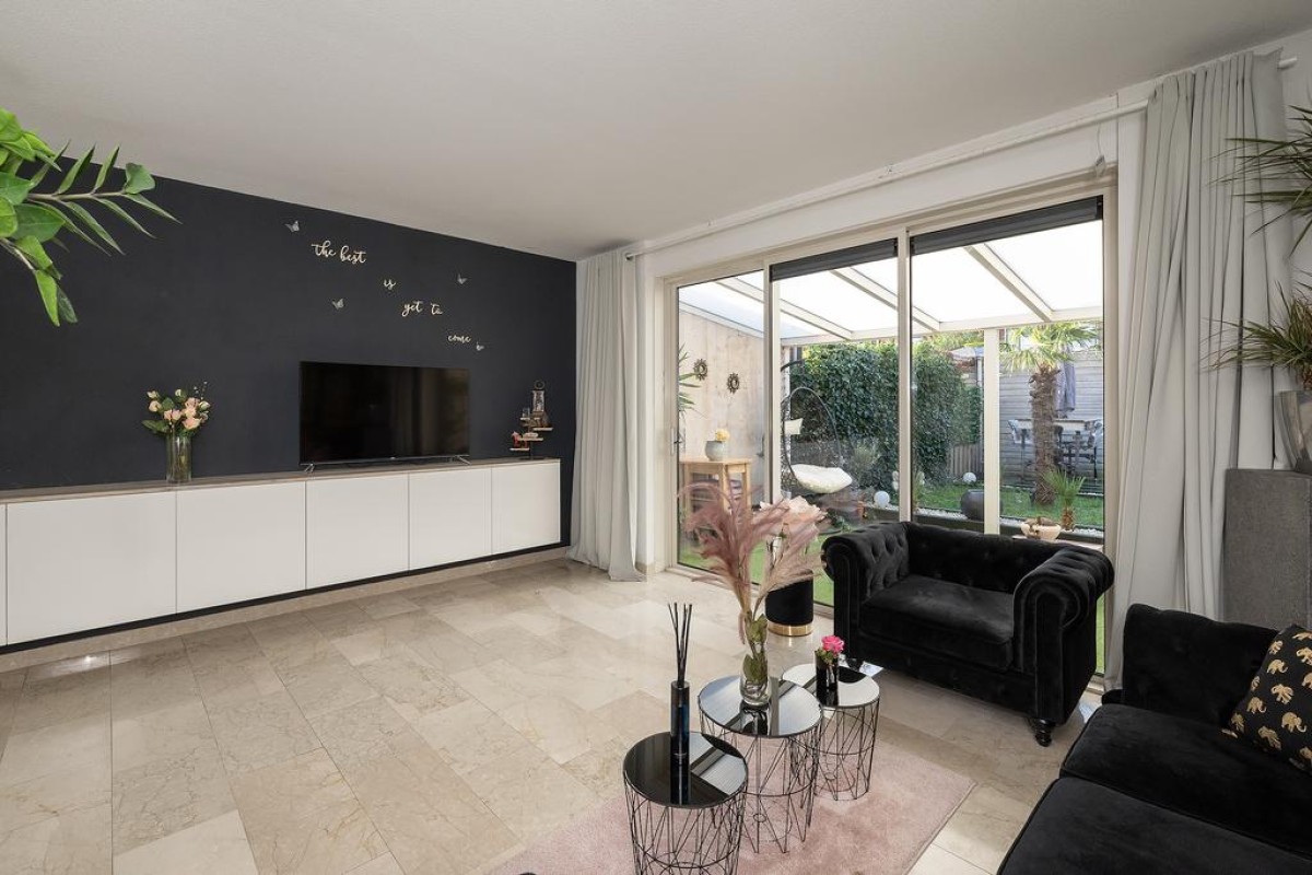 Entree/hal, Trapopgang, meterkast en het toilet met fonteintje. Ruime uitgebouwde L-vormige woonkamer met een prachtige marmeren vloer. Middels de schuifpui komt u in de zonnige achtertuin. De openkeuken is voorzien van alle gemakken, namelijk: vaatwasser ( vernieuwd in 2022), combi-oven ( vernieuwd in 2022 ), koelkast, 5 pits gaskookstel en een afzuigkap.