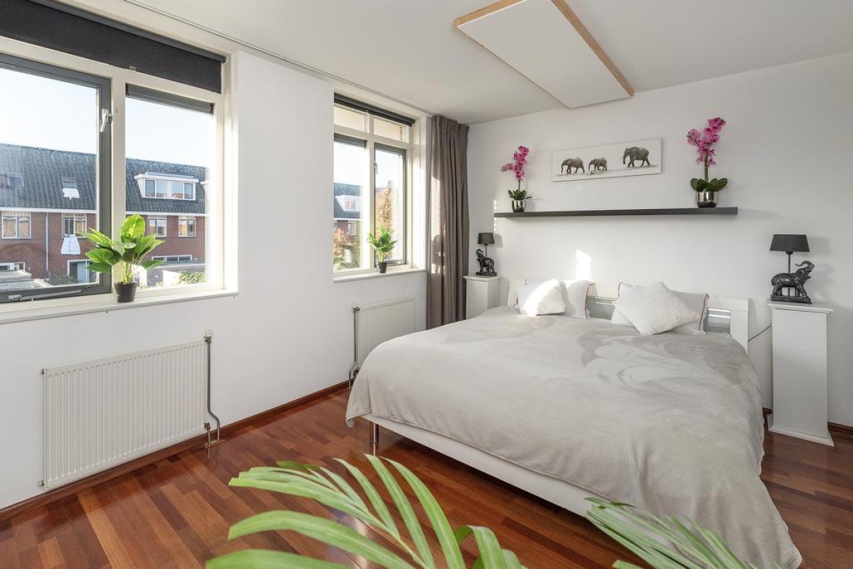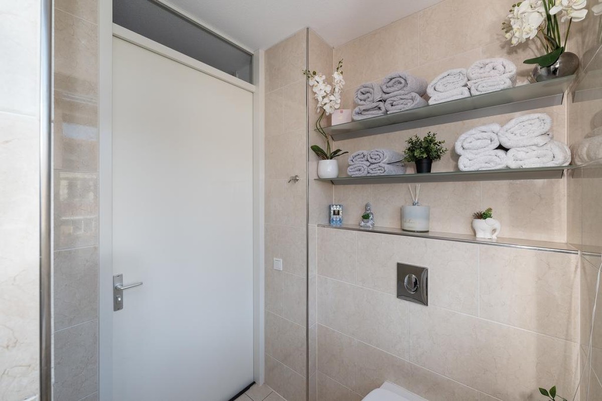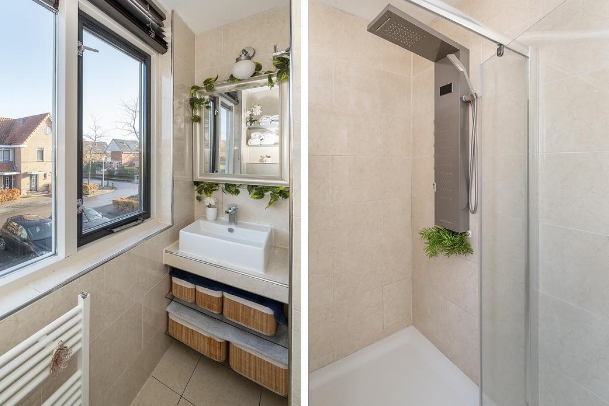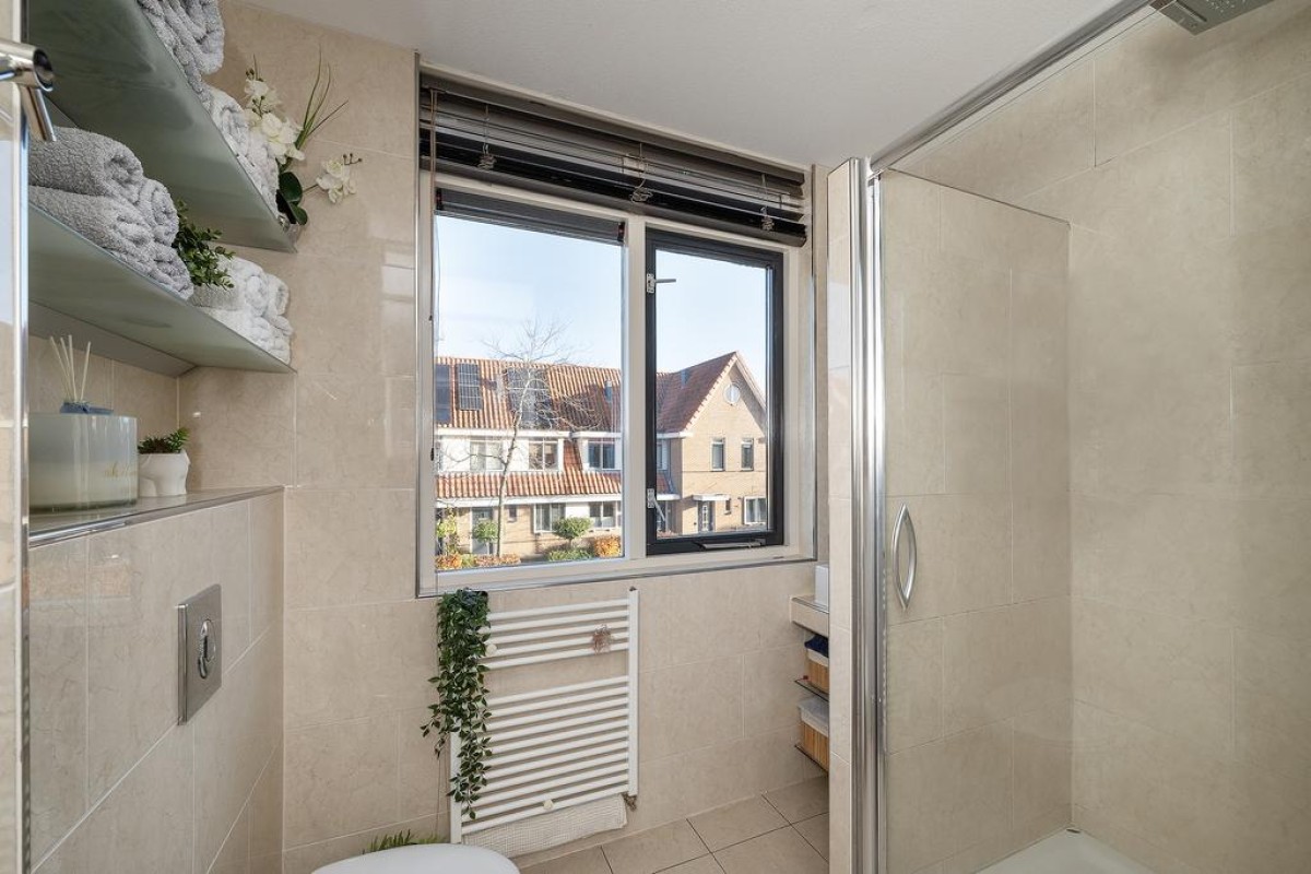 Overloop, 2 slaapkamers, waarvan de masterbedroom over de gehele breedte van de woning is gesitueerd. Er is ook een ruime inloopkast te vinden op de overloop. Deze verdieping is voorzien van een parketvloer. De badkamer heeft een douchehoek, tweede toilet en wastafel, handdoekradiator en handige plateaus voor het opbergen van bijvoorbeeld uw handdoeken. U kunt de badkamer extra ventileren doordat er een raam aanwezig is, wel zo prettig.