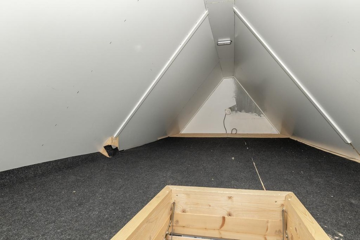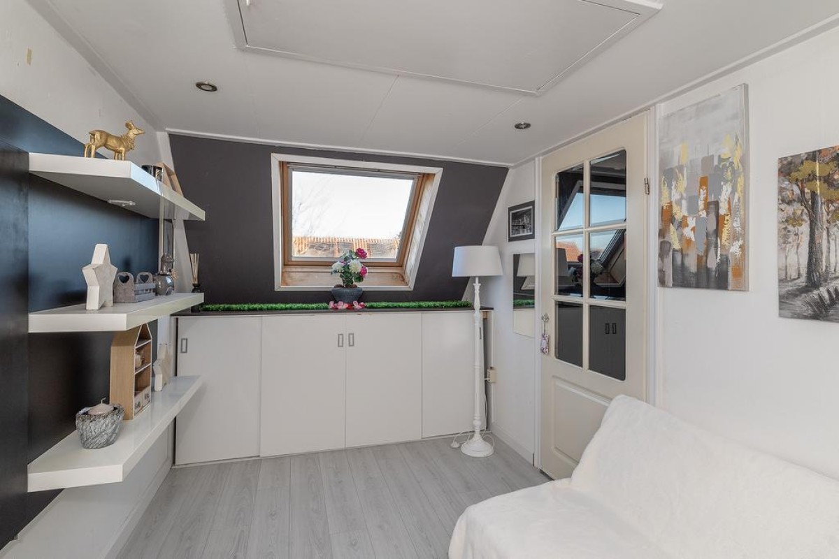 Overloop, met meteen rechts een inbouwkast. De CV en de mechanische ventilatie zijn hierin gesitueerd, net als de aansluitingen voor het witgoed. Op deze verdieping treft u nog eens twee slaapkamers, deze zijn beide voorzien van een dakraam. Via de vlizotrap kunt u de handige bergzolder bereiken.