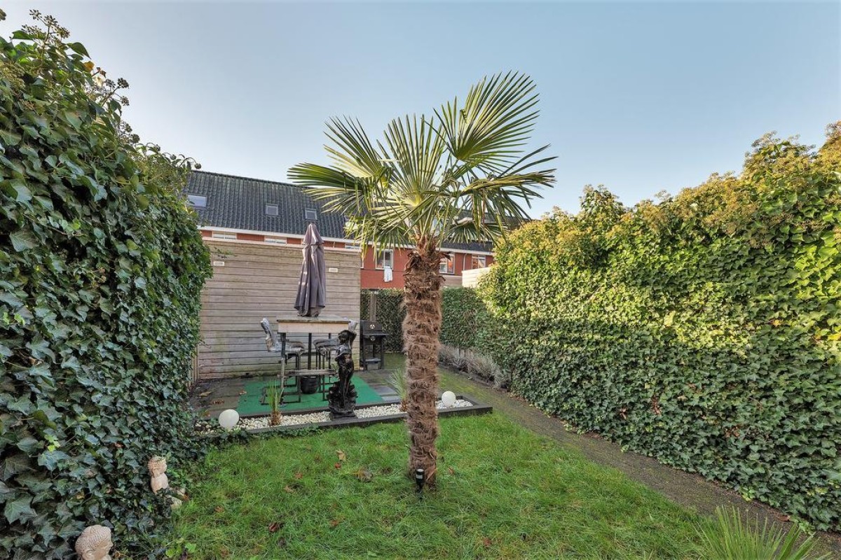 De diepe zonnige achtertuin is gelegen op het zuidwesten en beschikt over een ruime houtenberging en een achterom. Vanaf de overkapping kijkt u prachtig uit over de keurig aangelegde tuin. Aan de achtergevel is verder een prachtige serre gebouwd van aluminium.